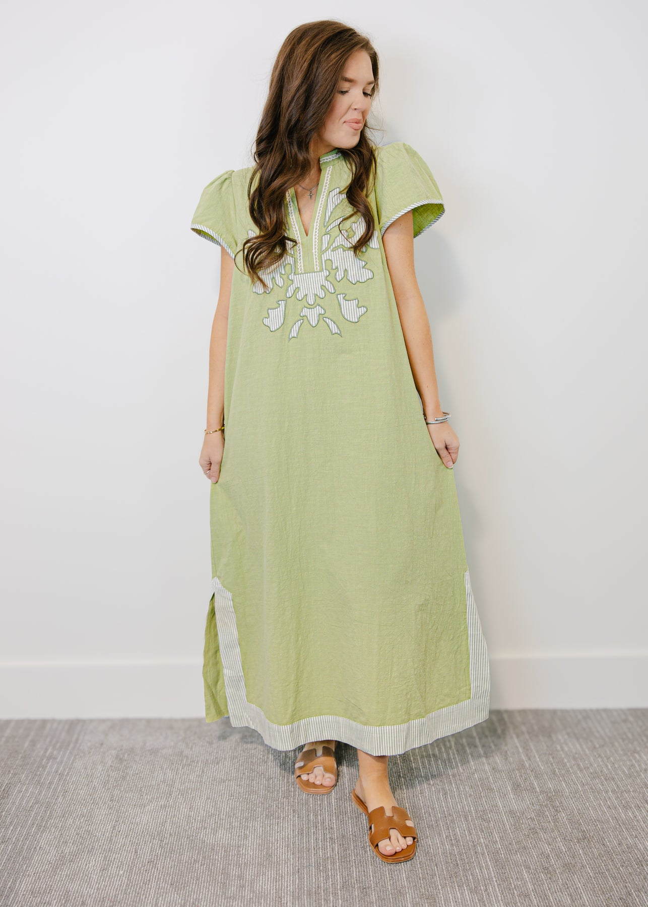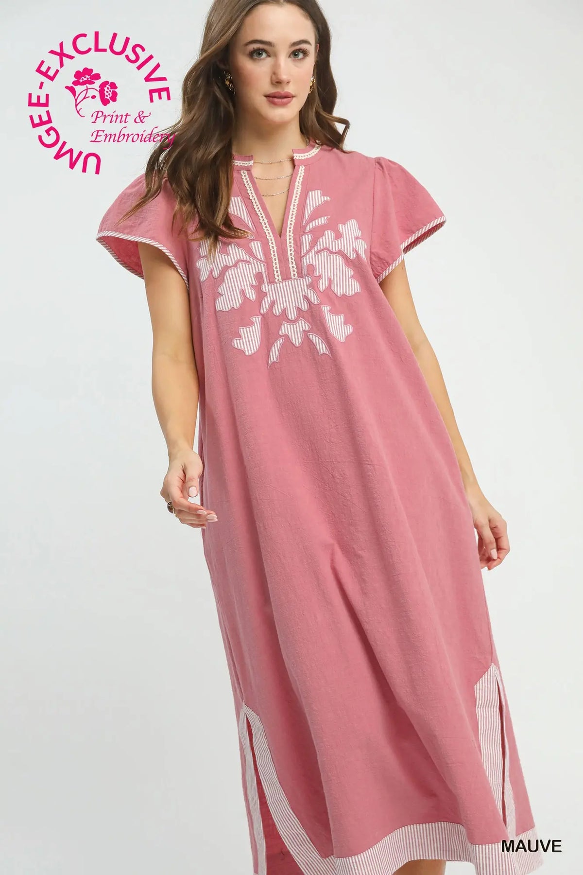 Regular price $ 68.00This embroidered V neck midi dress brings thoughtful detail to a clean, relaxed silhouette. The V neckline is framed with delicate embroidery that draws the eye upward and adds texture without overwhelming the look.