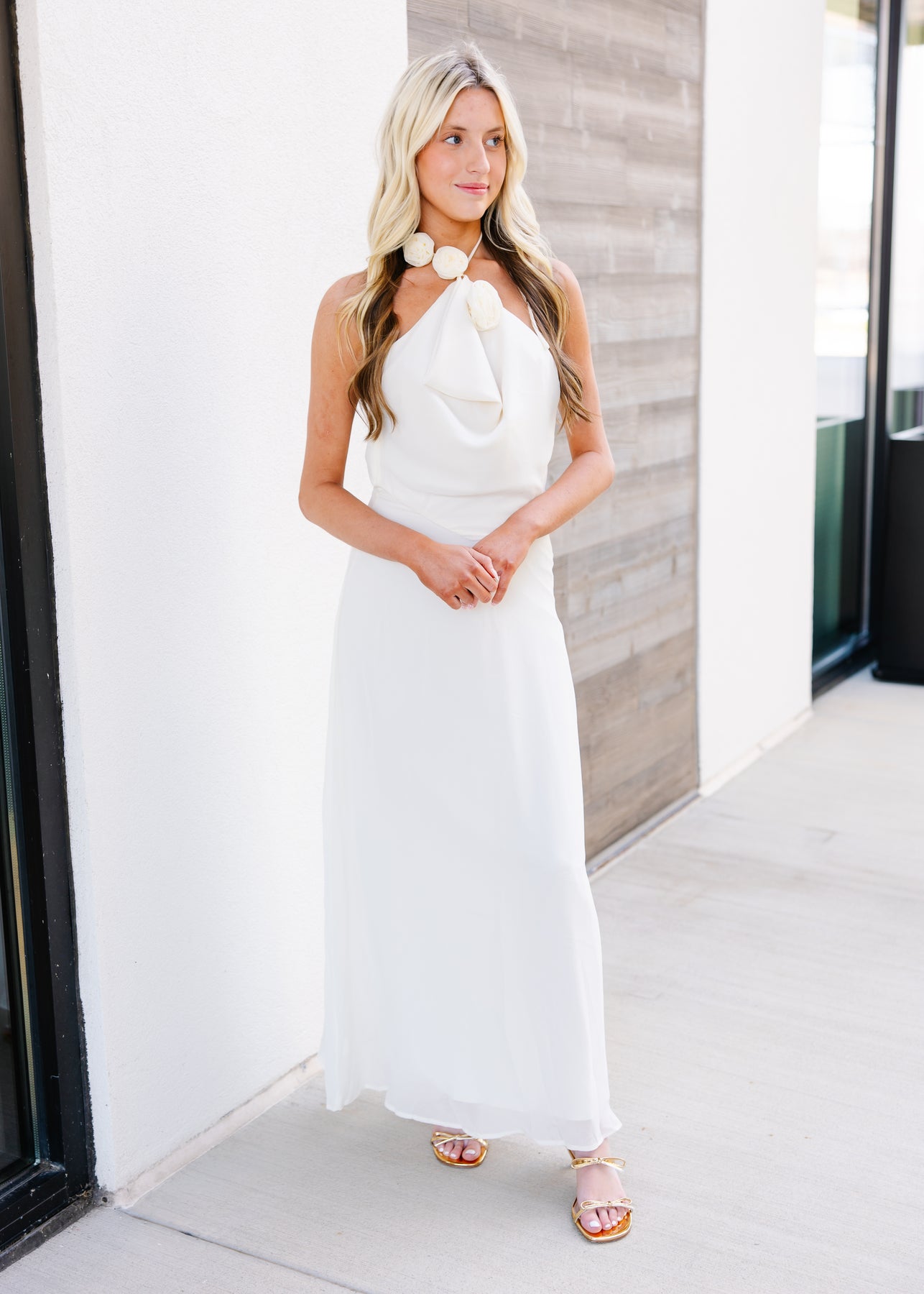 Regular price $ 86.00Refined and sculptural, the Floral Neck Halter Maxi Dress is a statement piece designed with modern elegance in mind. This halter style features a soft draped neckline accented by dimensional floral details at the collar, creating a striking focal point that feels artful and elevated. The fitted bodice flows into a long, fluid skirt that skims the body for a flattering, elongated silhouette. Clean lines and thoughtful construction make this dress ideal for formal events, weddings, or evening occasions where polished style is key. A standout design that feels confident, graceful, and effortlessly memorable.