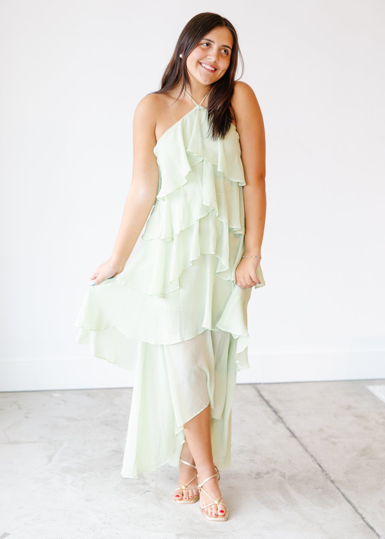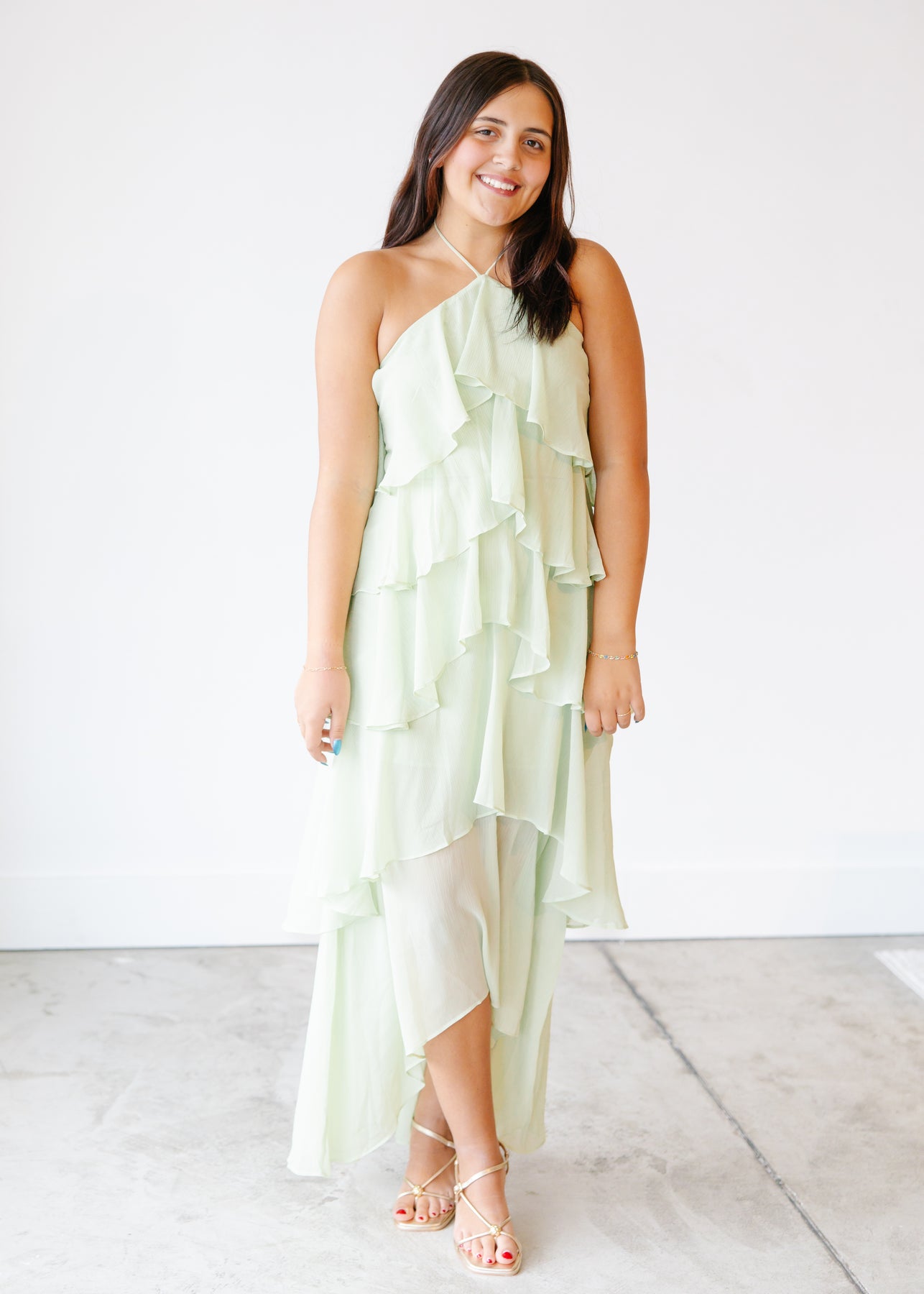 Graceful and eye catching, the Tiered Ruffle Halter Maxi Dress is designed for moments that call for flowing movement and soft drama. This halter style features cascading layers of airy ruffles that create beautiful dimension from top to hem. The high neckline draws attention upward, while the loose, fluid silhouette drapes effortlessly for a flattering and comfortable fit. Perfect for weddings, evening events, or special occasions, this maxi dress delivers a romantic presence with lightweight elegance and a silhouette that feels striking yet easy to wear.