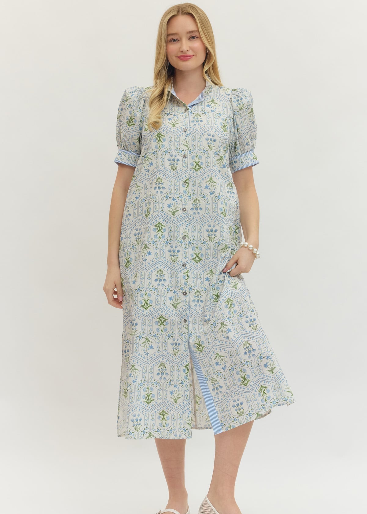 This midi dress blends soft structure with everyday wearability. The button front design adds a classic touch, while the puff sleeves bring subtle volume that elevates the overall look. Designed with a relaxed fit through the body, it moves comfortably and layers easily from season to season. The midi length makes it versatile enough for casual days, work settings, or dressed up with the right accessories. A polished yet easy piece you will keep reaching for when you want something that feels put together without trying too hard.