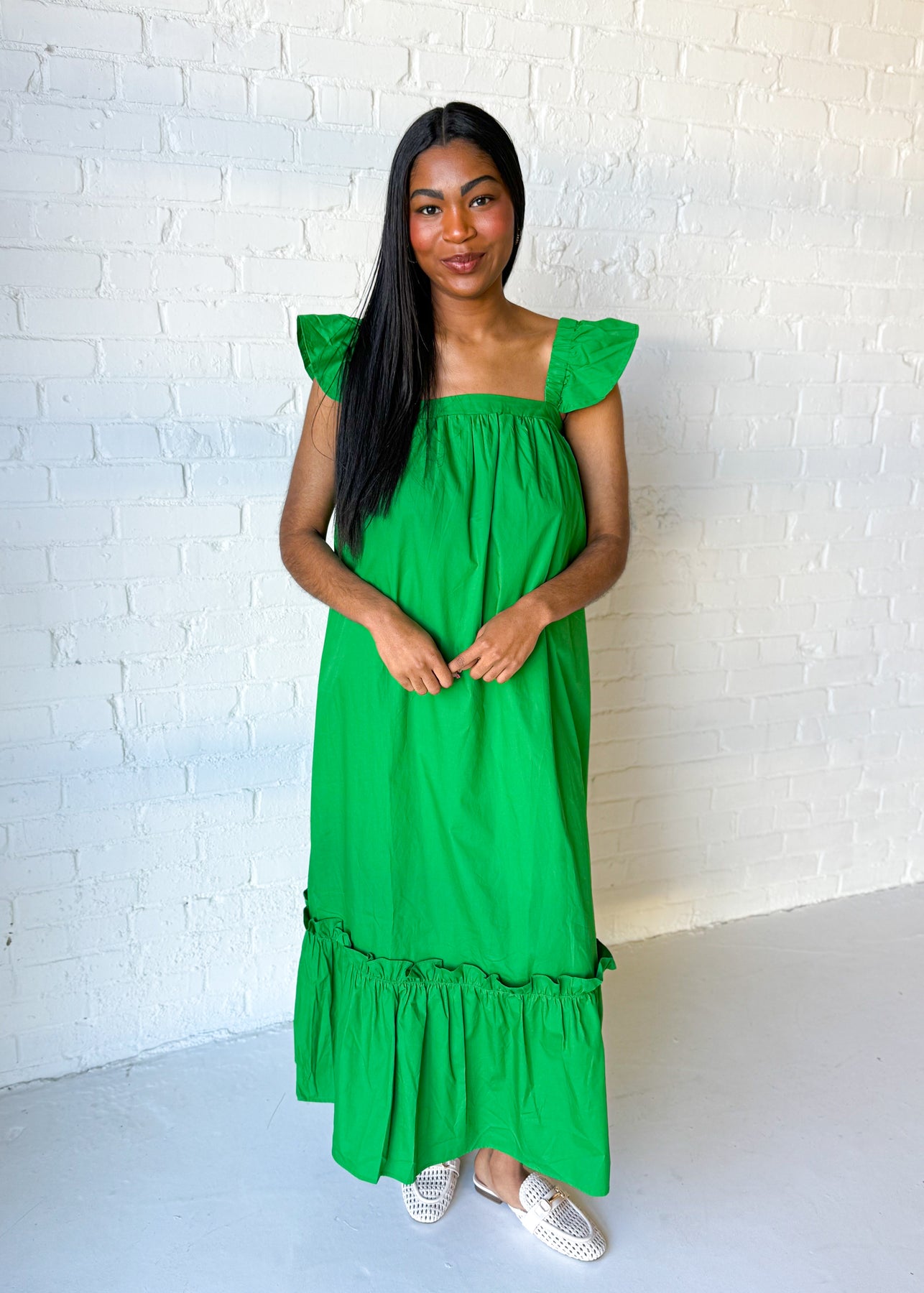This midi dress features a relaxed, flowy silhouette designed with a square neckline and soft ruffled cap sleeves. The easy drape through the body creates comfortable movement, while the ruffled hem adds a subtle, playful finish. Its longer length makes it versatile enough for casual outings or more dressed up occasions. Style it with sandals for daytime plans or heels for an elevated look that still feels light and wearable.