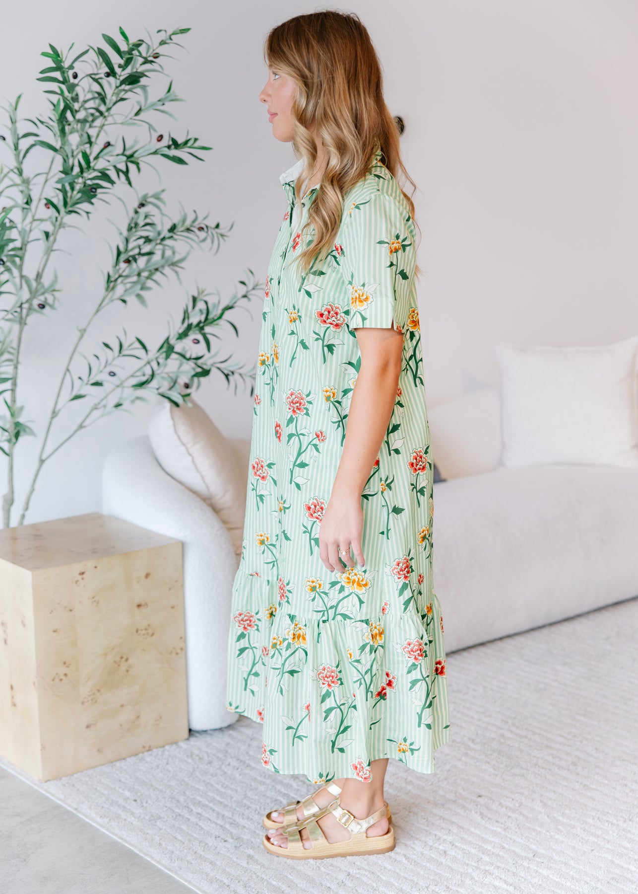 This midi dress features a relaxed silhouette with short sleeves and an allover floral print. The easy fit creates comfortable movement while keeping the look simple and wearable. Designed with a clean neckline and an unfussy shape, it’s a versatile option that works well for casual days, errands, or laid back gatherings. Style it with flats, sandals, or sneakers for an outfit that feels effortless and ready to go.