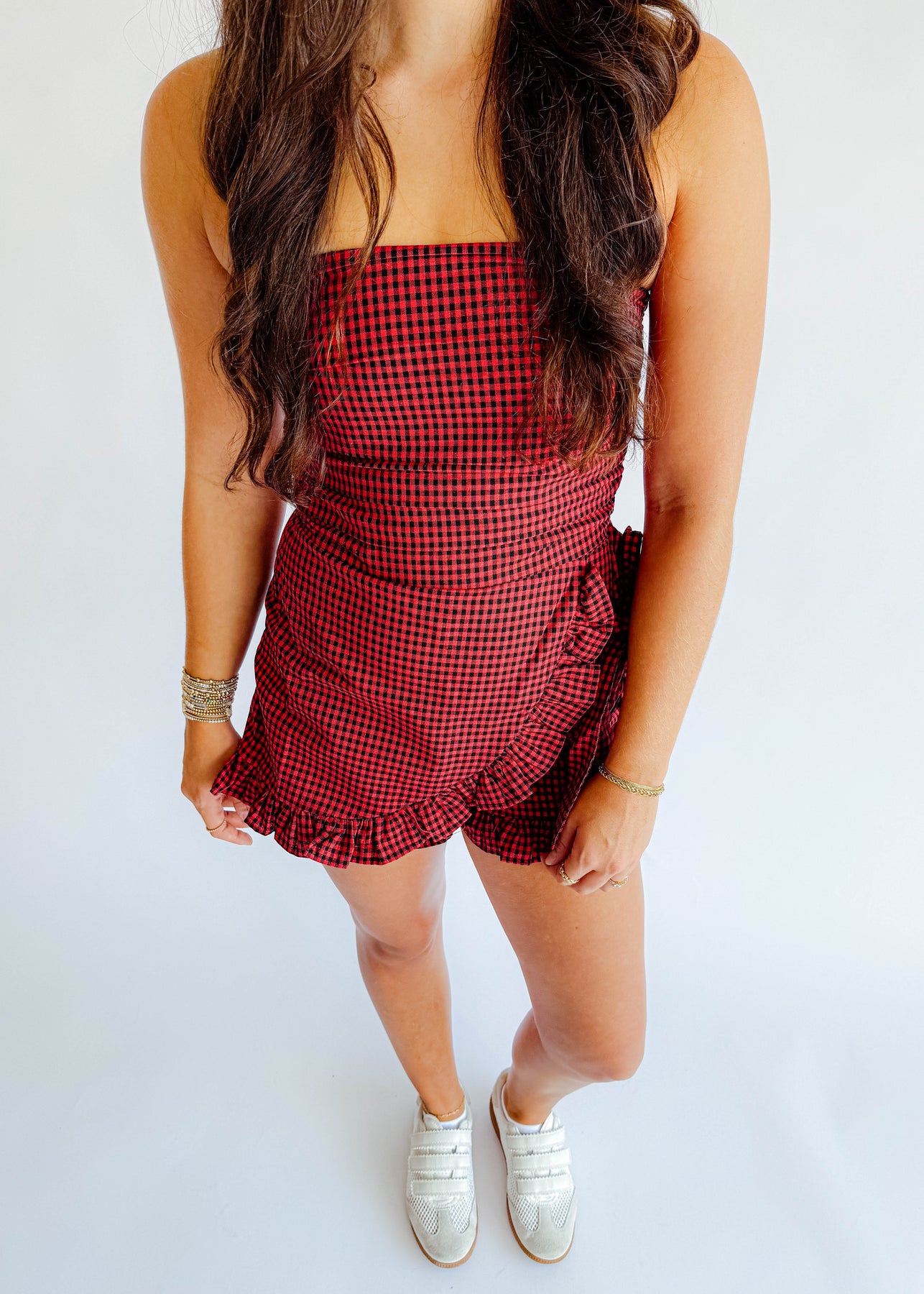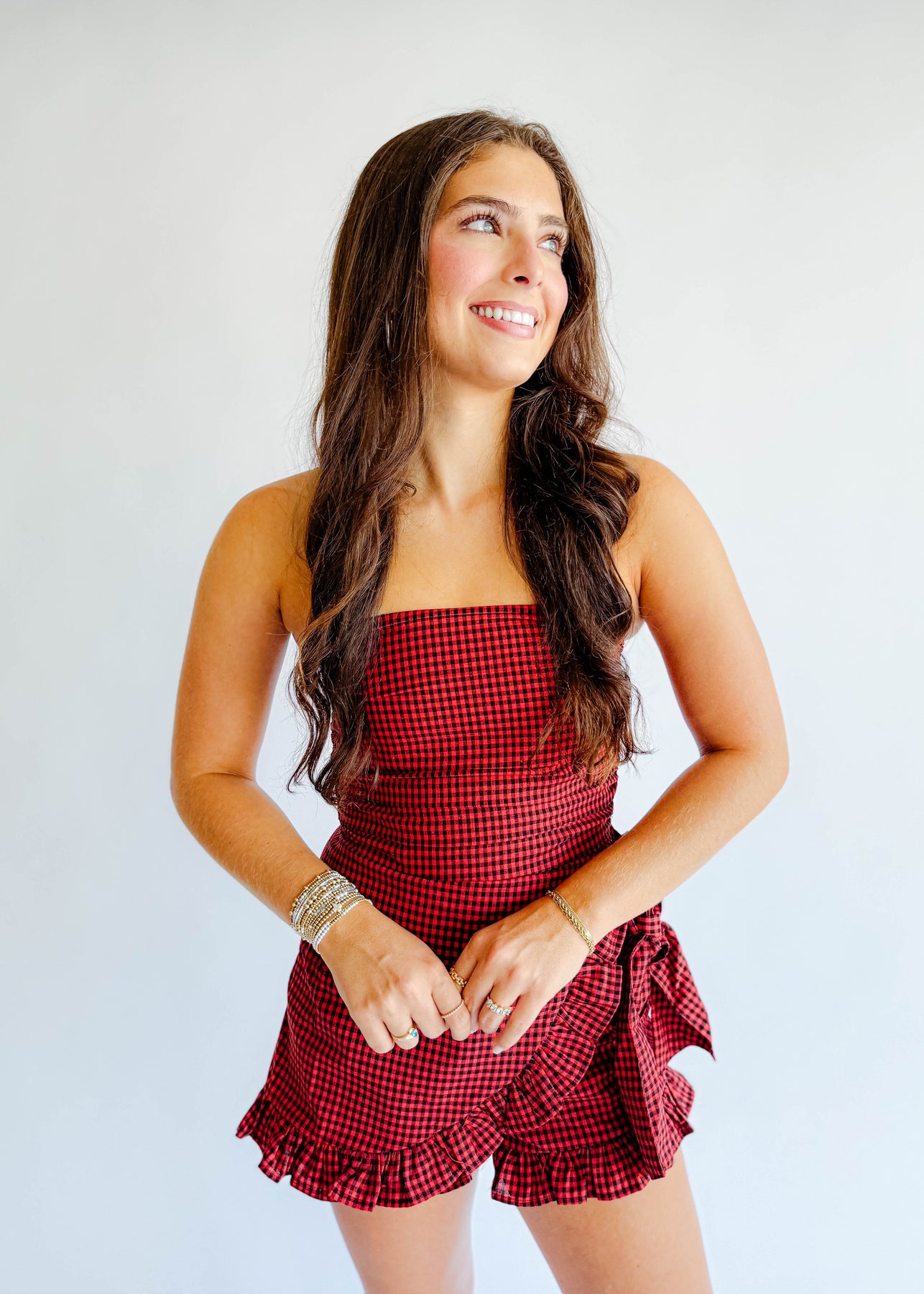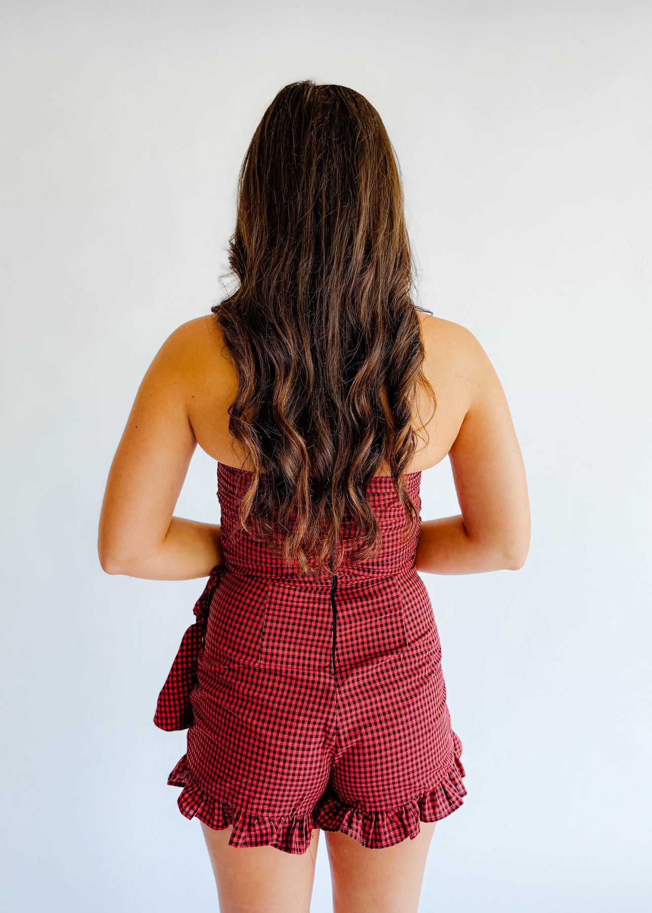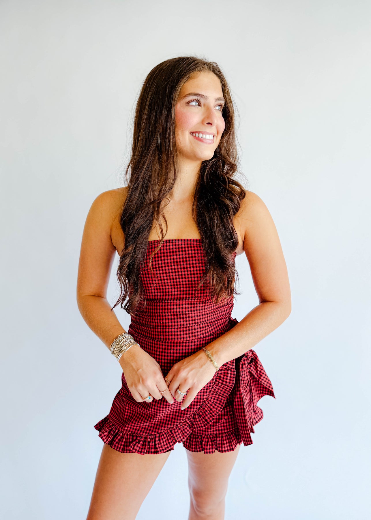 Turn heads with the Ruby Gingham Ruffle Romper, a playful and flirty piece perfect for any occasion. This strapless romper features a classic red and black gingham pattern, a flattering fitted bodice, and a charming wrap-style front adorned with ruffle trim. The side tie detail adds a touch of feminine flair, while the ruffled hem creates movement and a fun, youthful vibe.
