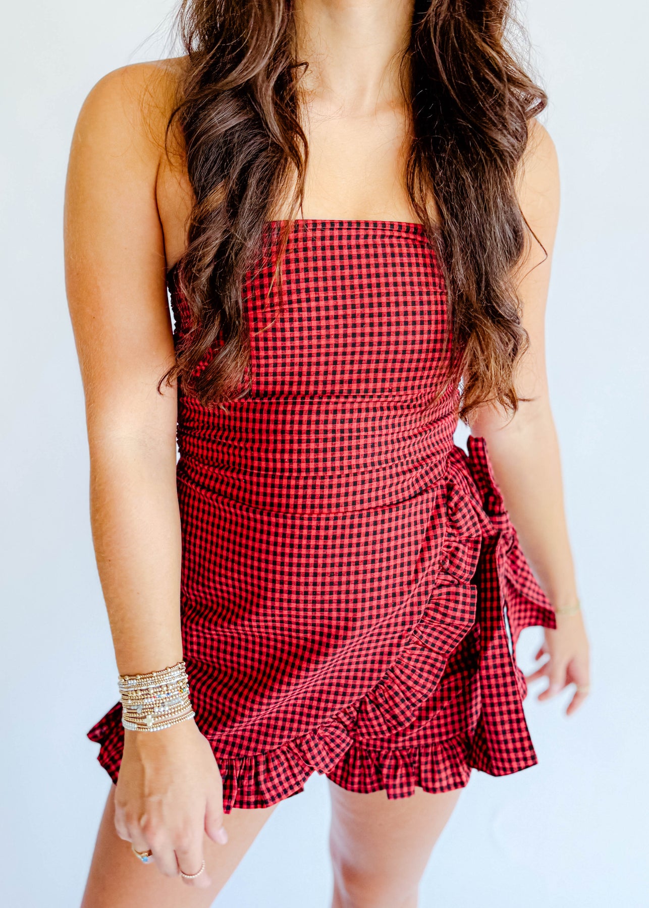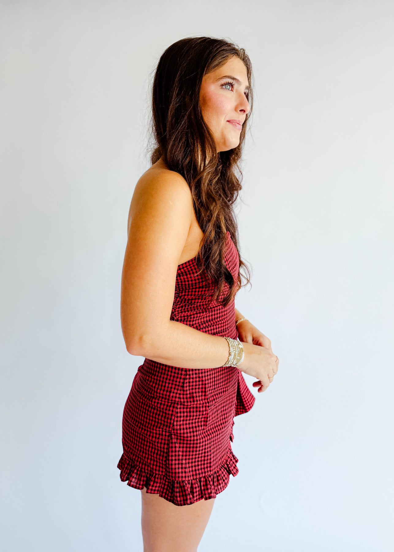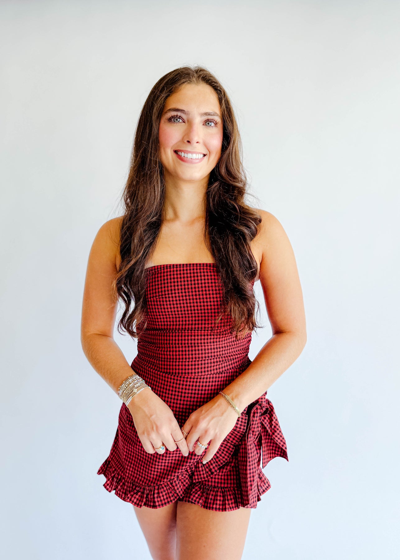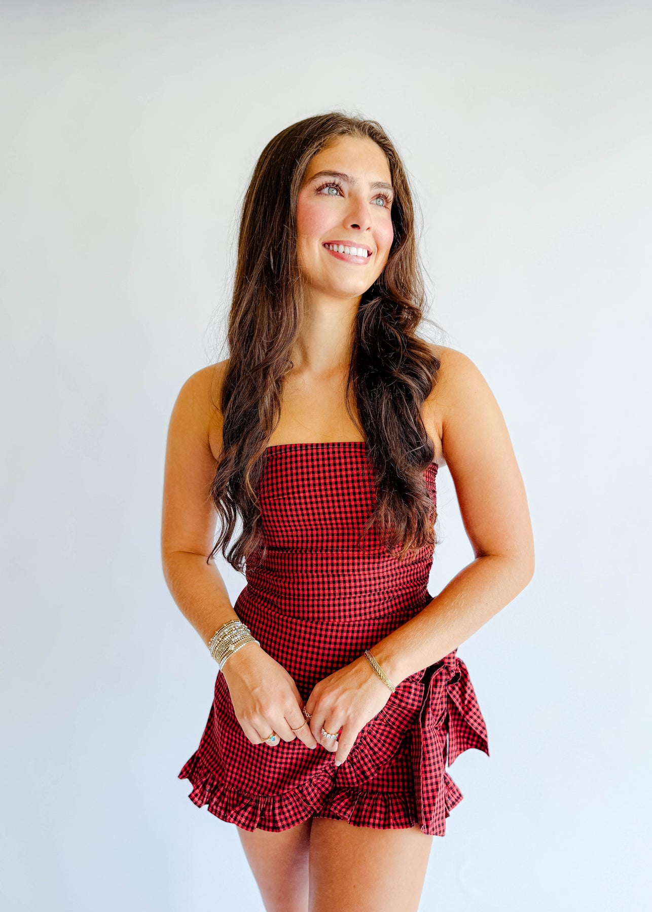Turn heads with the Ruby Gingham Ruffle Romper, a playful and flirty piece perfect for any occasion. This strapless romper features a classic red and black gingham pattern, a flattering fitted bodice, and a charming wrap-style front adorned with ruffle trim. The side tie detail adds a touch of feminine flair, while the ruffled hem creates movement and a fun, youthful vibe.