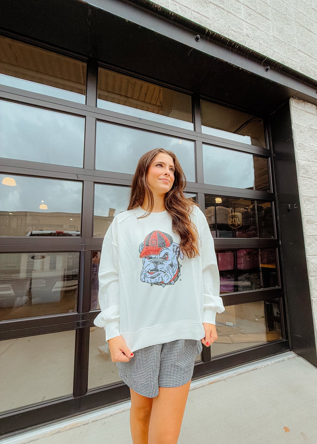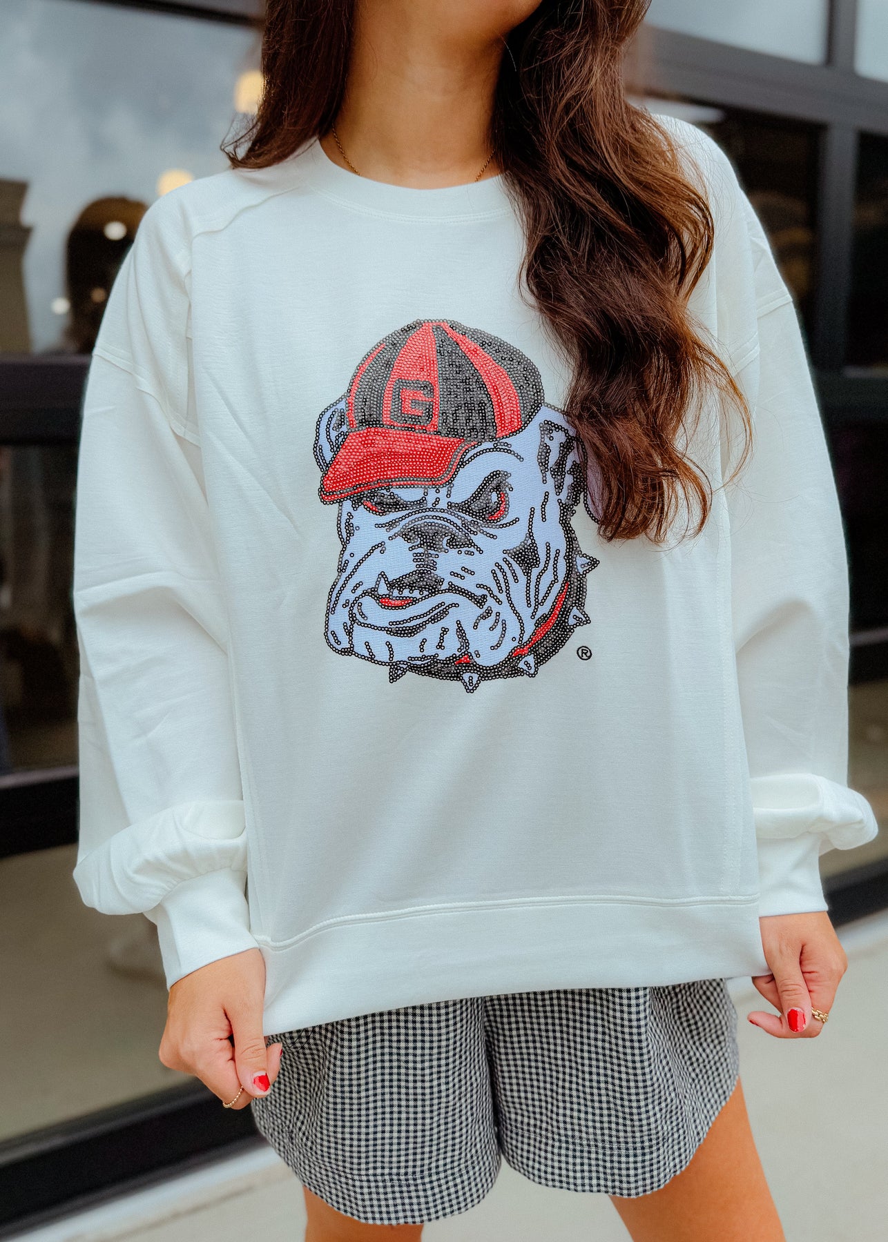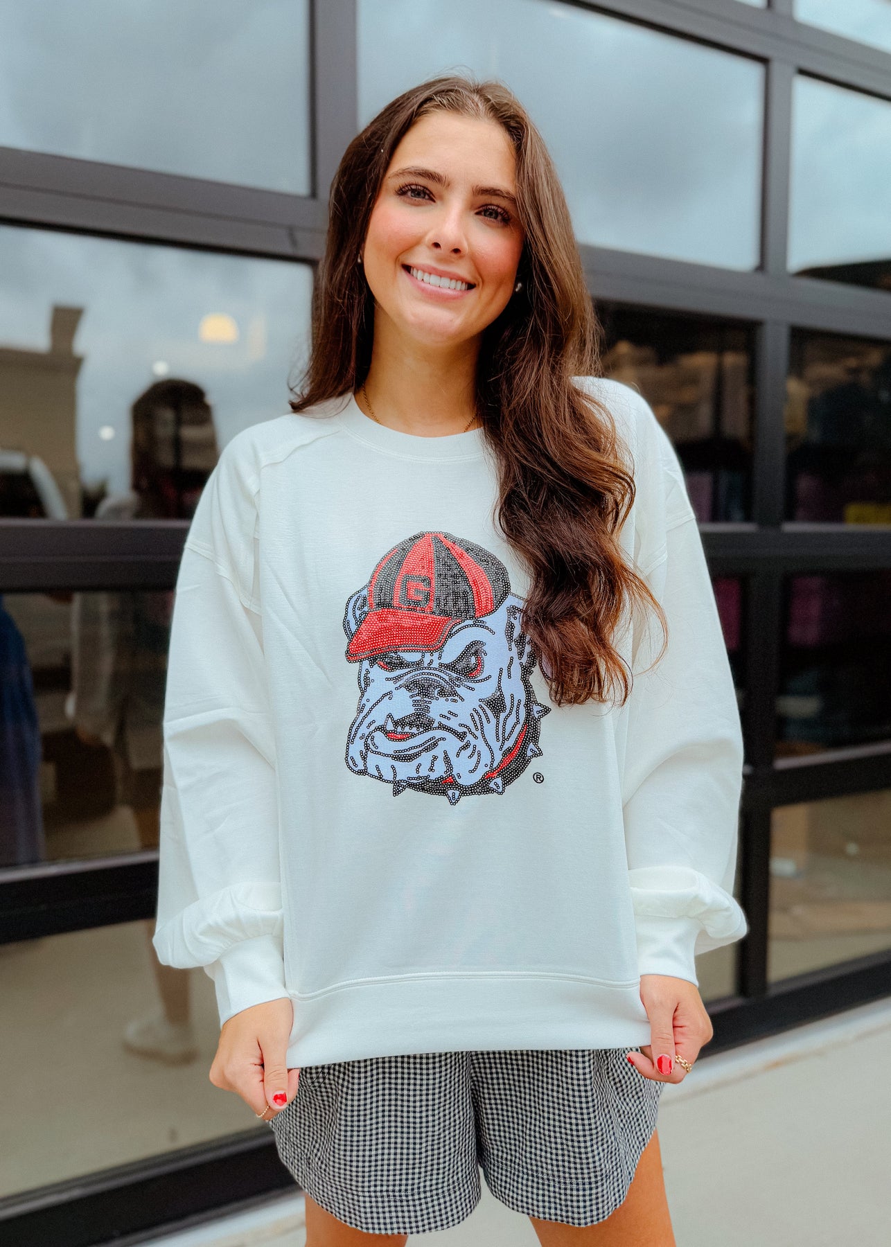 The Delaney Sequin Varsity UGA Sweatshirt is where comfort meets sparkle. Featuring the iconic Bulldog mascot brought to life with shimmering sequins, this sweatshirt is designed for game day energy and everyday wear. The relaxed cut and soft fabric make it cozy, while the sequin detailing adds just the right amount of shine to your team spirit.