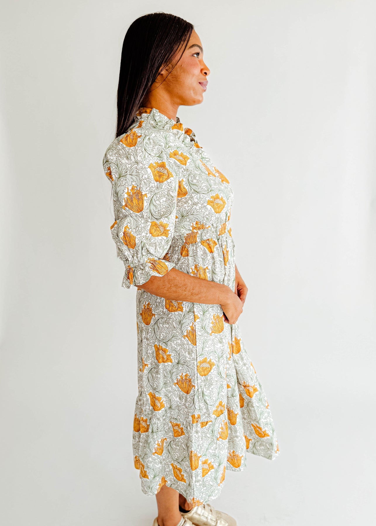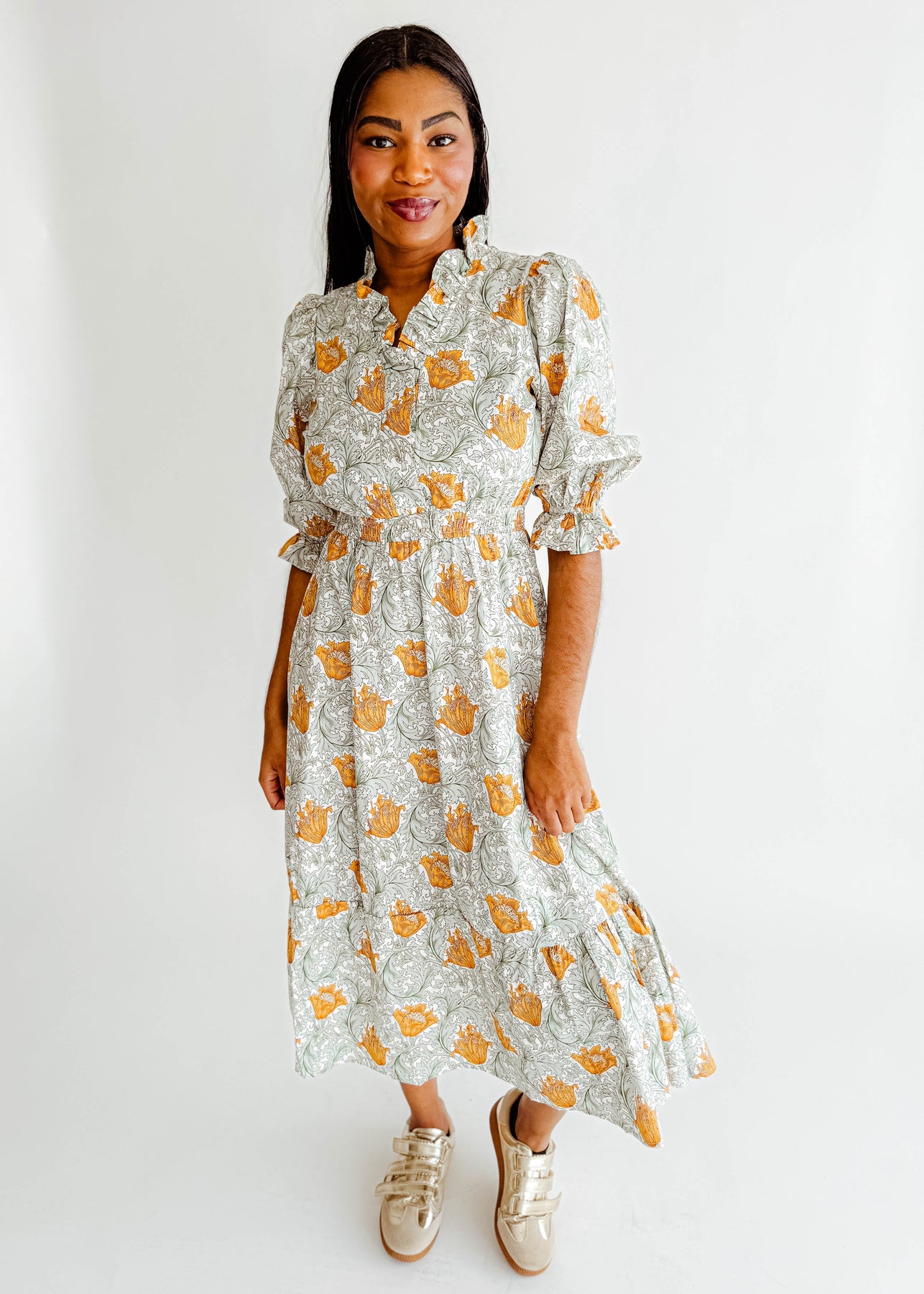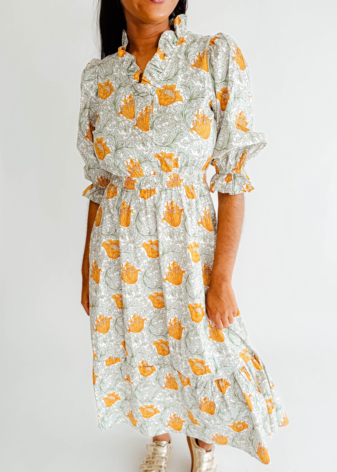 This timeless midi dress features a charming ruffle collar that adds a soft, feminine touch to its silhouette. Designed with a button-front bodice, gently puffed sleeves, and a flattering elasticized waist, it flows into a graceful skirt for an effortlessly polished look. Perfect for brunches, garden parties, or casual gatherings, this piece brings vintage-inspired elegance to any occasion.