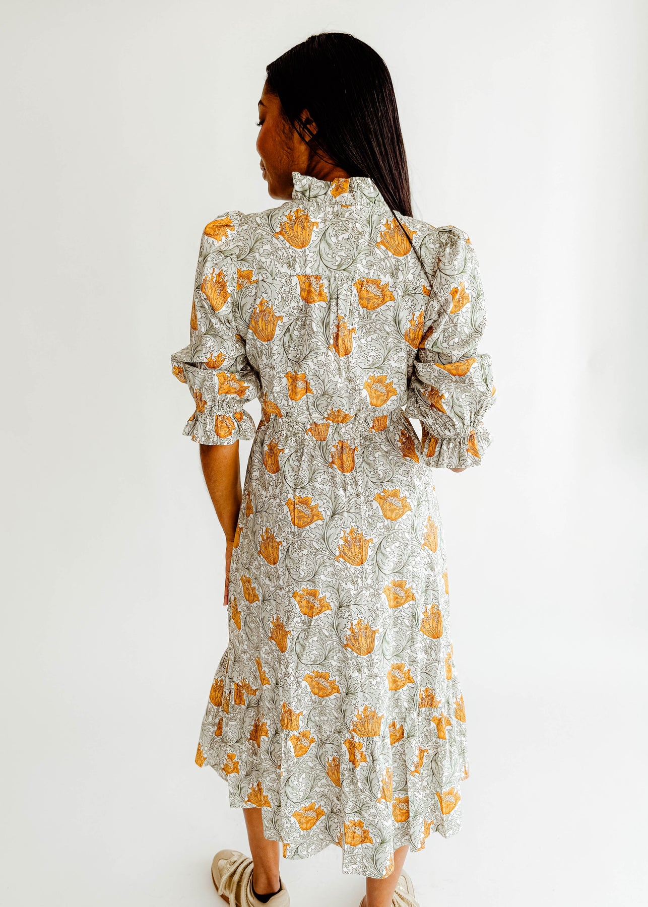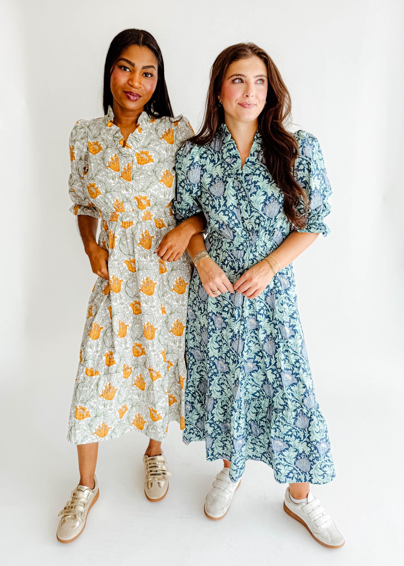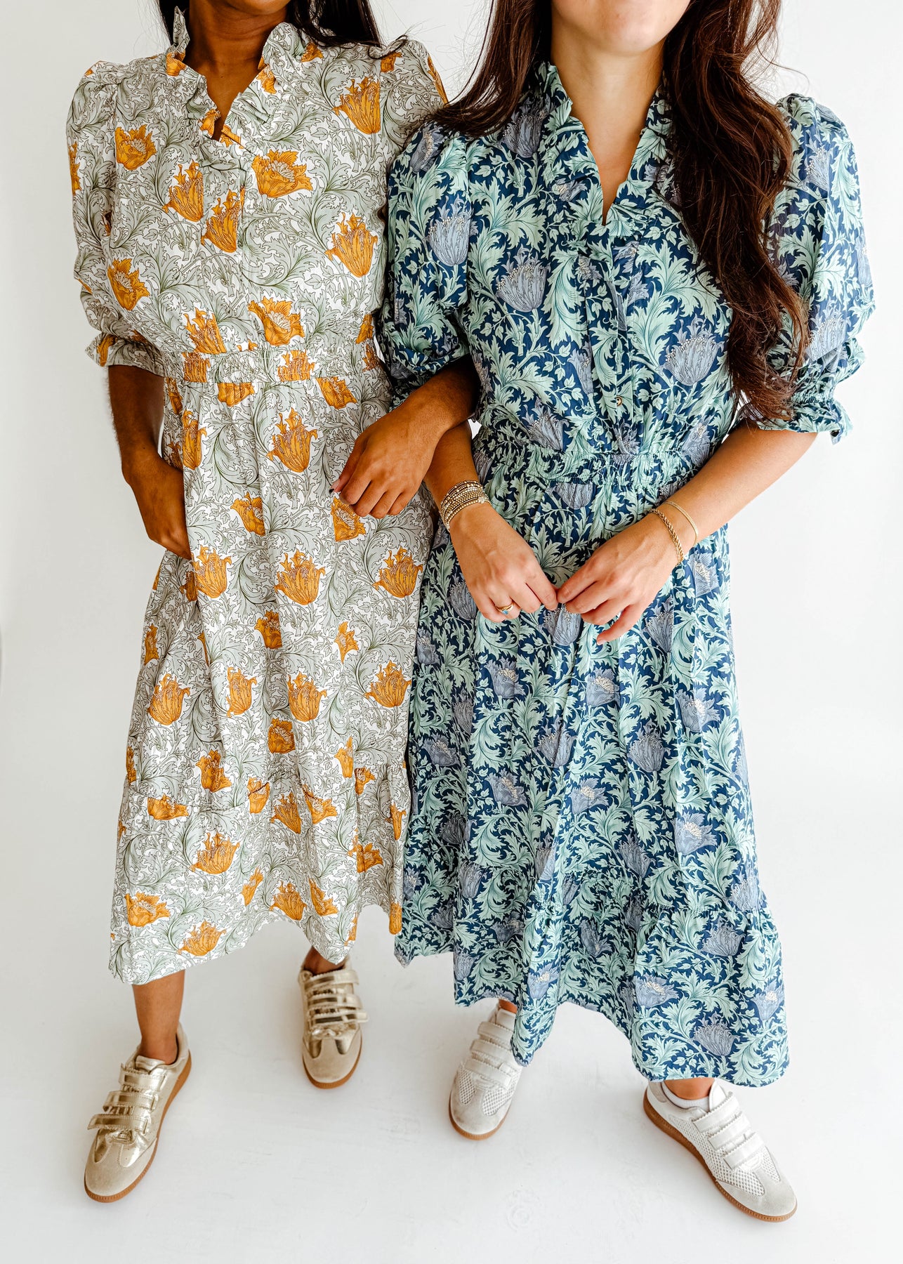 This timeless midi dress features a charming ruffle collar that adds a soft, feminine touch to its silhouette. Designed with a button-front bodice, gently puffed sleeves, and a flattering elasticized waist, it flows into a graceful skirt for an effortlessly polished look. Perfect for brunches, garden parties, or casual gatherings, this piece brings vintage-inspired elegance to any occasion.