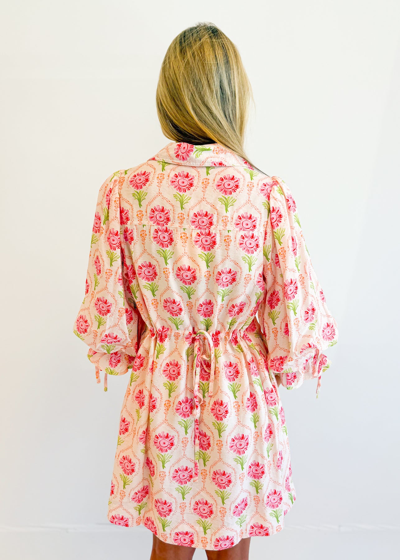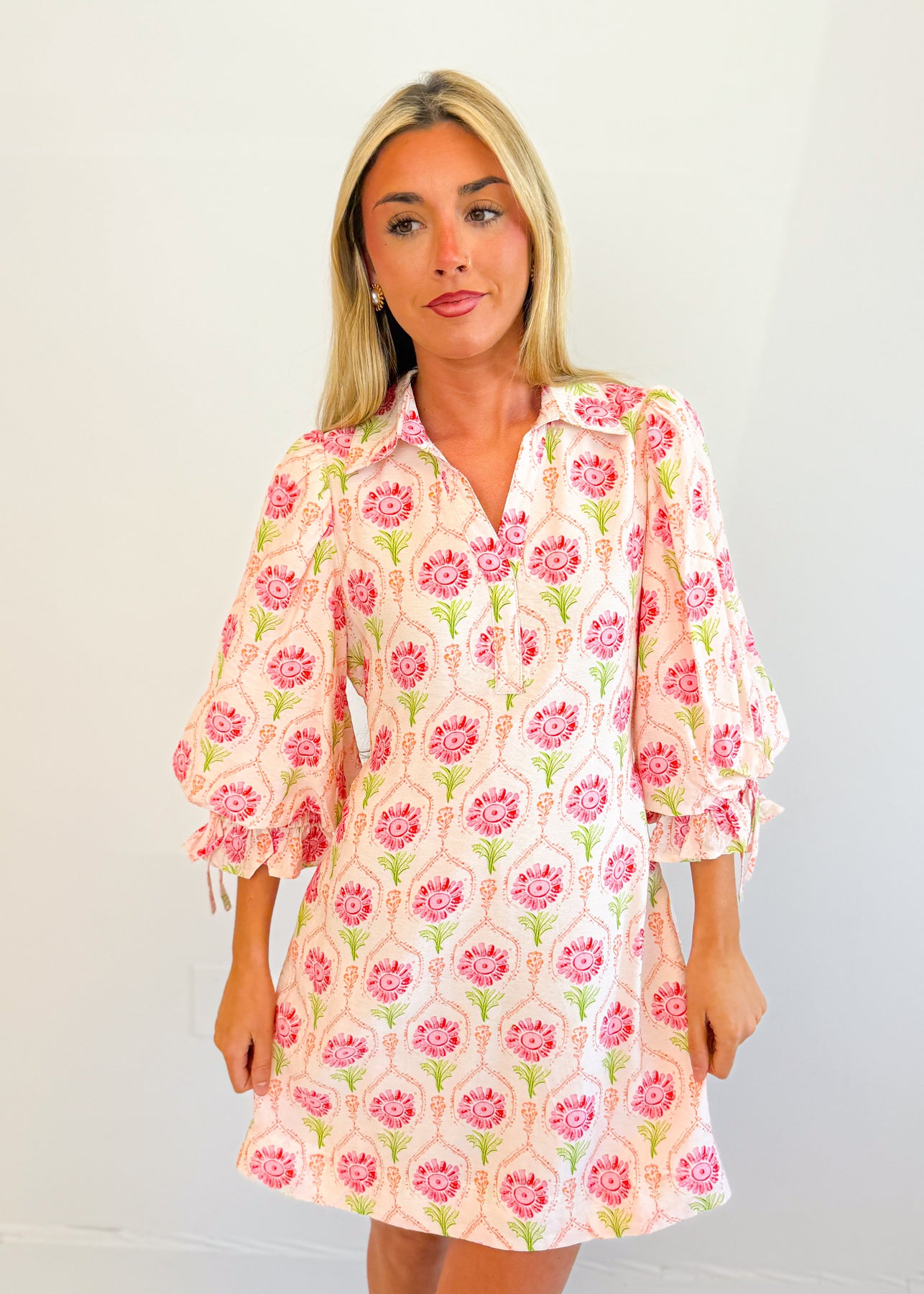 This mini dress features an easy, relaxed silhouette with 3/4 length sleeves for a balanced and comfortable fit. The allover print adds visual interest while keeping the look playful and wearable. A loose, swing-style body allows for effortless movement, making it an ideal option for warm days or casual outings. The length hits above the knee, giving it a fresh and versatile feel that pairs well with sandals, flats, or sneakers for everyday styling.