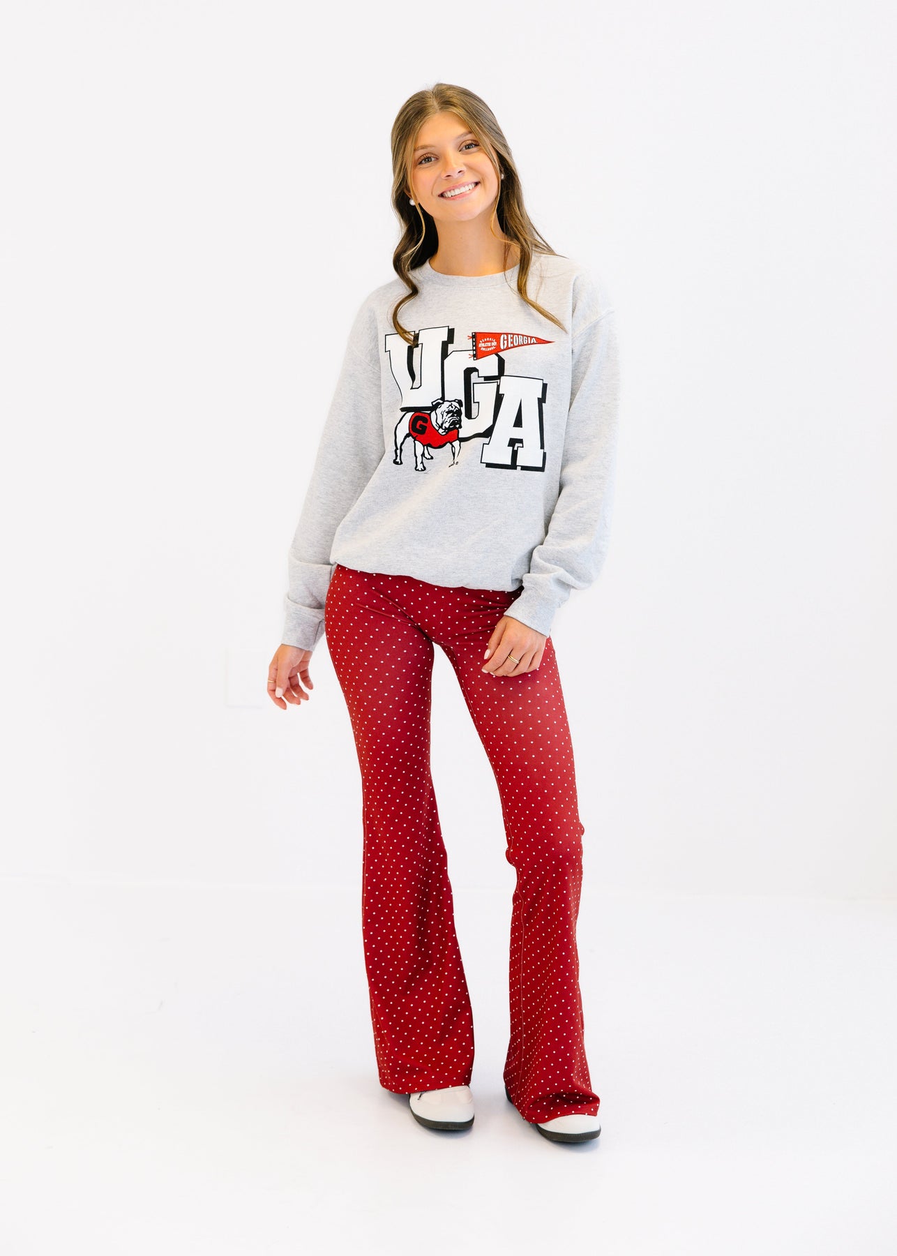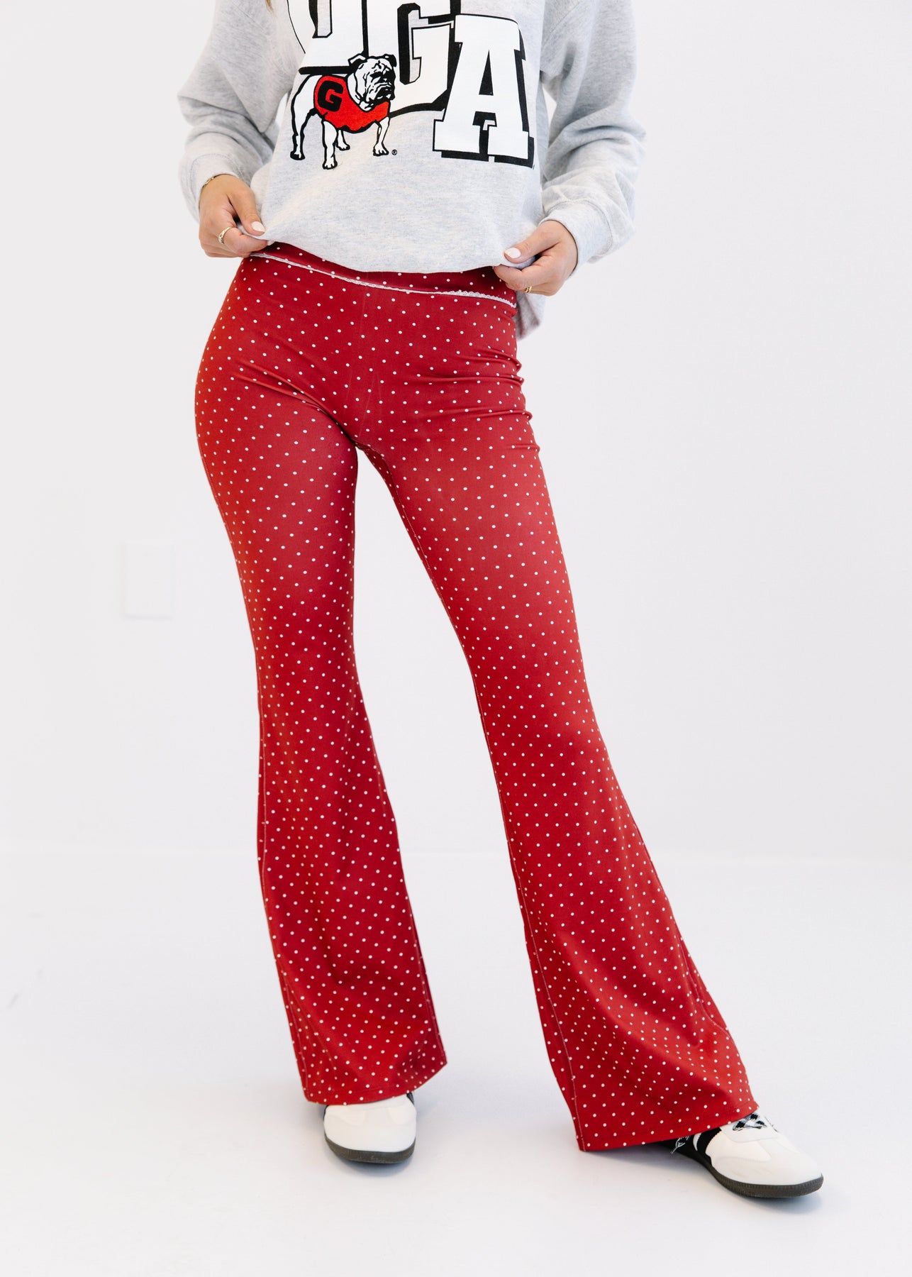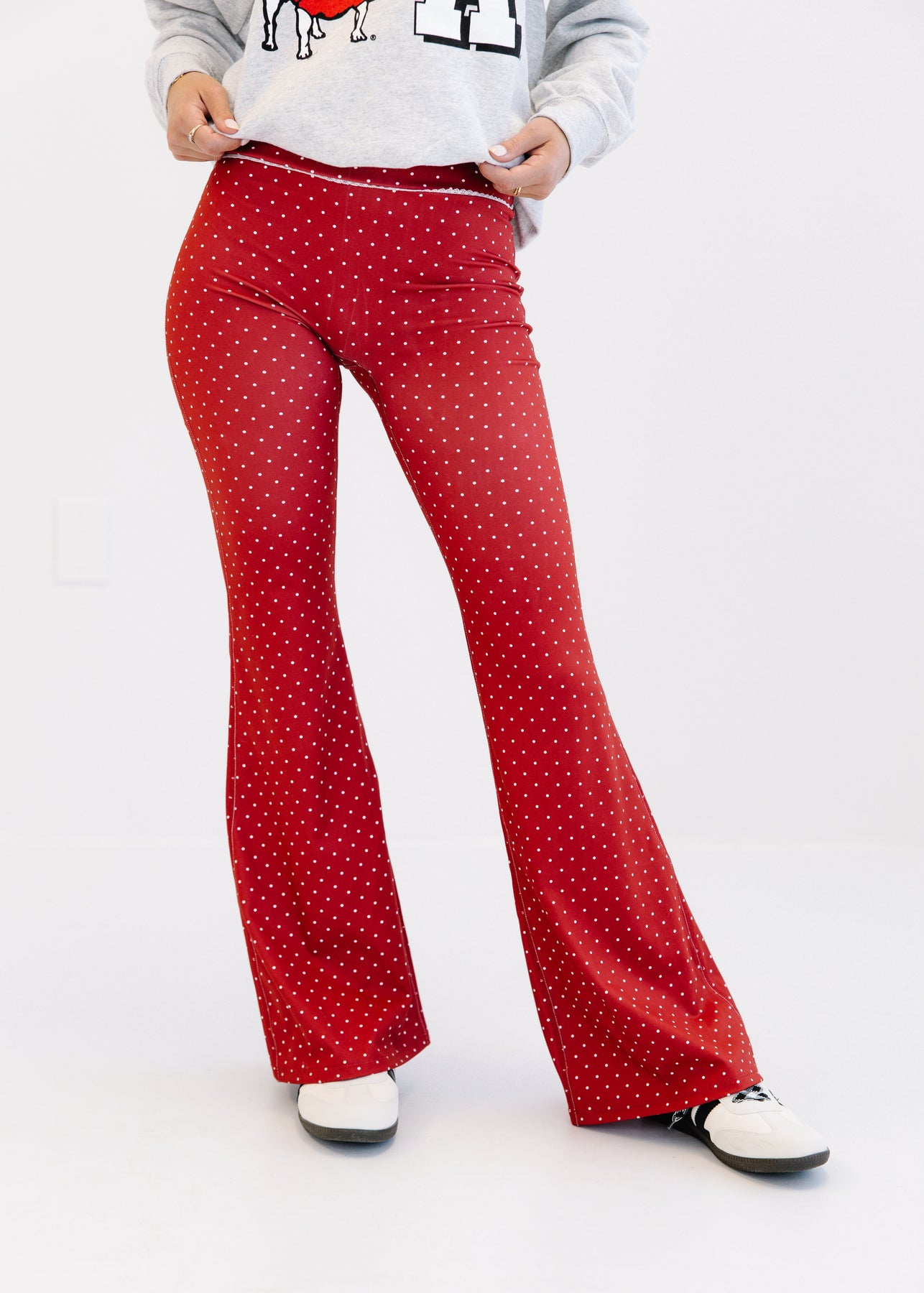 The Demi Polka Dot Flare Pants bring retro charm into the present day with their playful print and flattering fit. Cut in a bold red hue with tiny white polka dots, these pants are designed with a high-rise waistband that smooths and supports. The flared leg adds a touch of vintage-inspired movement, perfect for pairing with sneakers, boots, or heels depending on the occasion. Whether worn with the matching top or styled with a simple tee, these pants are all about comfort and standout style.