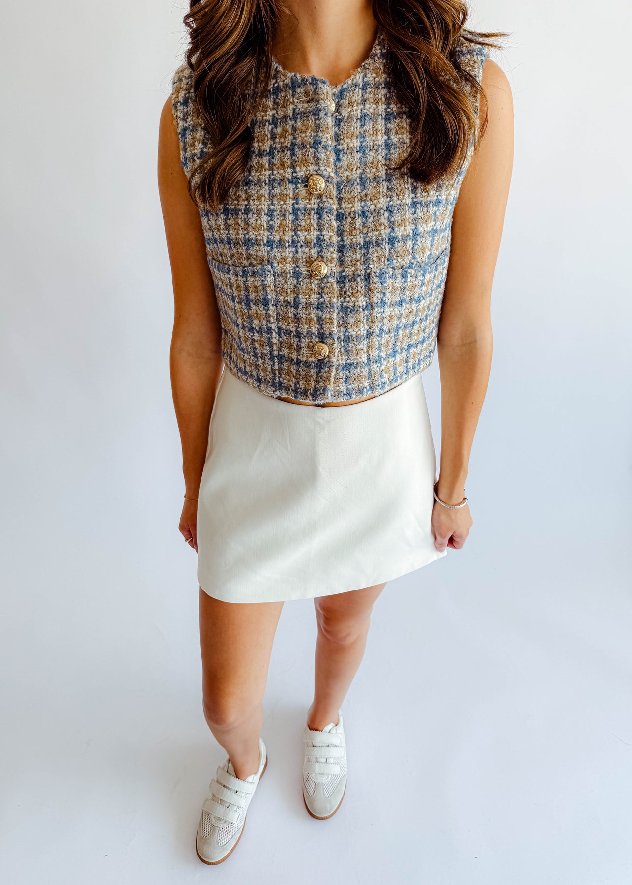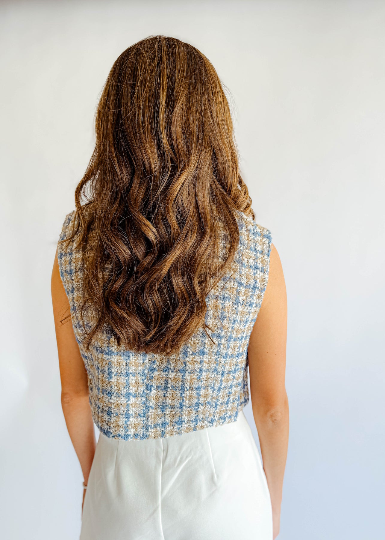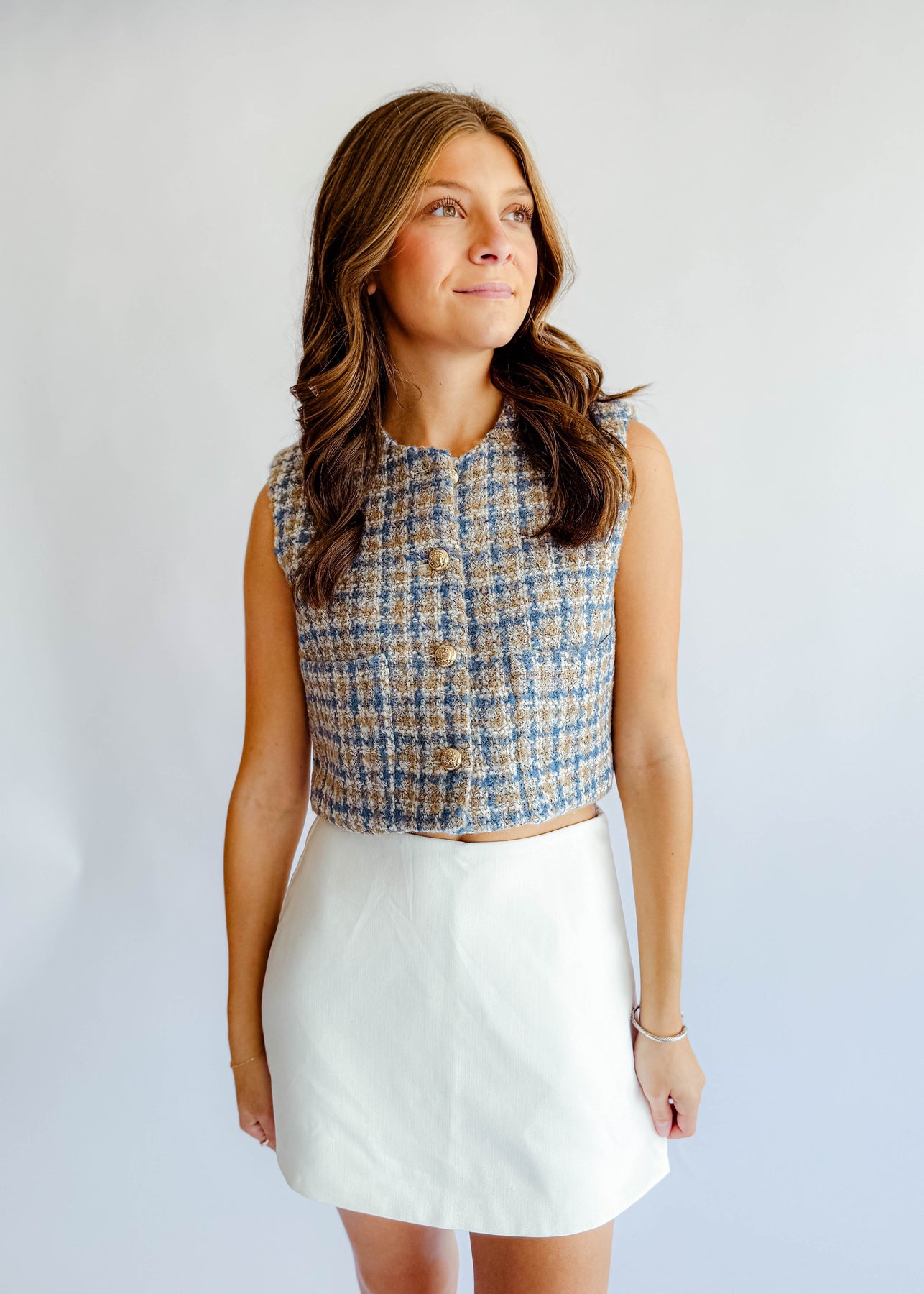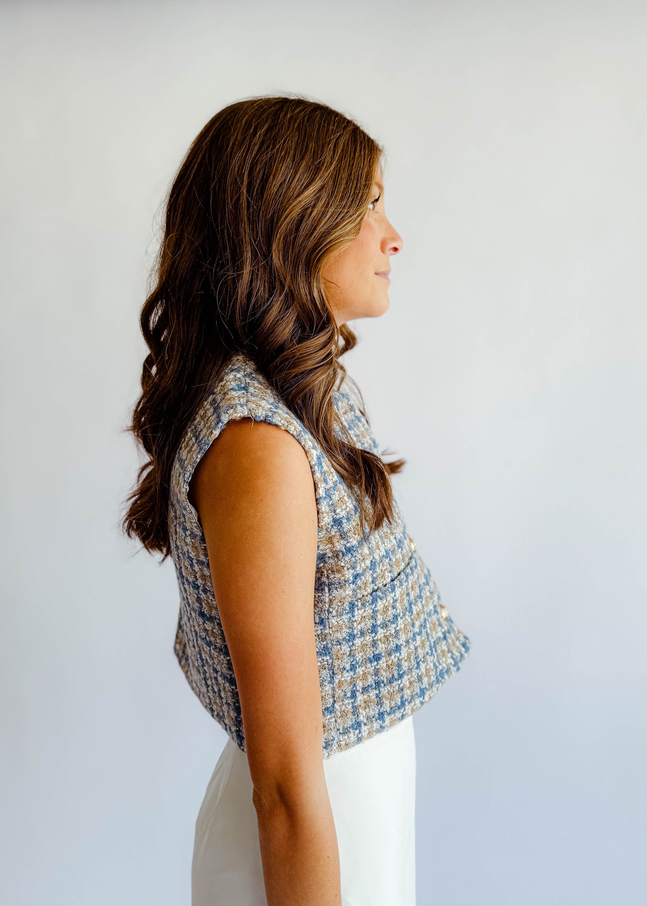 The Margot Tweed Button-Up Vest is timeless with a tailored twist. Crafted in a classic textured weave and finished with statement buttons, it brings a touch of vintage sophistication to your modern wardrobe. The cropped silhouette pairs effortlessly with high-waisted bottoms, offering structure without feeling too formal. Margot is your go-to layering piece when you want to look polished but never predictable.