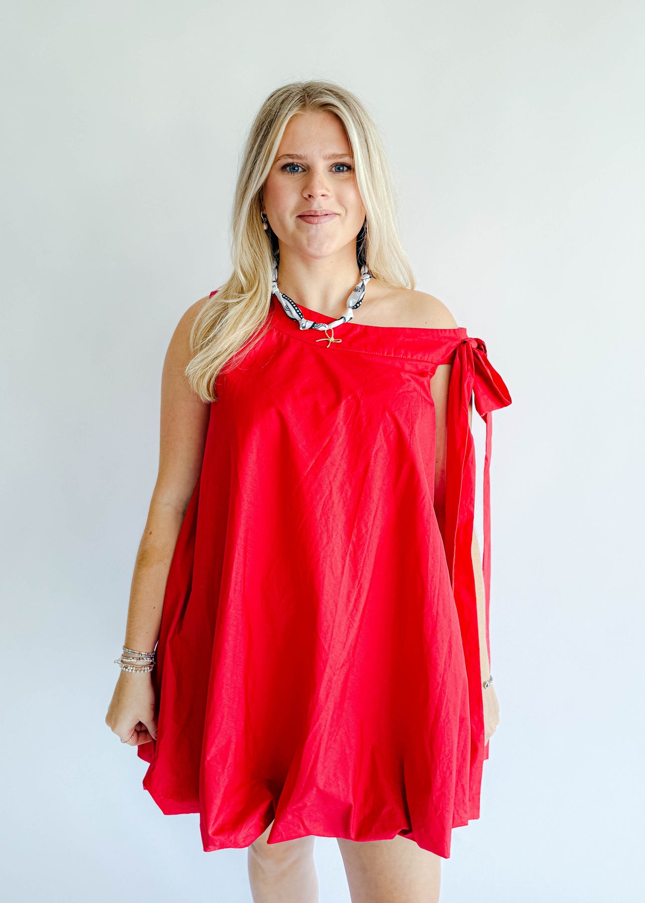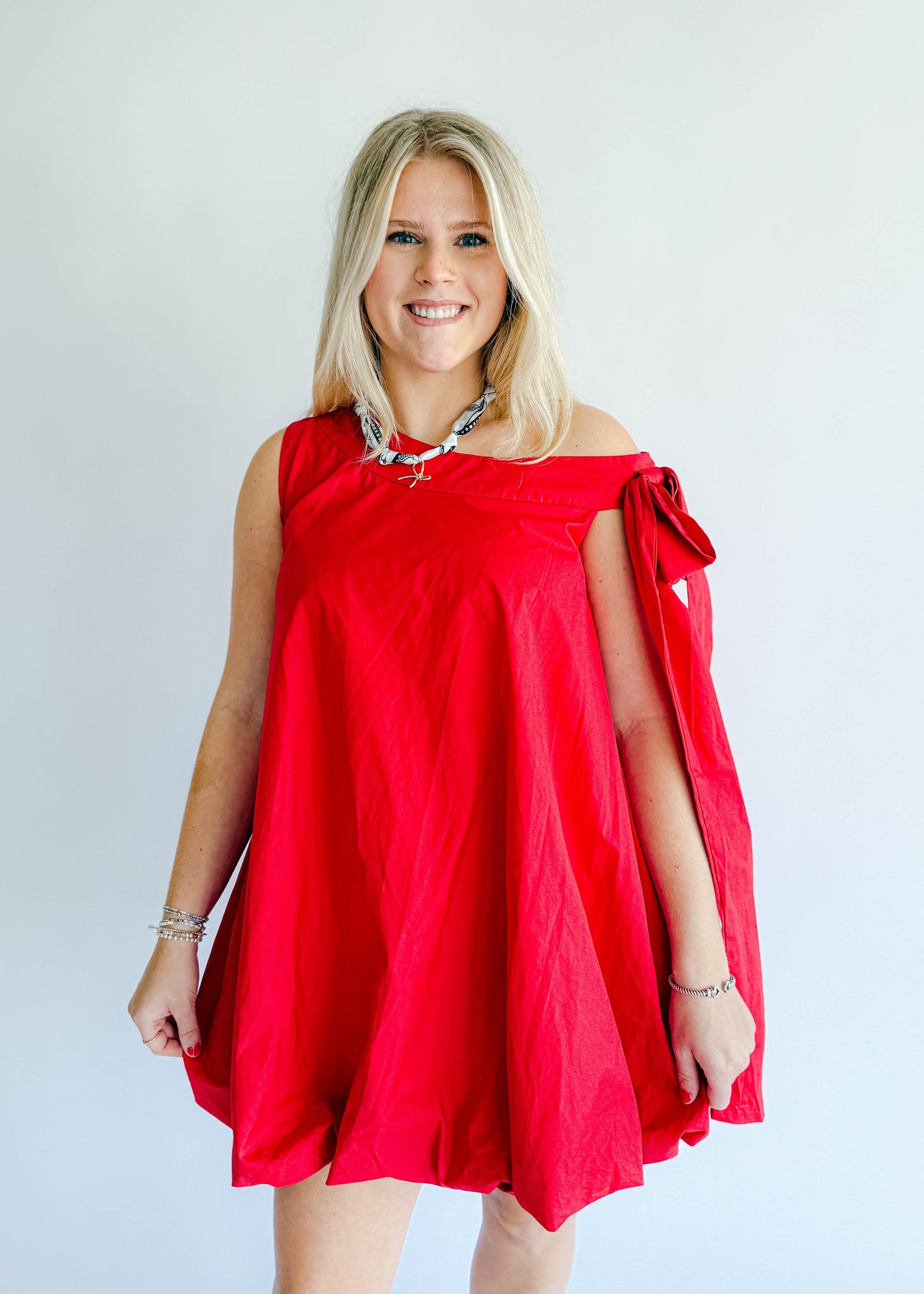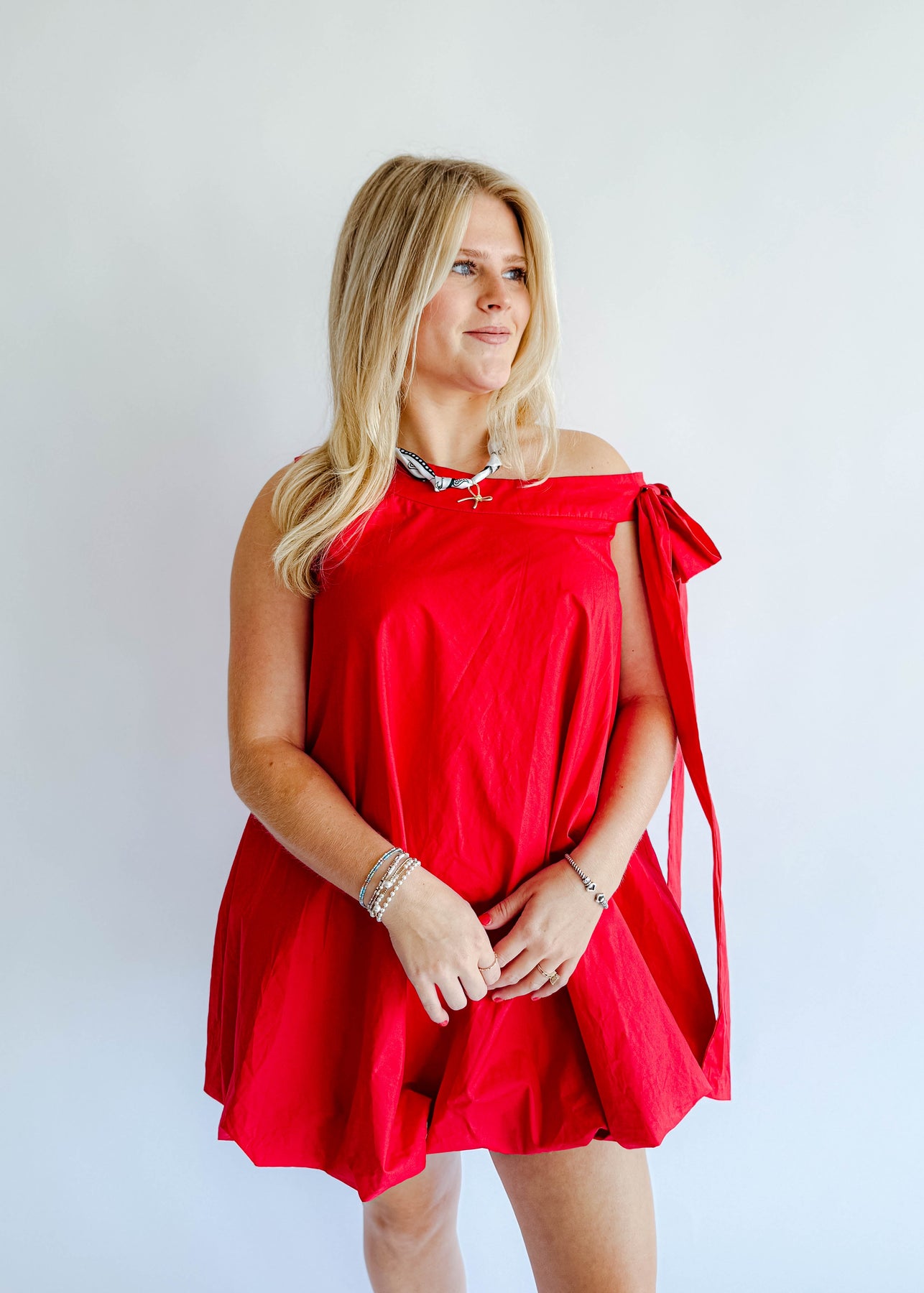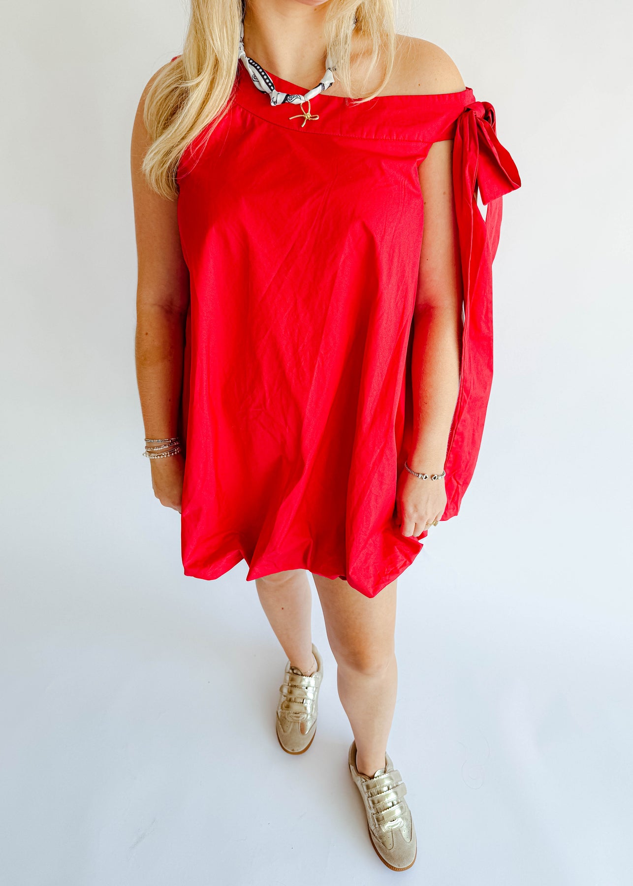Make a bold entrance with the Ruby Bubble Dress, a playful and elegant piece designed to stand out. This dress features a dramatic one-shoulder silhouette with a voluminous, flowy shape that flatters every figure. The oversized bow detail at the shoulder adds a touch of feminine charm and whimsy, while the bubble hem creates a unique, modern finish.