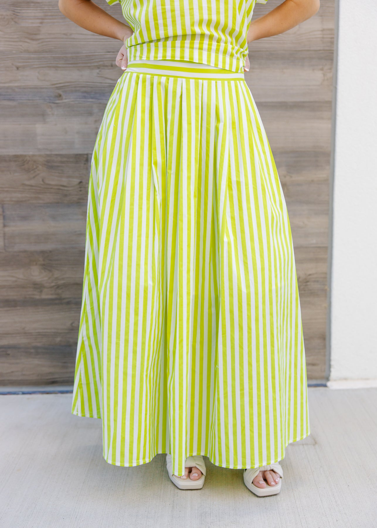 Regular price $ 48.00The Monroe Pleated Stripe Midi Skirt brings movement and charm together in one easy statement piece. Designed with a smooth waistband and soft pleating, it flows beautifully with every step while keeping a clean, flattering shape through the waist. The vertical stripe pattern adds visual interest and length, making it an easy favorite for dressing up or down. Pair it with a tucked-in blouse, a simple knit, or its matching top for a look that feels playful, polished, and ready for anything from daytime plans to dinner out.