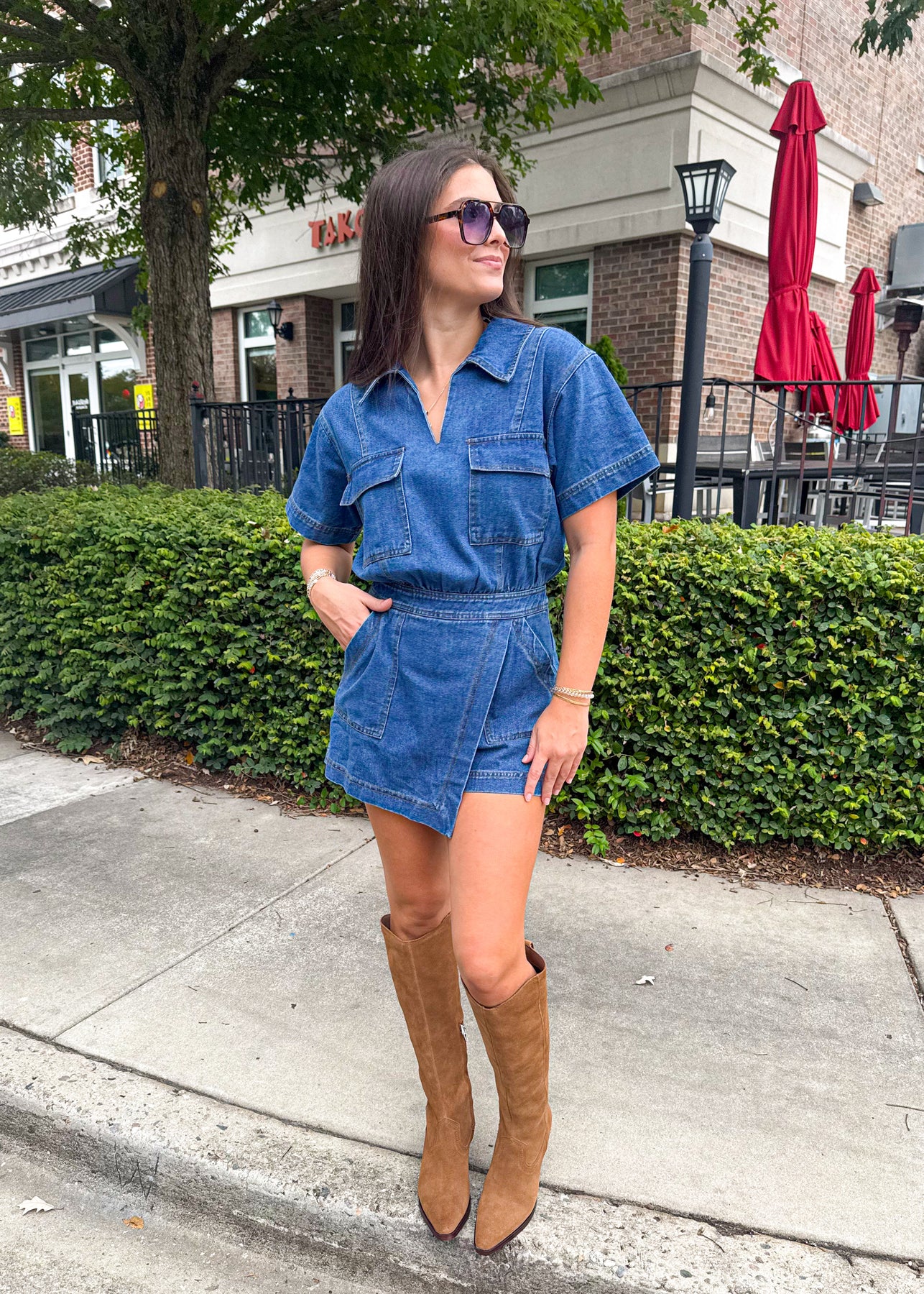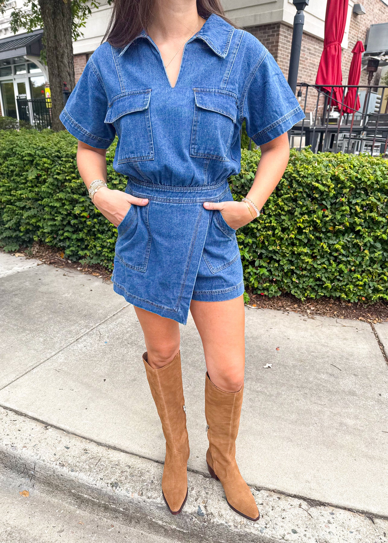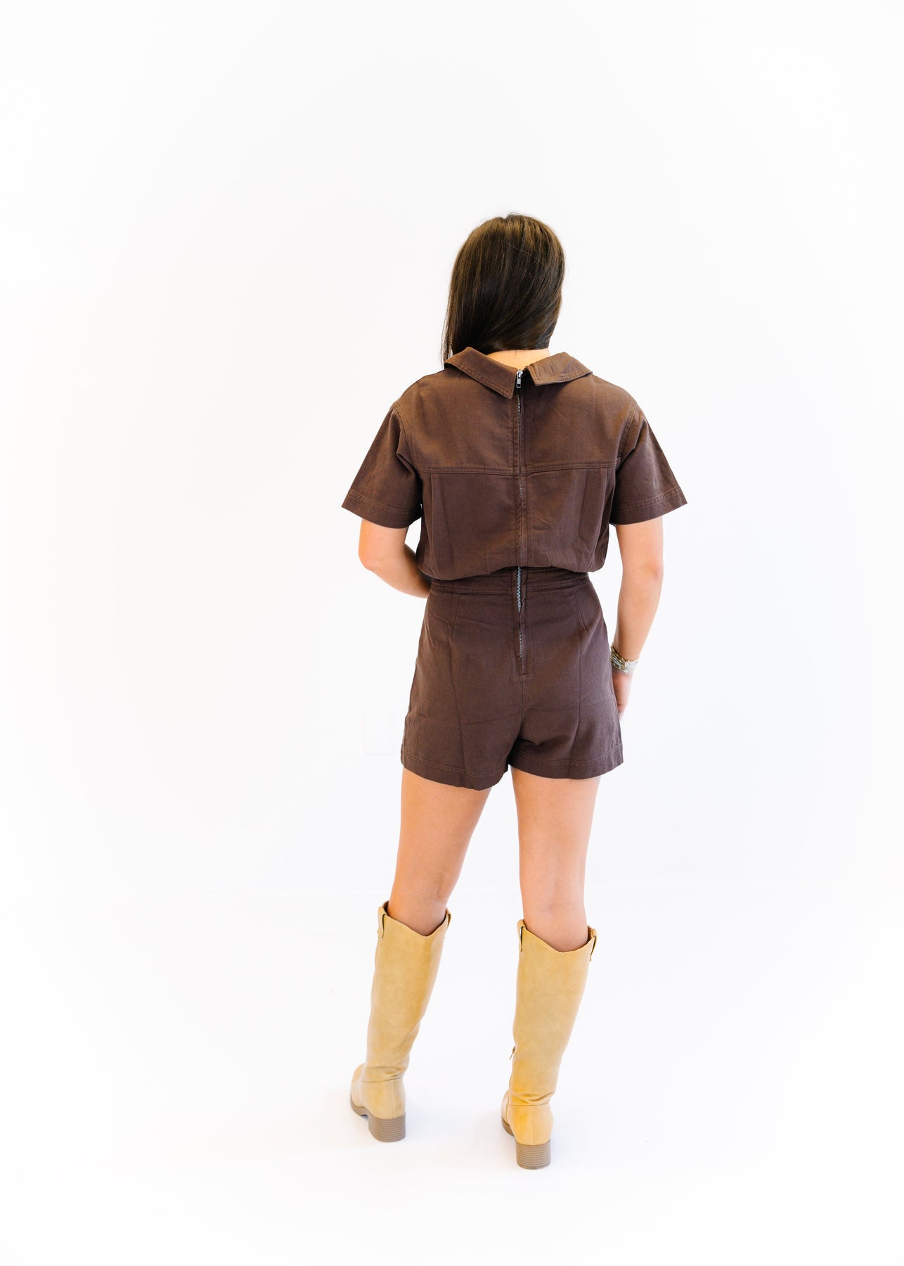 The Alice Denim Romper blends casual comfort with functional style. Designed with a collared neckline and short sleeves, this romper features two front flap pockets and a flattering elastic waist for a cinched silhouette. The structured fit and rich chocolate brown color give it a polished yet laid-back vibe, perfect for everyday wear. Pair with sneakers or sandals for an effortlessly chic look.