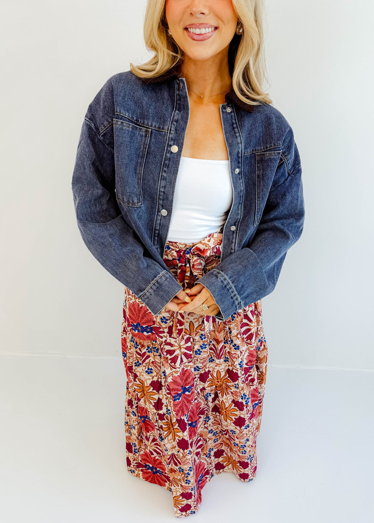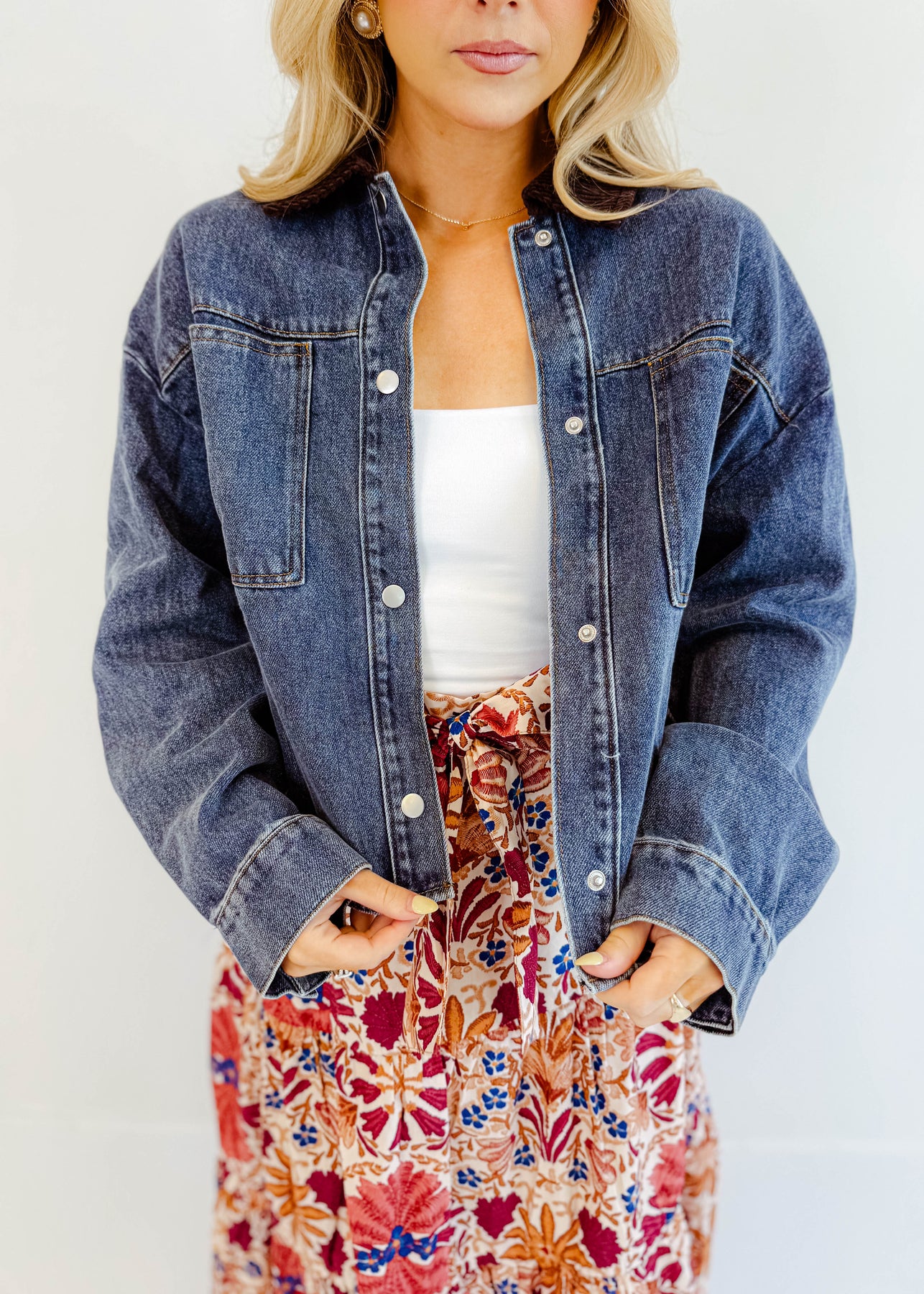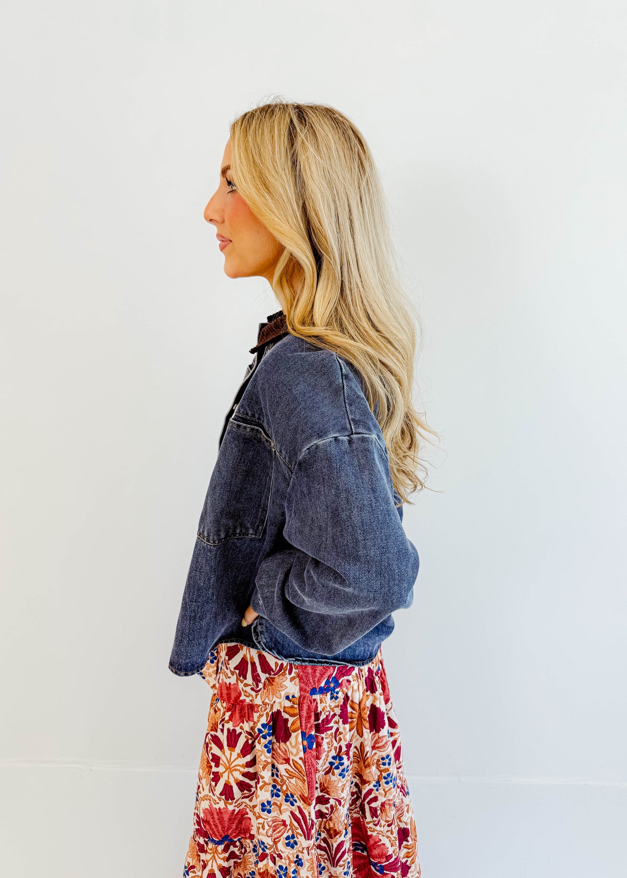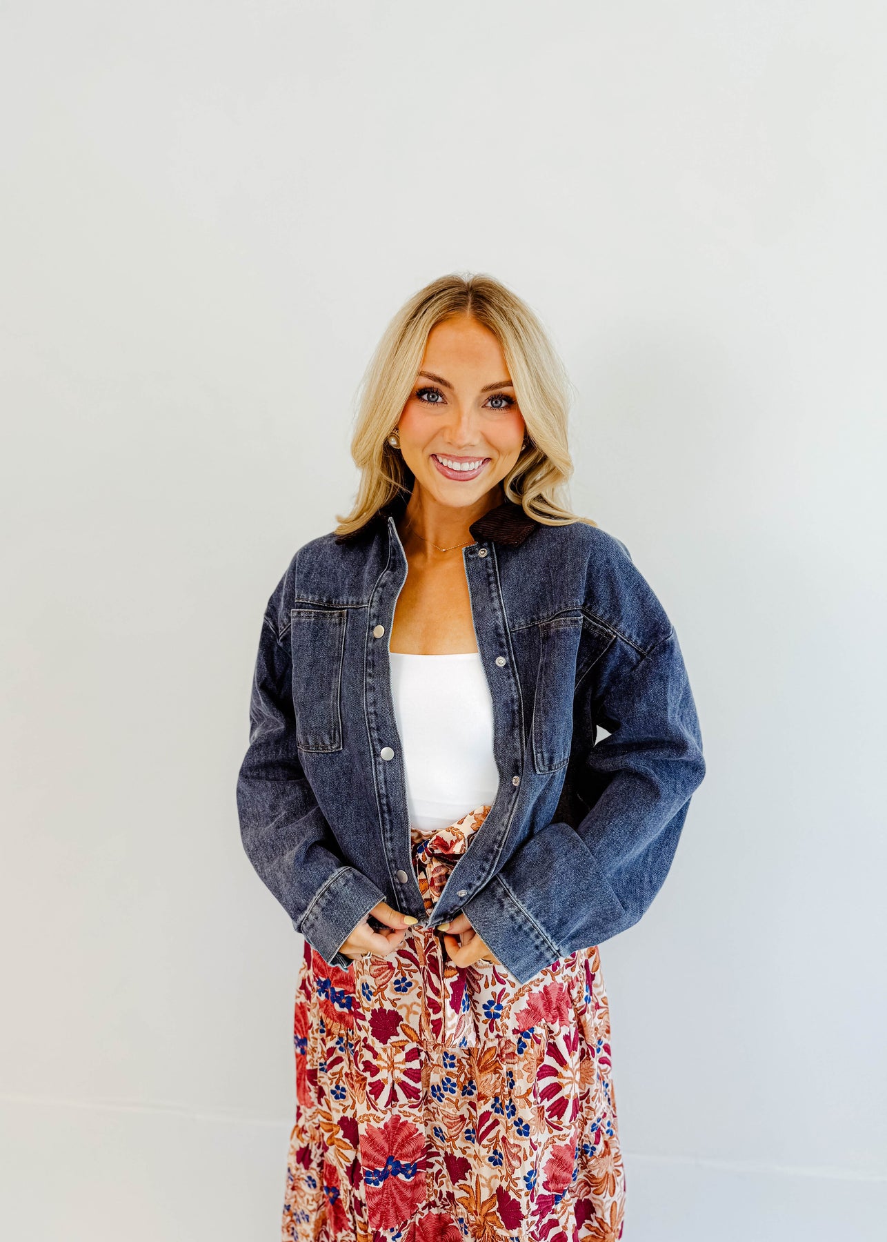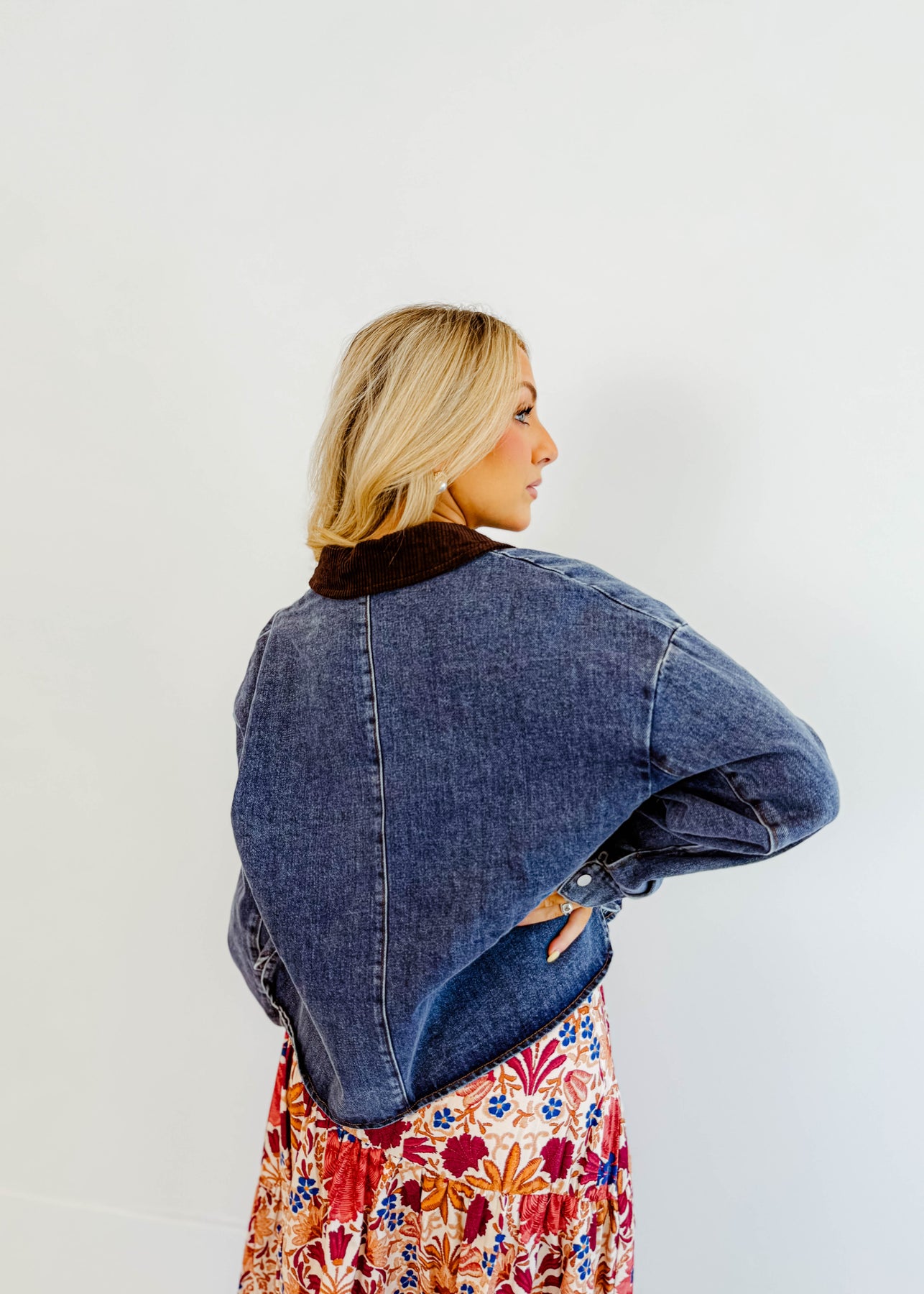 The Maribel Corduroy-Collar Denim Jacket is the layering piece your wardrobe has been waiting for. With its structured denim body and contrasting corduroy collar, it blends timeless style with a modern twist. The relaxed fit makes it easy to throw over chunky knits, graphic tees, or floral skirts, giving you endless styling options.