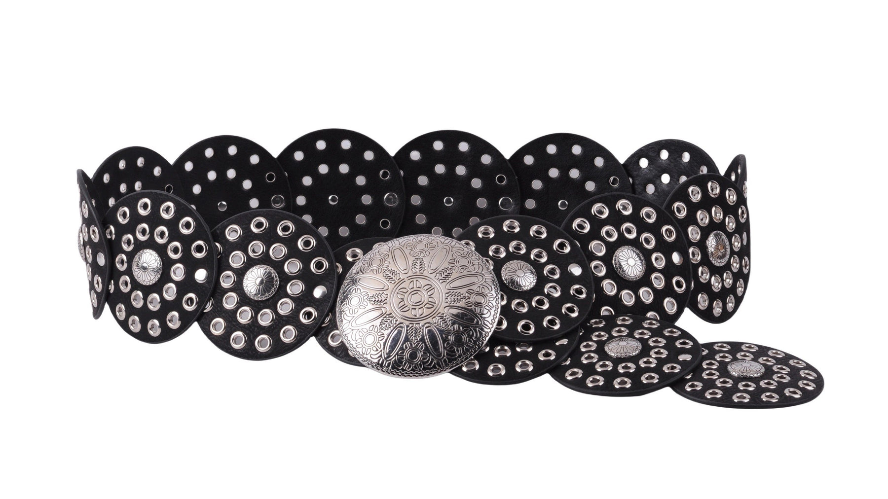 Regular price $ 36.00This belt is built to make noise—in the best way. Wide and commanding, it’s detailed with metal grommets and disc accents that bring instant edge. The structured design cinches any look with authority, whether over denim, dresses, or layered fits. More than an accessory, it’s a statement piece that turns every outfit into a power move.
