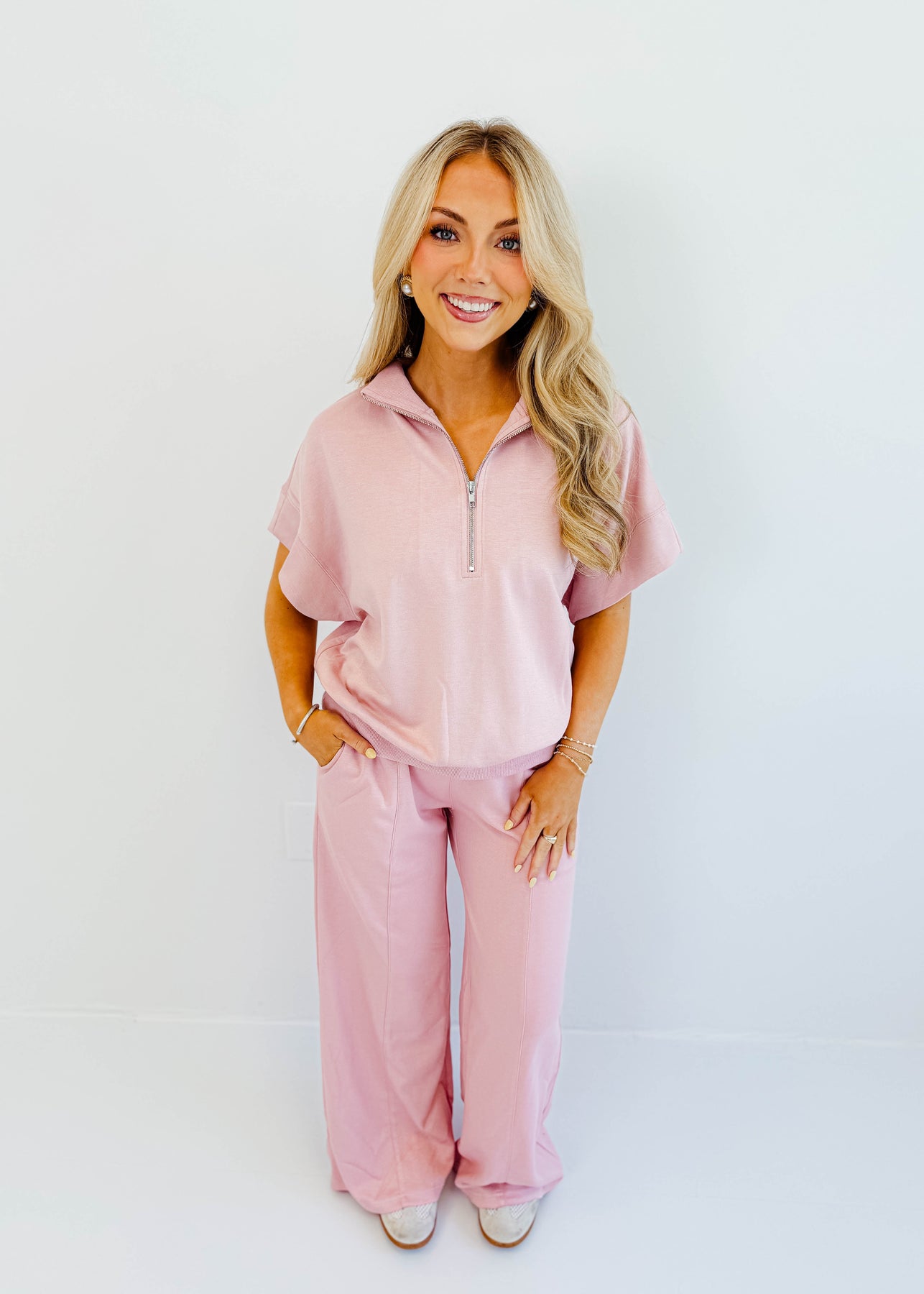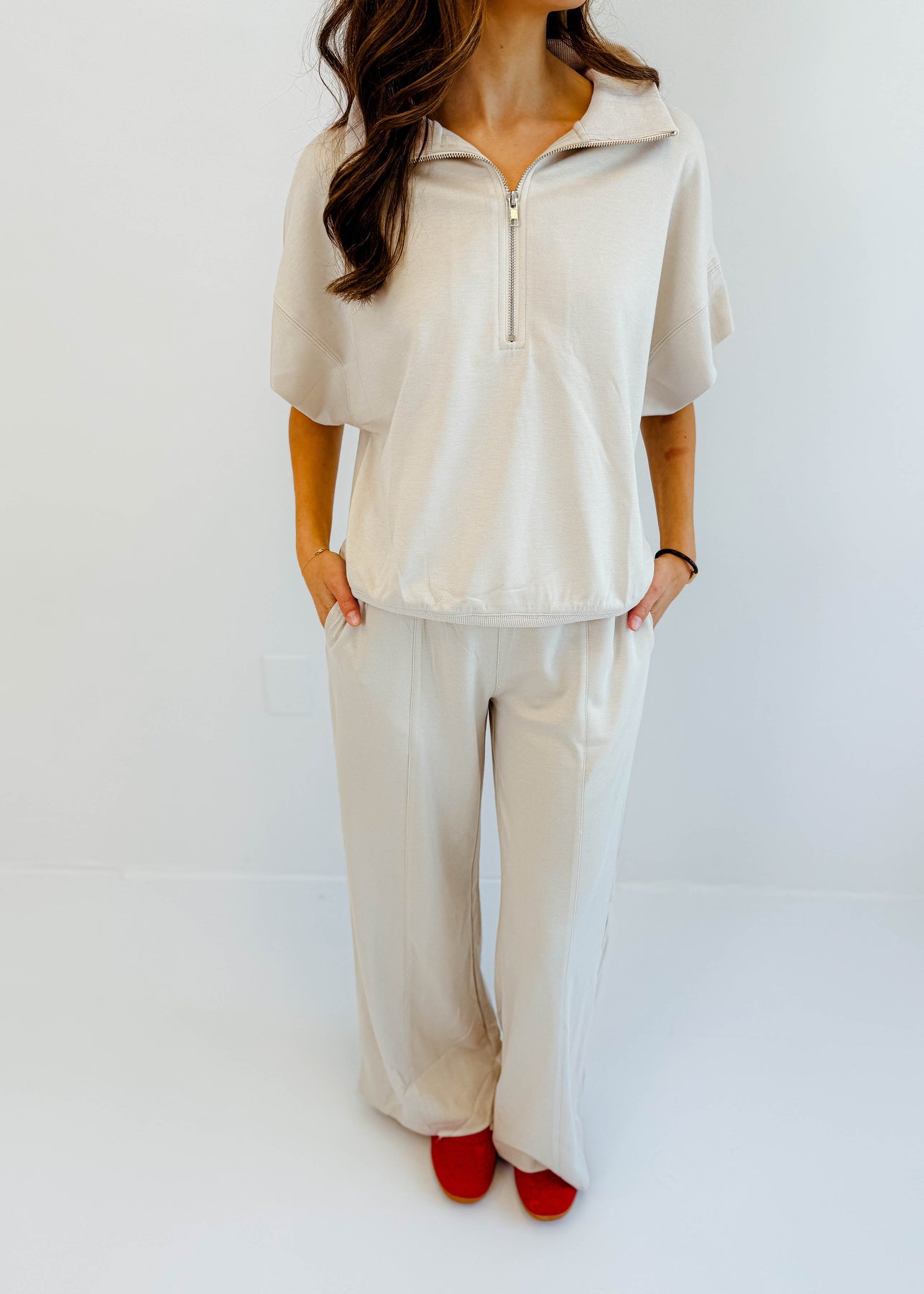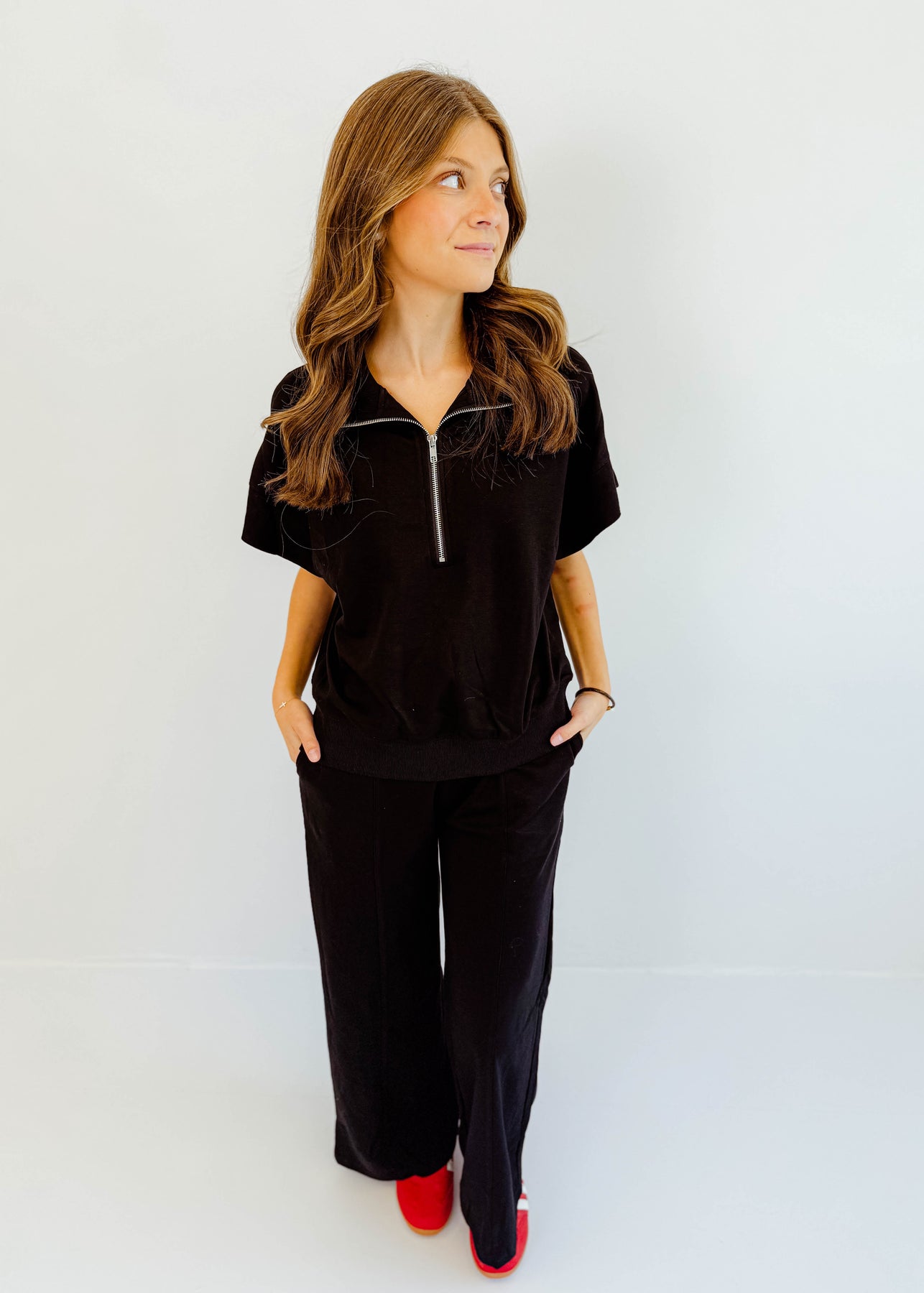 The Jenna Quarter Zip is your go-to for laid-back style with a polished twist. Made from smooth, soft-touch fabric, it features a casual quarter-zip neckline and gently cuffed short sleeves for a modern, easygoing silhouette. The wide hem adds structure without feeling restrictive, making it perfect for pairing with high-rise jeans or a fitted skirt. This top blends comfort and style for those effortless off-duty days.