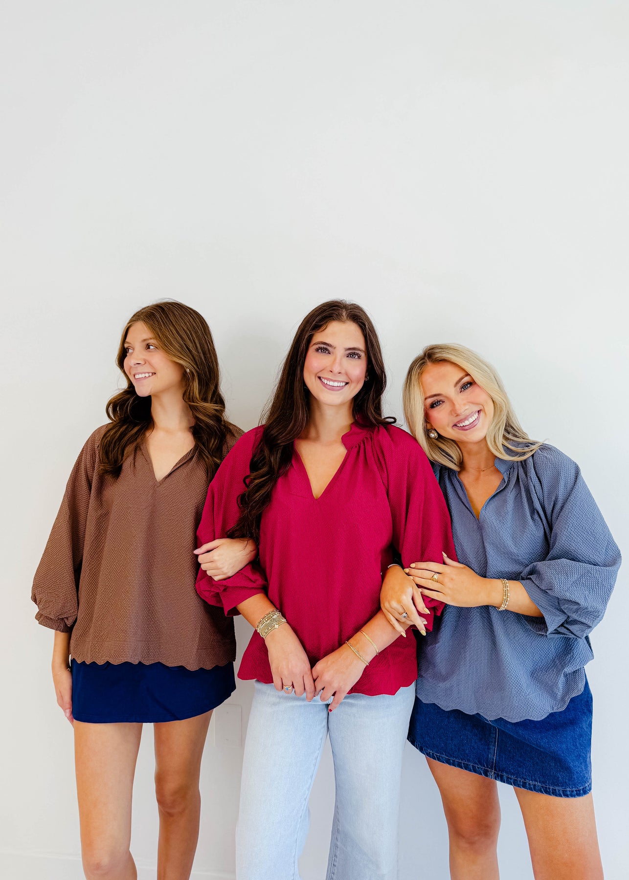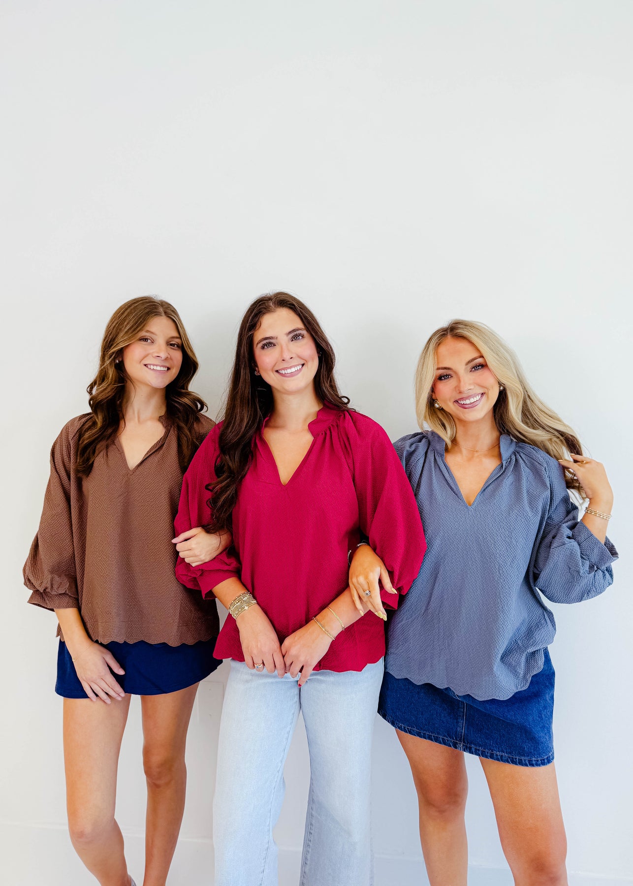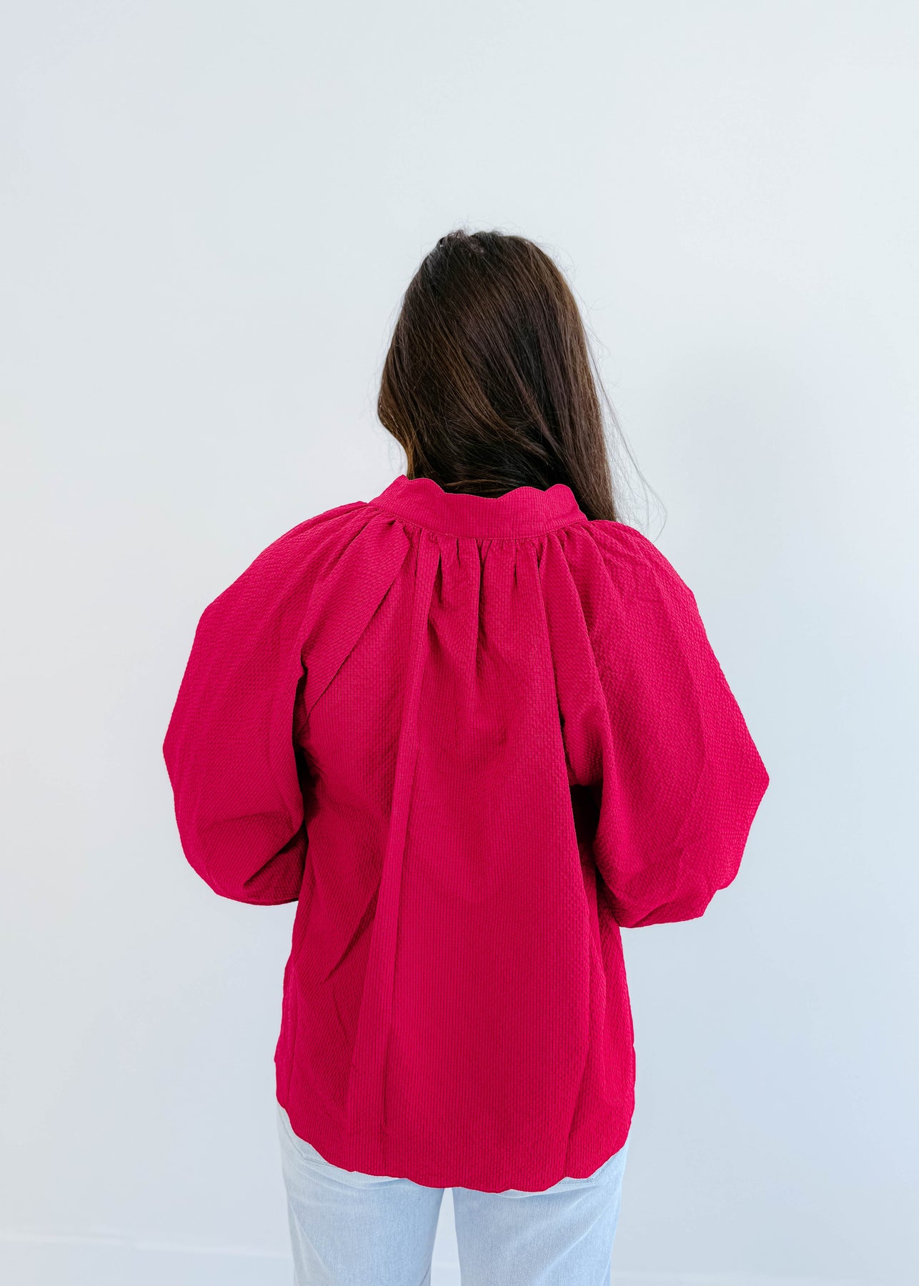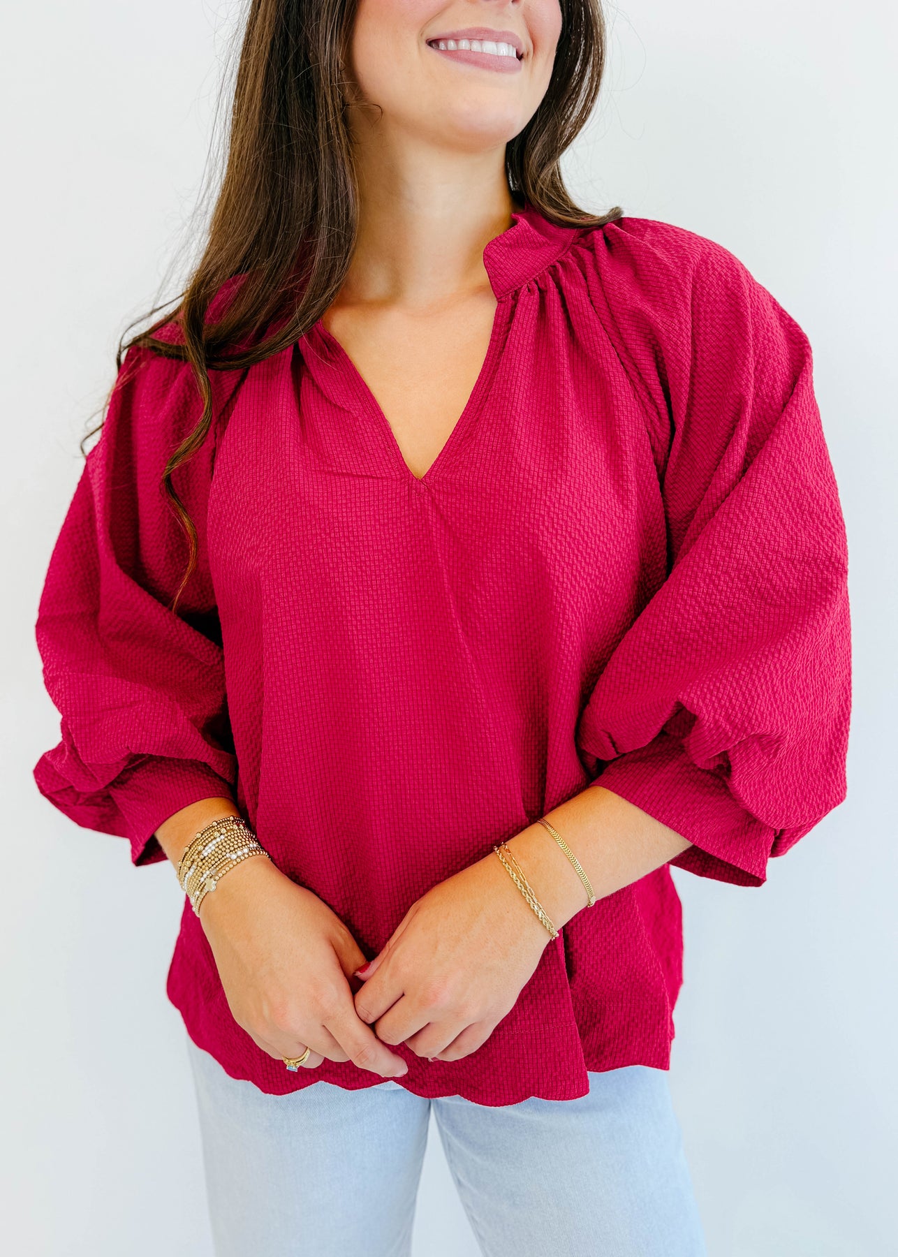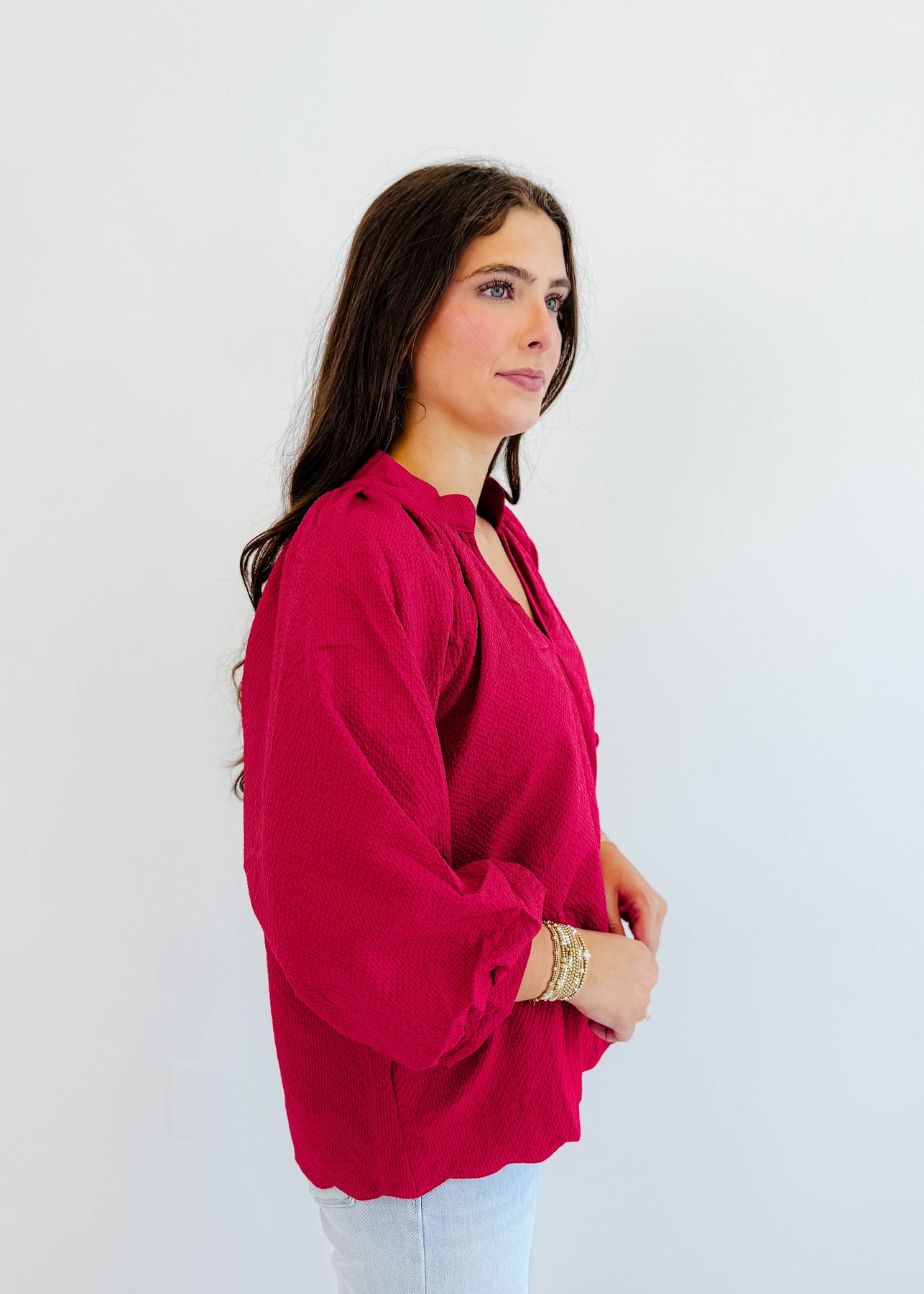 This long-sleeve top adds a pop of color and a playful touch to your wardrobe. Designed with a relaxed silhouette, it features a soft textured fabric and a V-neckline with a subtle gathered detail near the shoulders. The sleeves are loose and flowy, offering both comfort and movement. A scalloped hem completes the look, giving it a light and feminine finish. Pair it with tailored bottoms or casual denim for an easy everyday style.