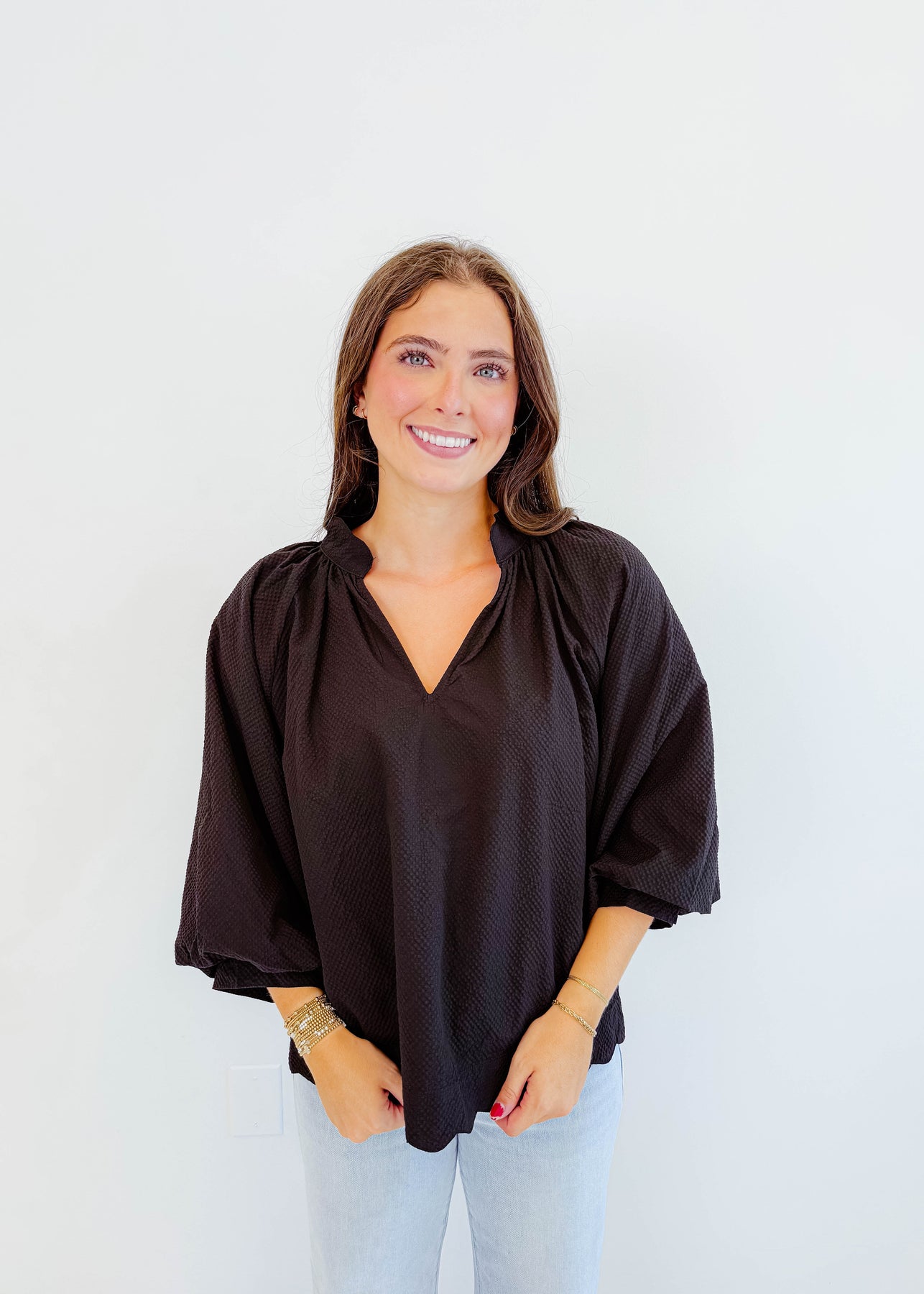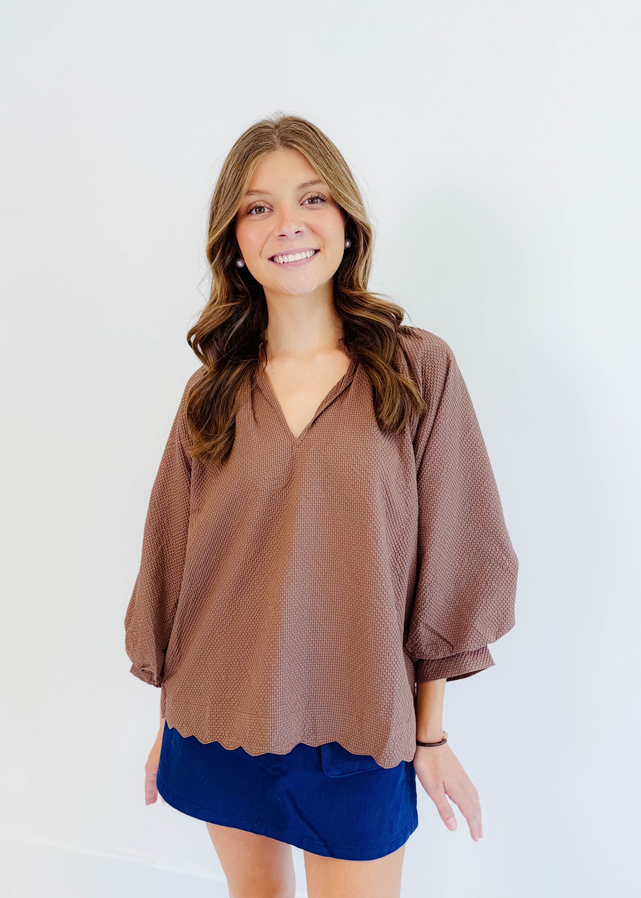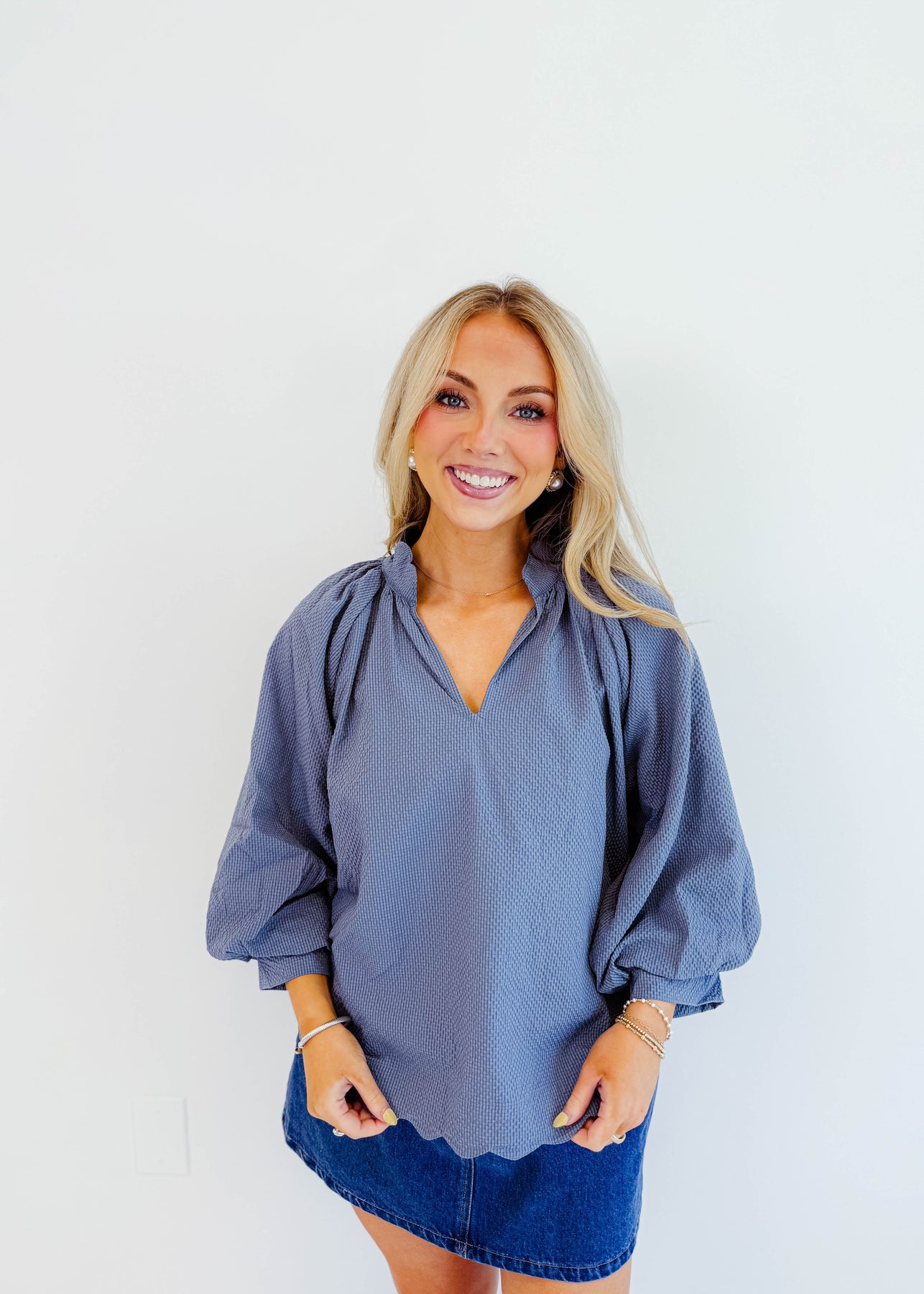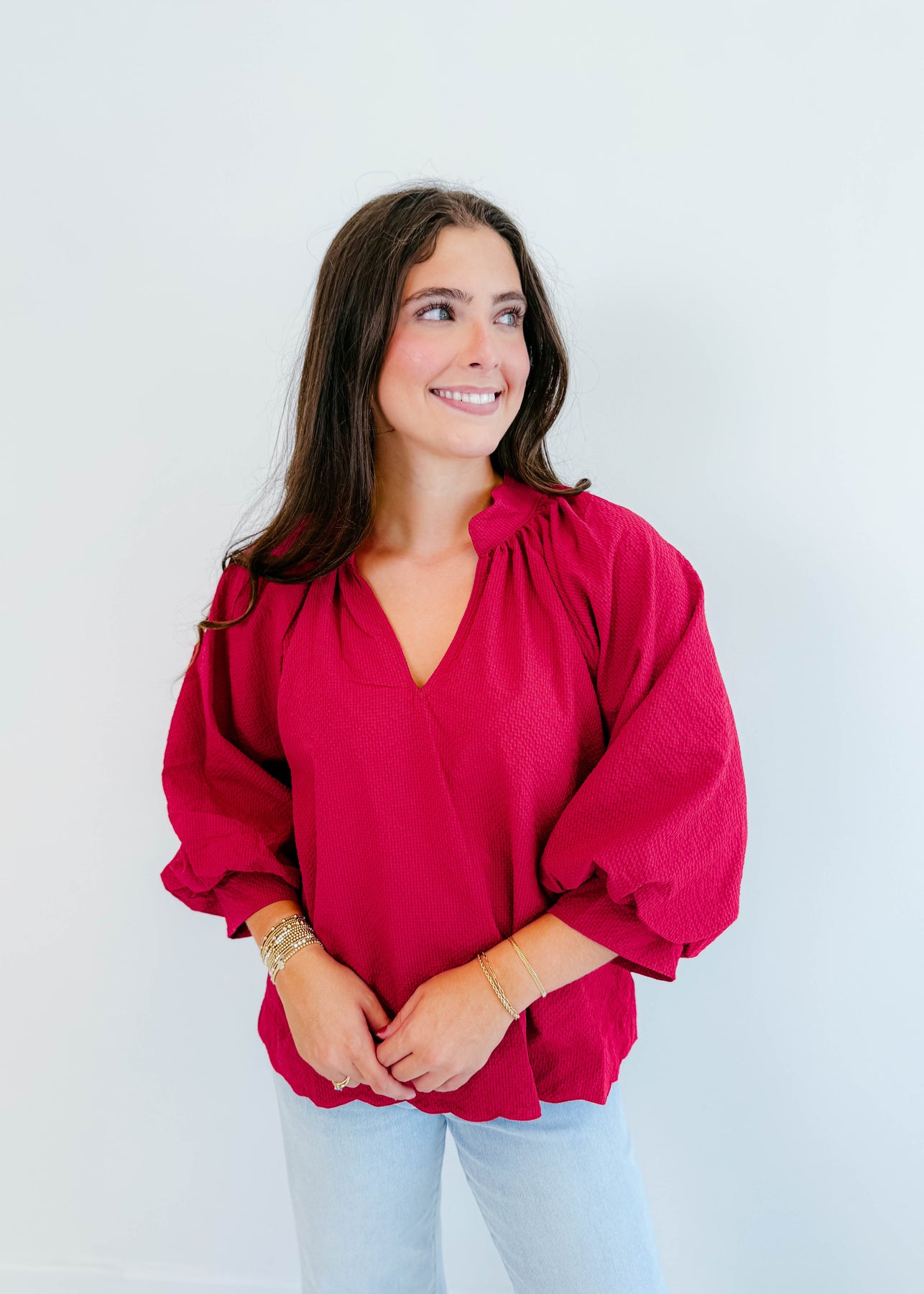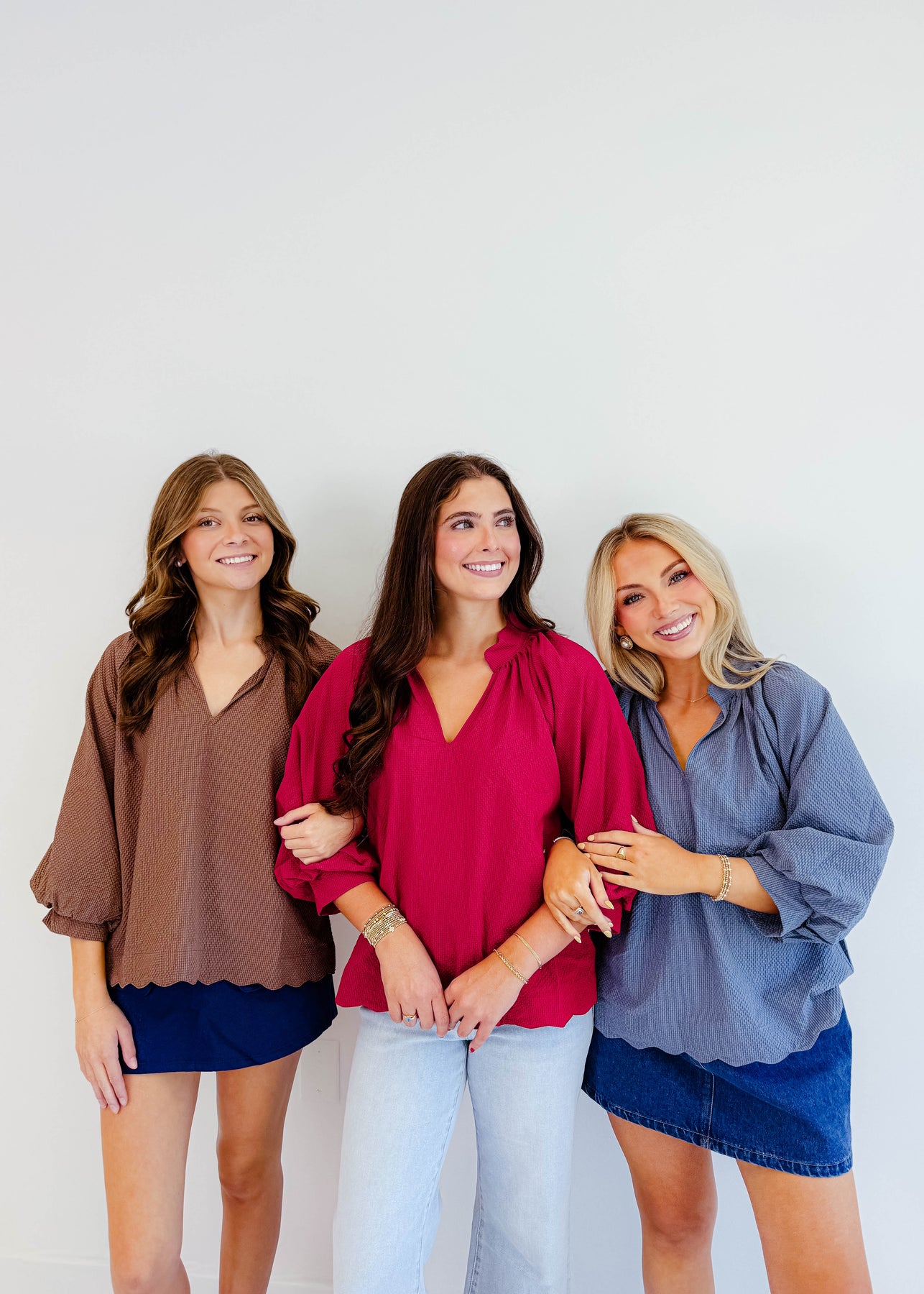 This long-sleeve top adds a pop of color and a playful touch to your wardrobe. Designed with a relaxed silhouette, it features a soft textured fabric and a V-neckline with a subtle gathered detail near the shoulders. The sleeves are loose and flowy, offering both comfort and movement. A scalloped hem completes the look, giving it a light and feminine finish. Pair it with tailored bottoms or casual denim for an easy everyday style.