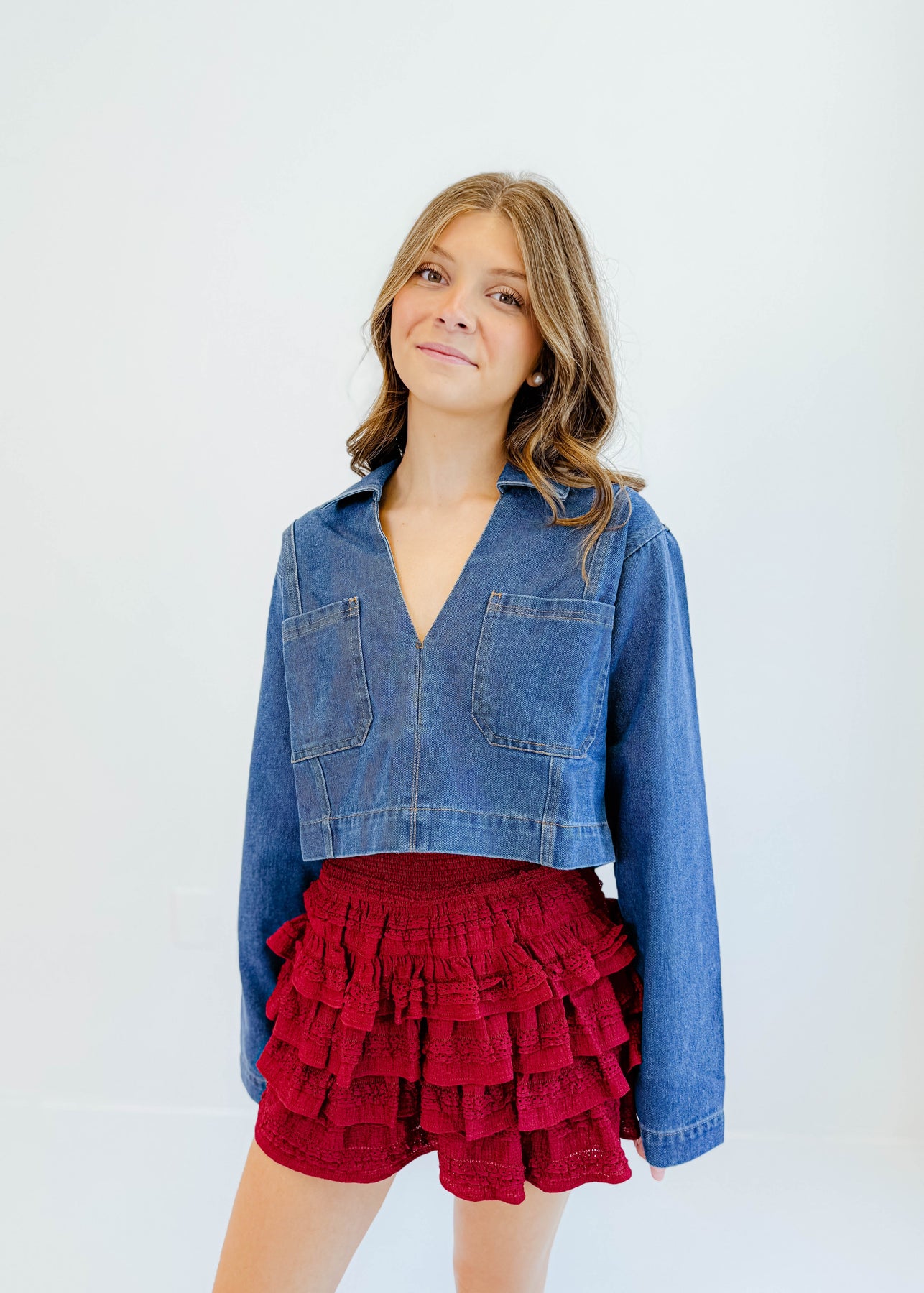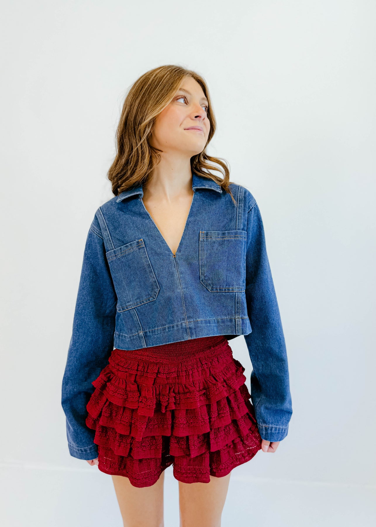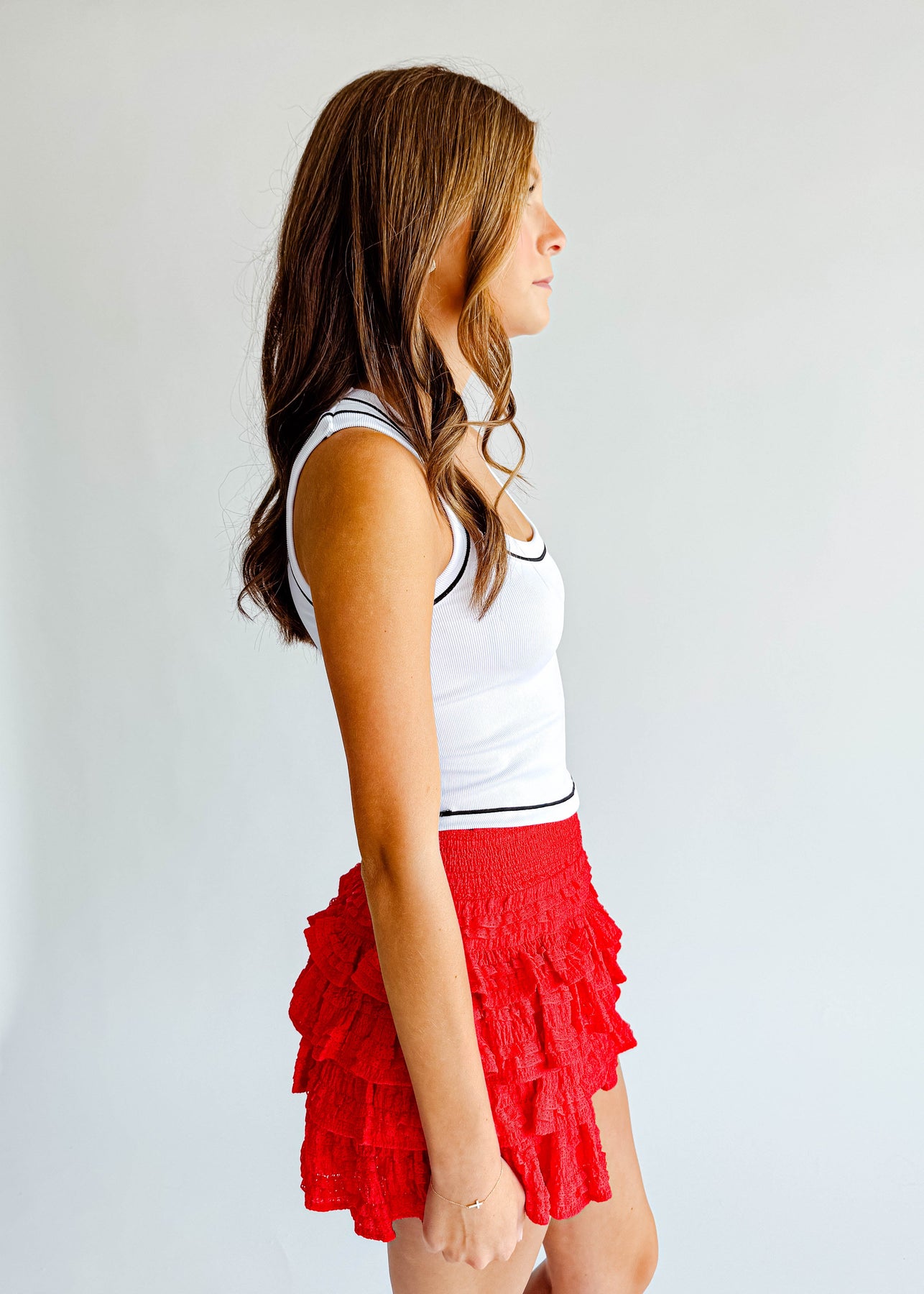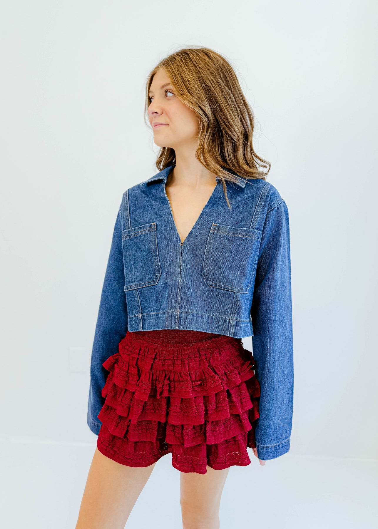 A multi-tiered textured ruffle skort designed with a smocked waistband for a comfortable and secure fit. The layered ruffles add playful movement, making this piece a stylish and versatile choice for any occasion.