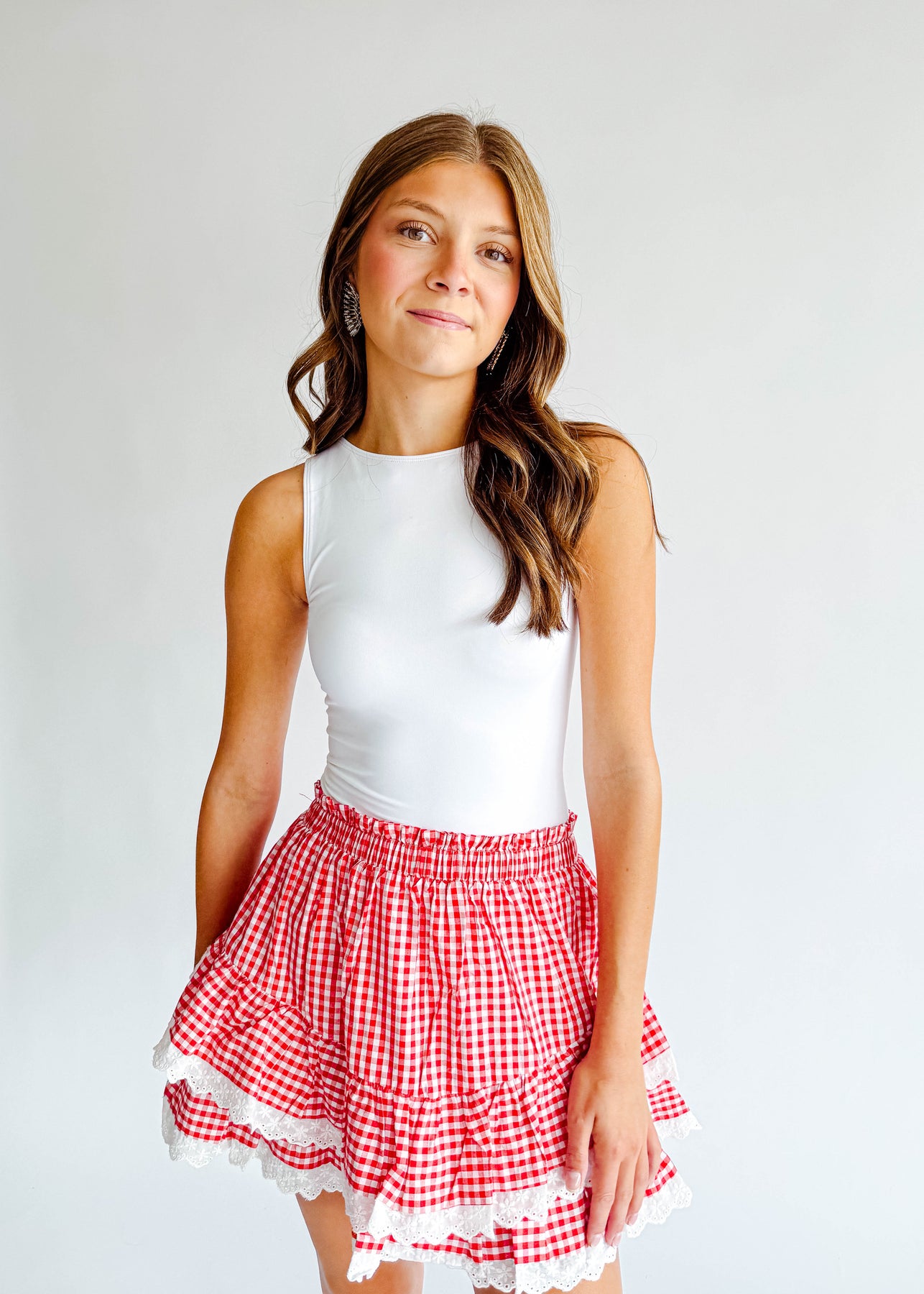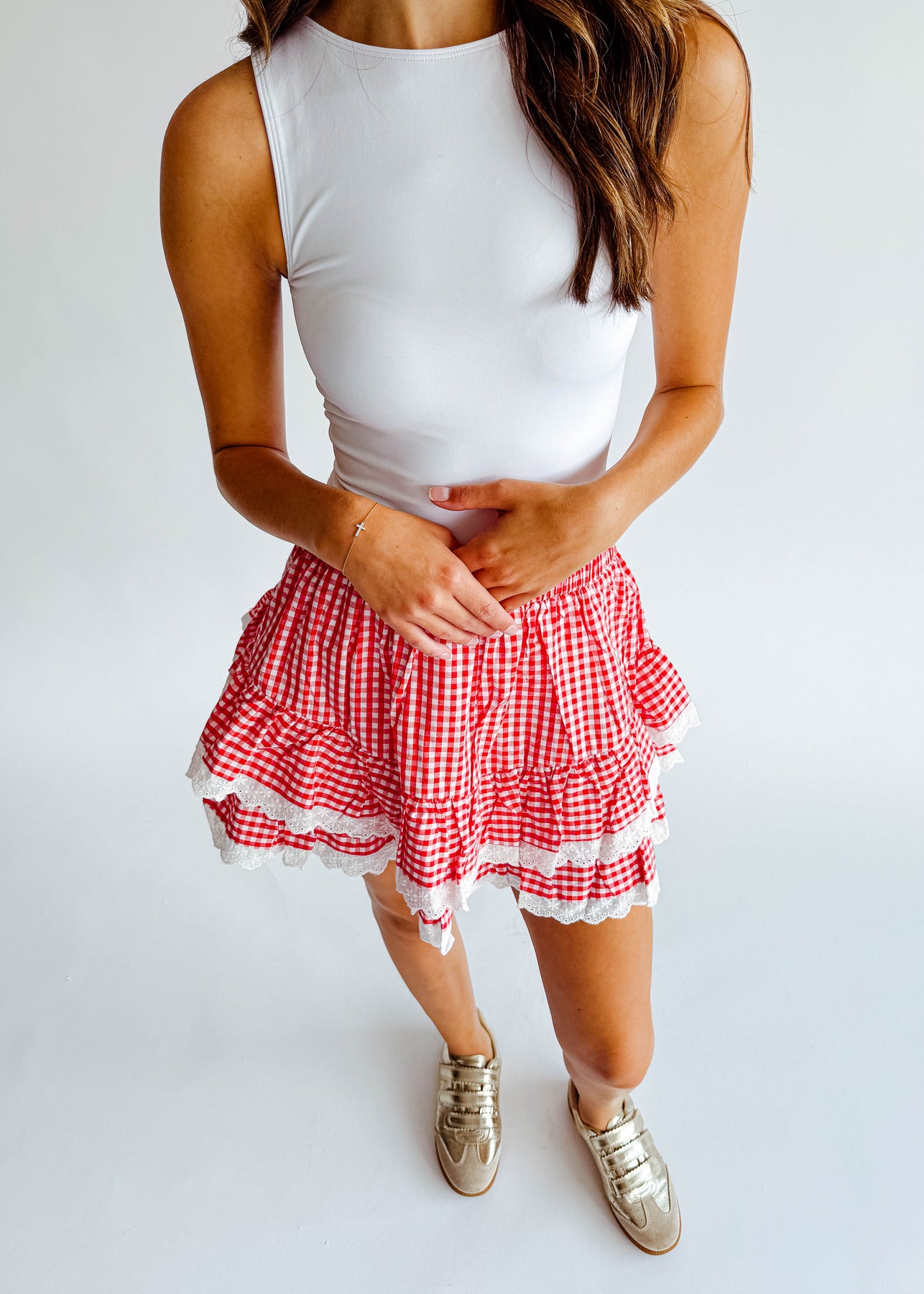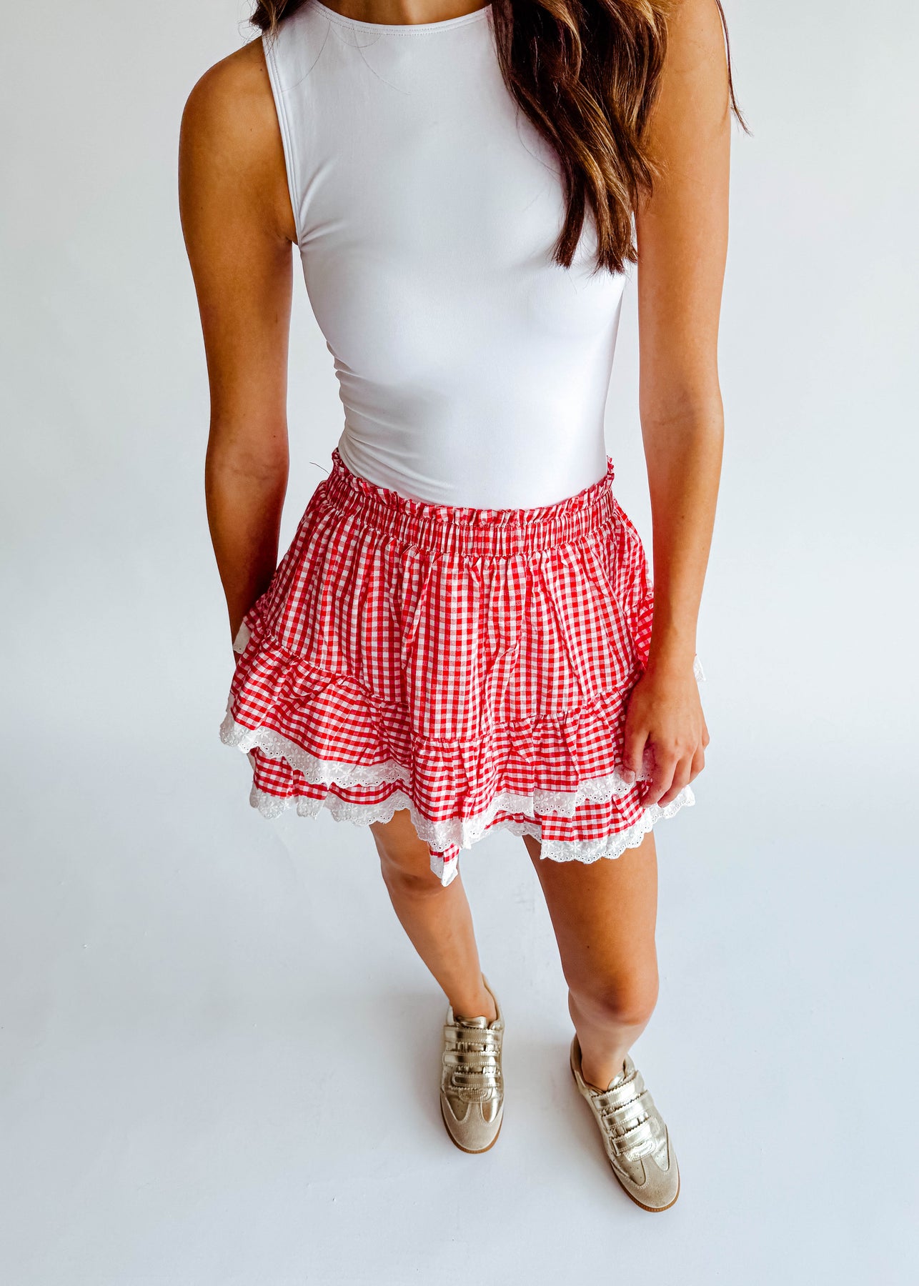 The Sophie Gingham Ruffle Skort is the perfect mix of playful and pretty. Designed with a classic gingham pattern and finished with delicate eyelet ruffle trim, it brings soft charm to any summer look. Built-in shorts give you comfort and freedom to move, while the layered silhouette adds a flirty twist. Whether you're headed to a picnic or a weekend market, Sophie keeps it sweet and easy.