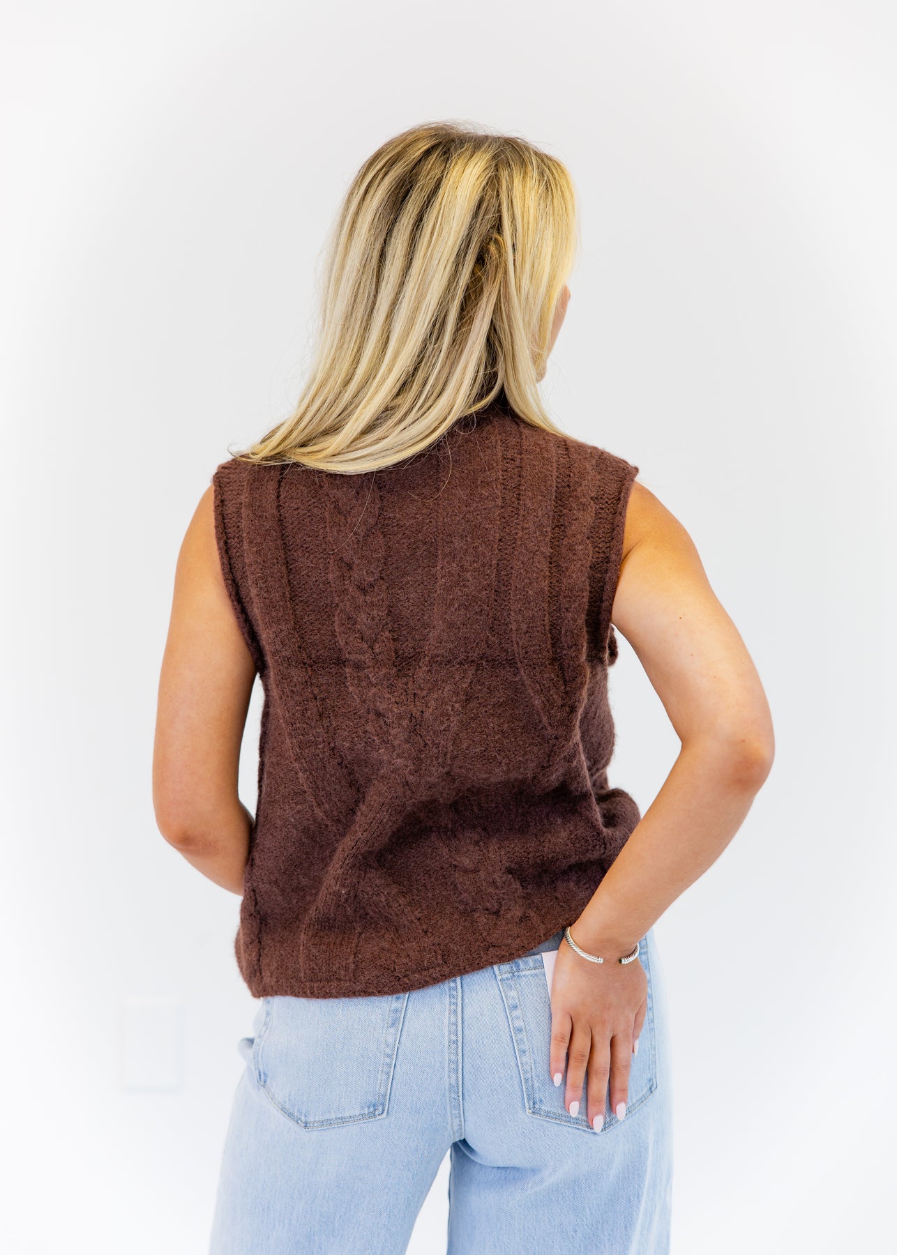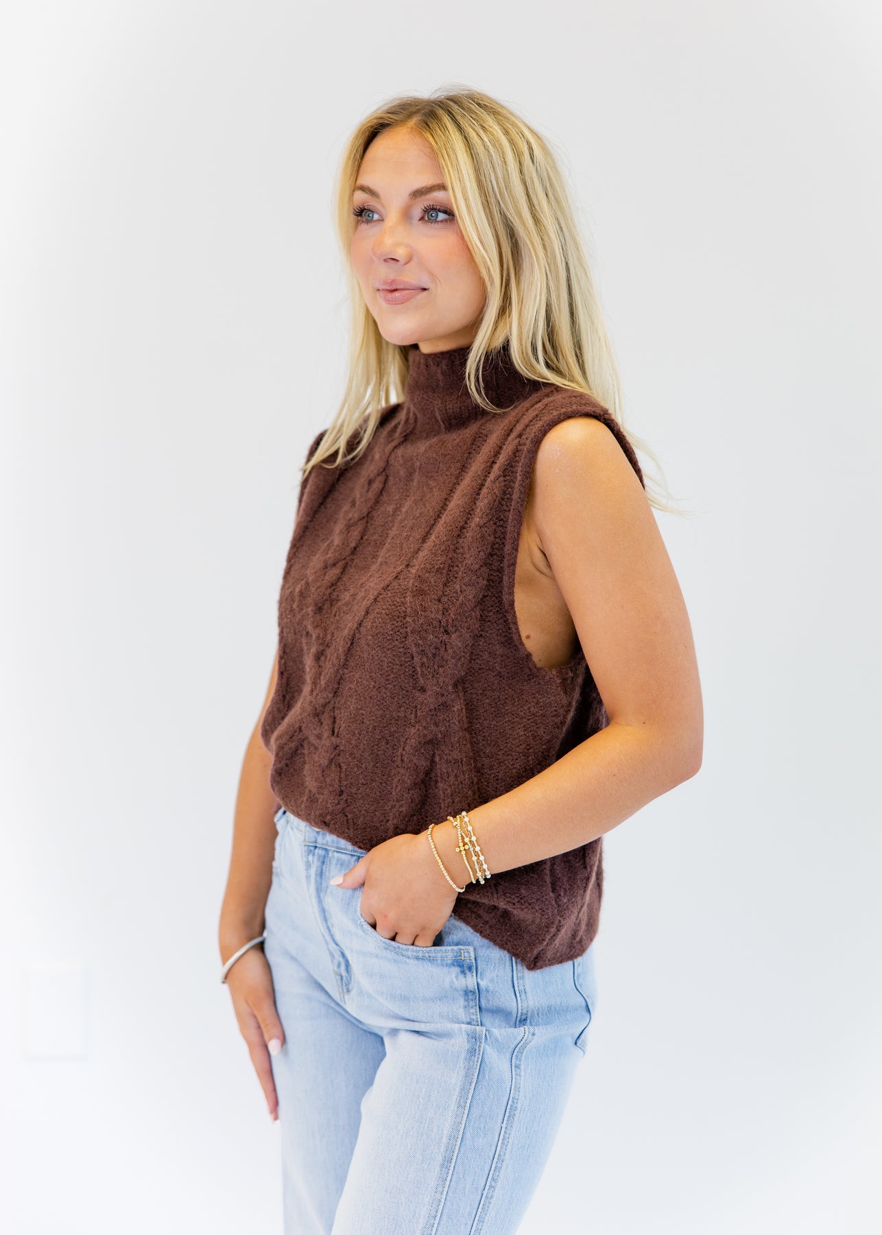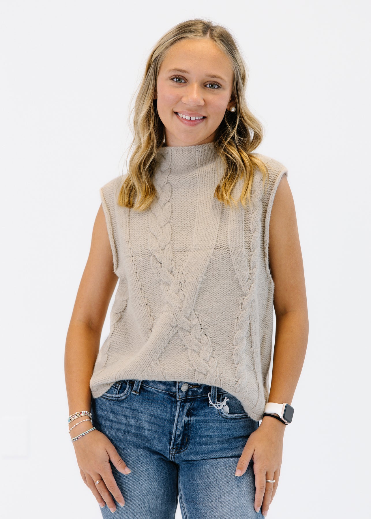 The Calla Cable Knit Top combines cozy texture with a modern silhouette. Featuring a high neckline and intricate cable knit detailing, this piece brings timeless charm with a contemporary twist. The sleeveless design makes it perfect for layering or wearing alone during transitional seasons. Its soft knit fabric ensures comfort, while the slightly cropped hem pairs beautifully with high-waisted pants or skirts.