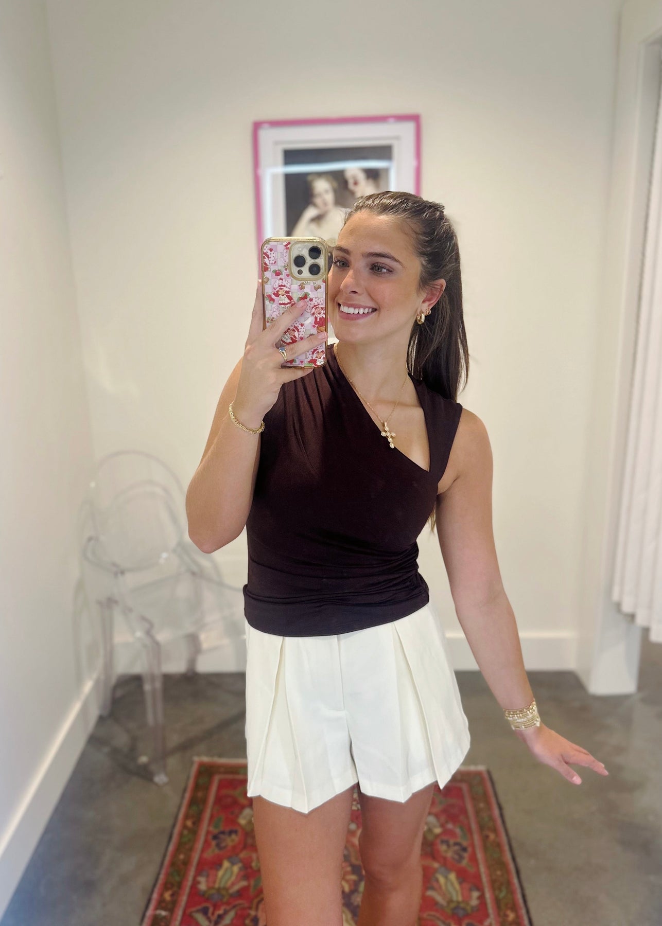 Turn heads with this striking asymmetric ruched top. Designed with a modern silhouette, it features a unique single-shoulder neckline that adds a bold edge to your look. The fitted shape is enhanced with ruching along the side, creating a flattering drape and highlighting your natural curves. Crafted in a soft, stretchy fabric, it offers both comfort and style, making it a versatile piece for casual nights out or elevated daytime outfits.
