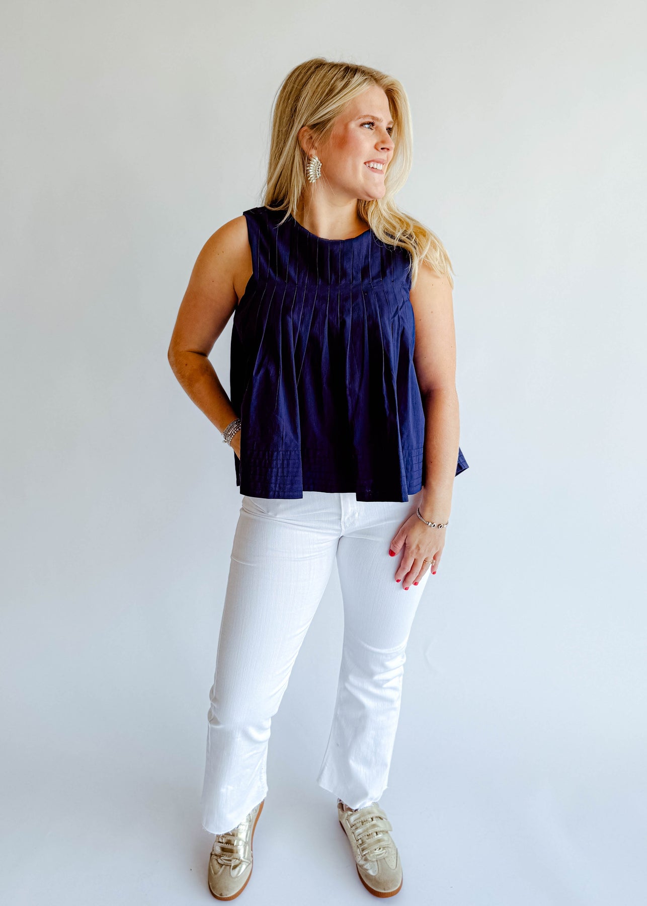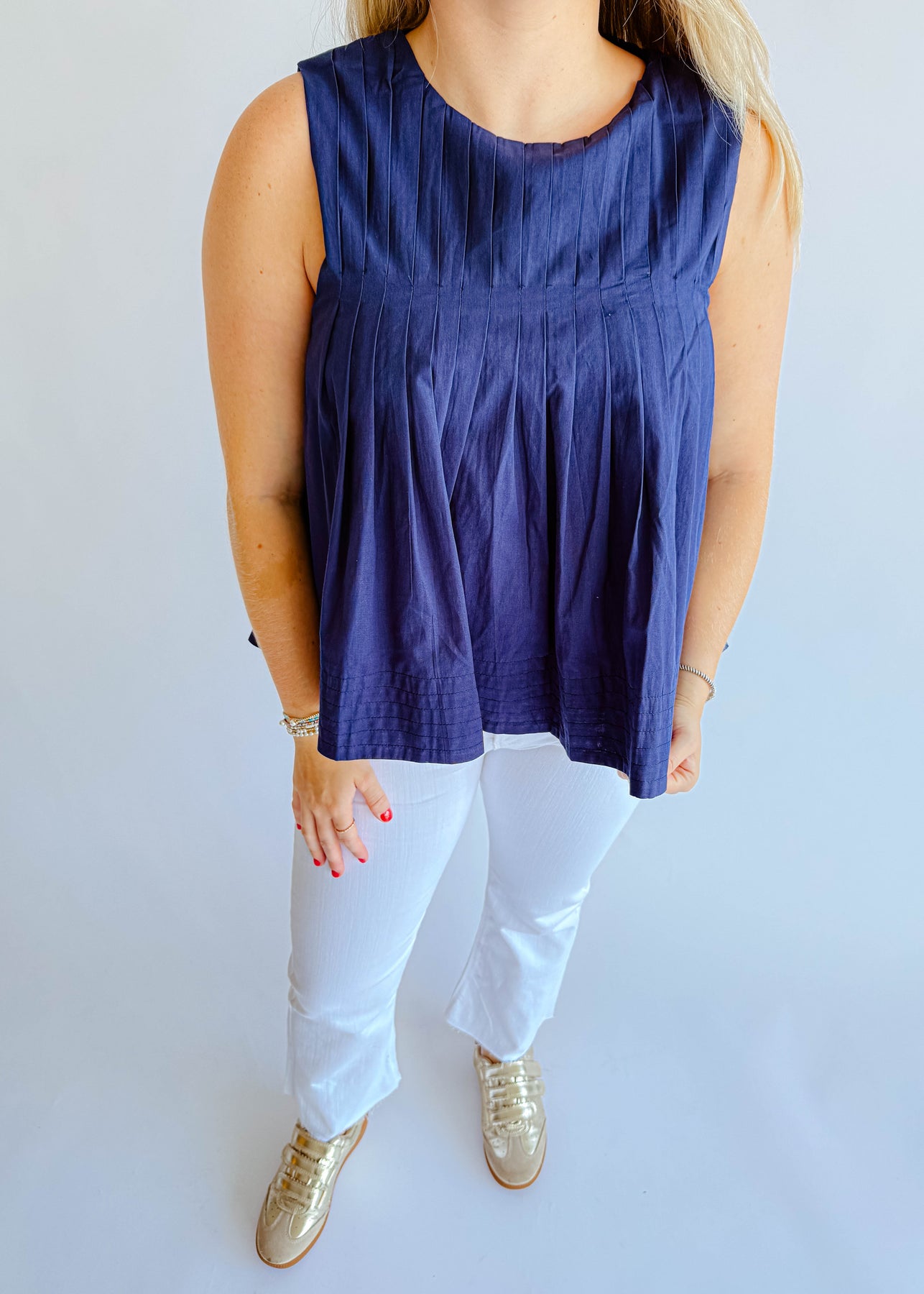 A stylish sleeveless top with a flattering A-line silhouette. Designed with delicate pleats that add texture and movement, this versatile piece is perfect for layering or wearing on its own. Pair it with jeans for a casual look or tuck it into a skirt for a more polished outfit.