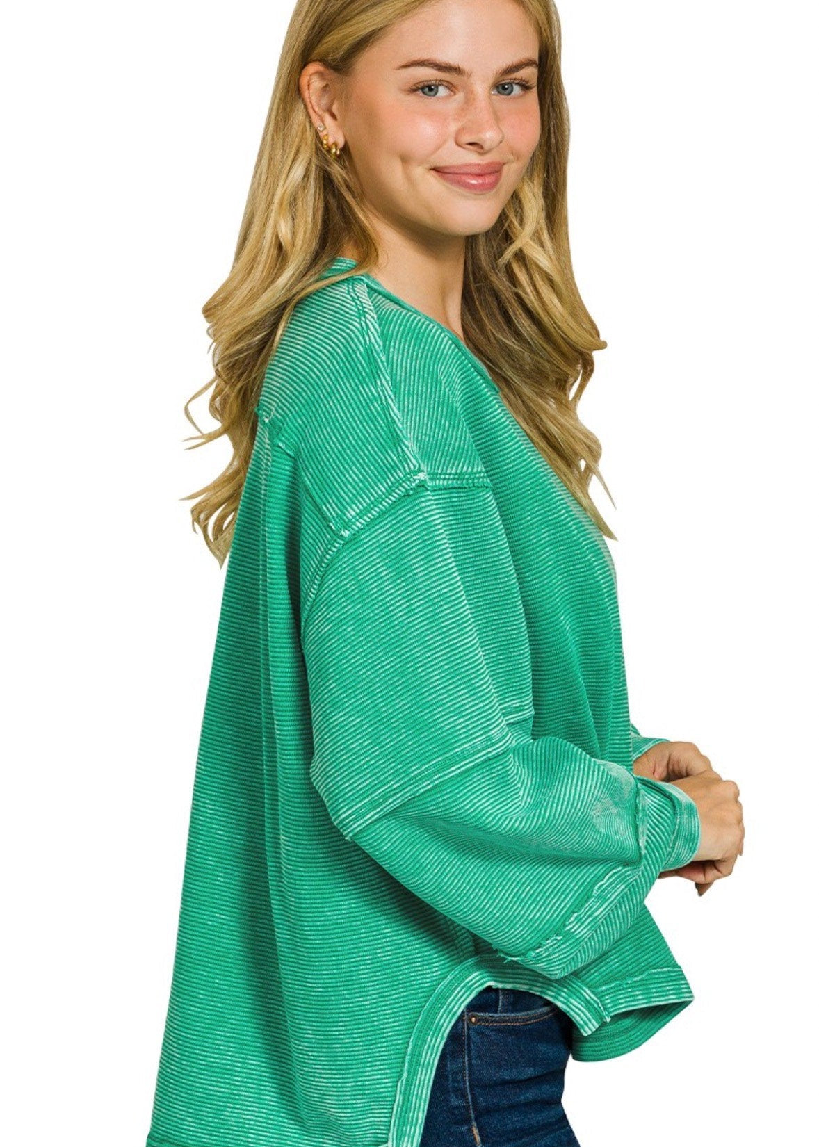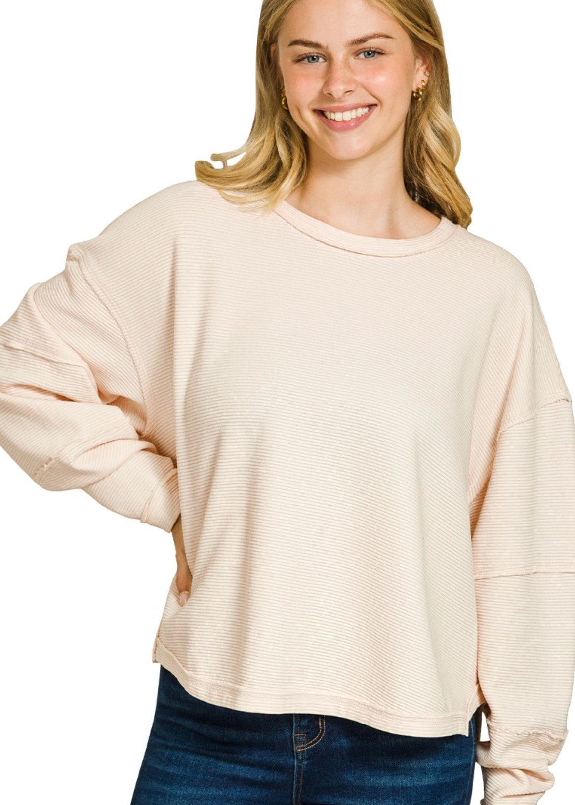Regular price $ 46.00A laid-back favorite with a little extra personality. This soft ribbed pullover has an easy drape, relaxed sleeves, and exposed seams that give it that perfectly lived-in look. The subtle acid wash adds dimension without feeling loud. Throw it on with denim for busy days, pair it with leggings for errands, or keep it close for those cozy at-home moments. It’s the kind of top that makes getting dressed feel effortless in all the right ways.