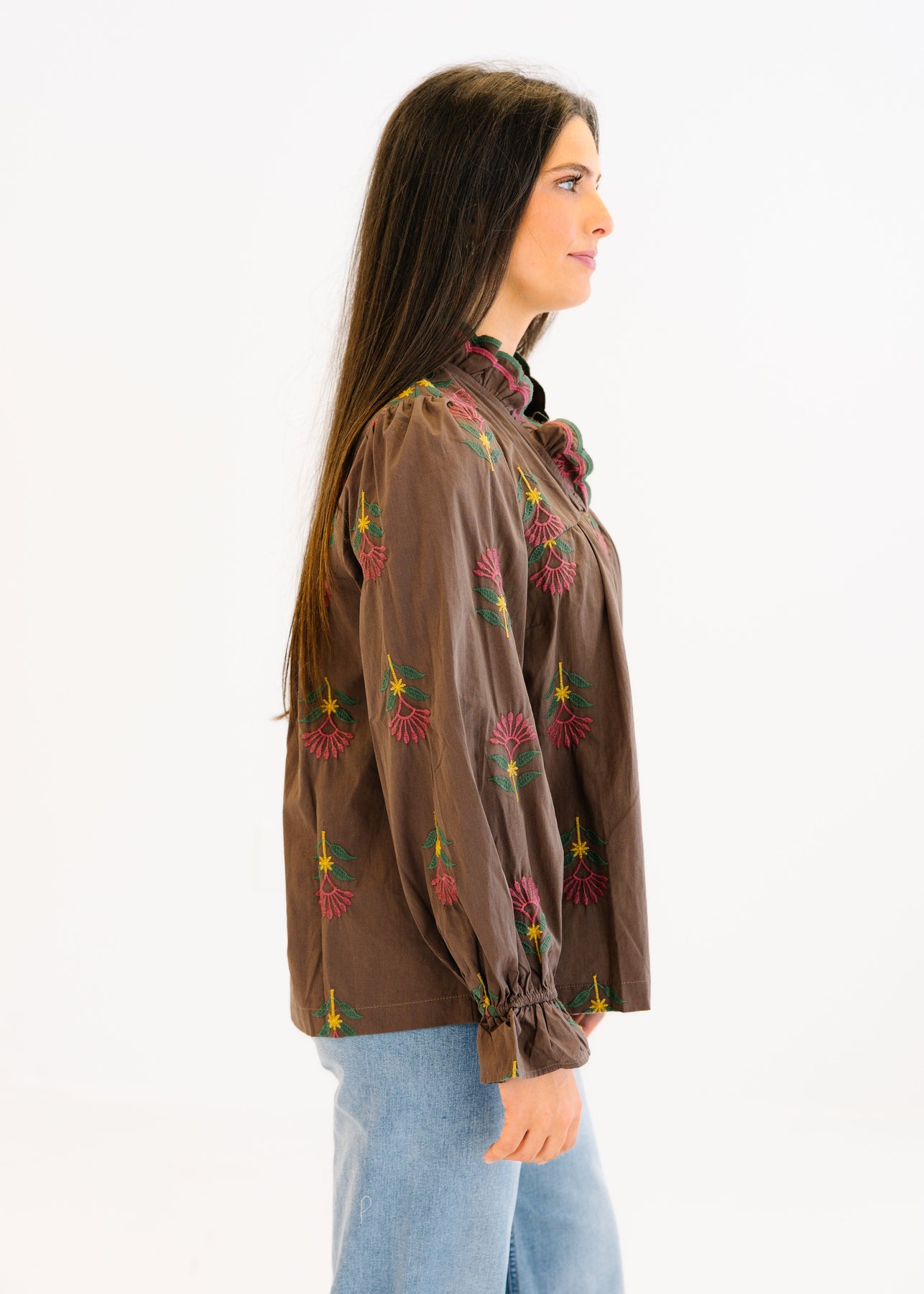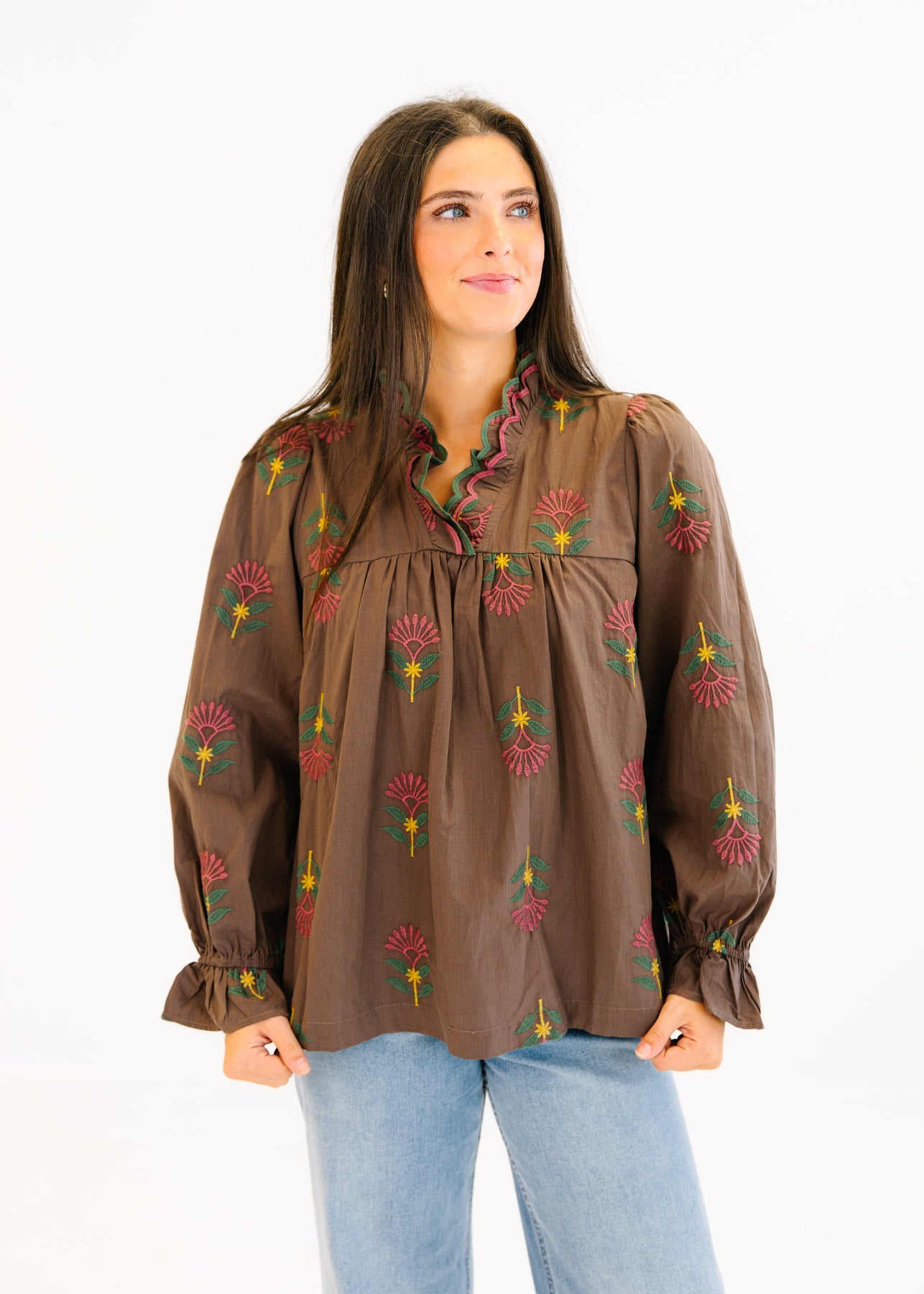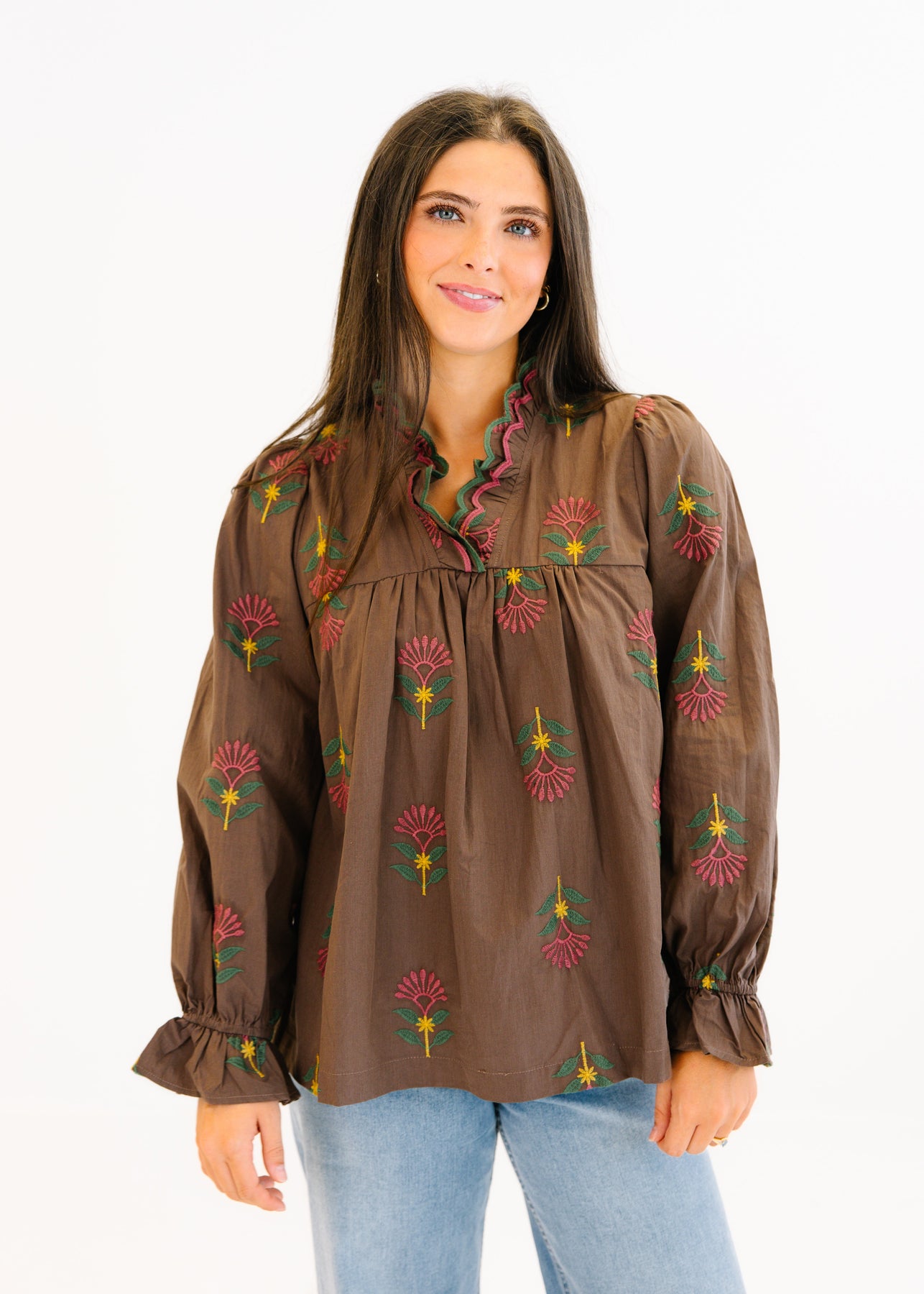 The Audrey Floral Ruffle Neck Blouse is a charming piece with intricate floral embroidery that brings a touch of elegance to your everyday style. Featuring a ruffled neckline and gathered details, this blouse offers a flattering, relaxed fit. The long sleeves are finished with gentle ruffle cuffs, adding a feminine and graceful touch. Perfect for pairing with jeans for a casual day out or dressing up with a skirt for a polished look.