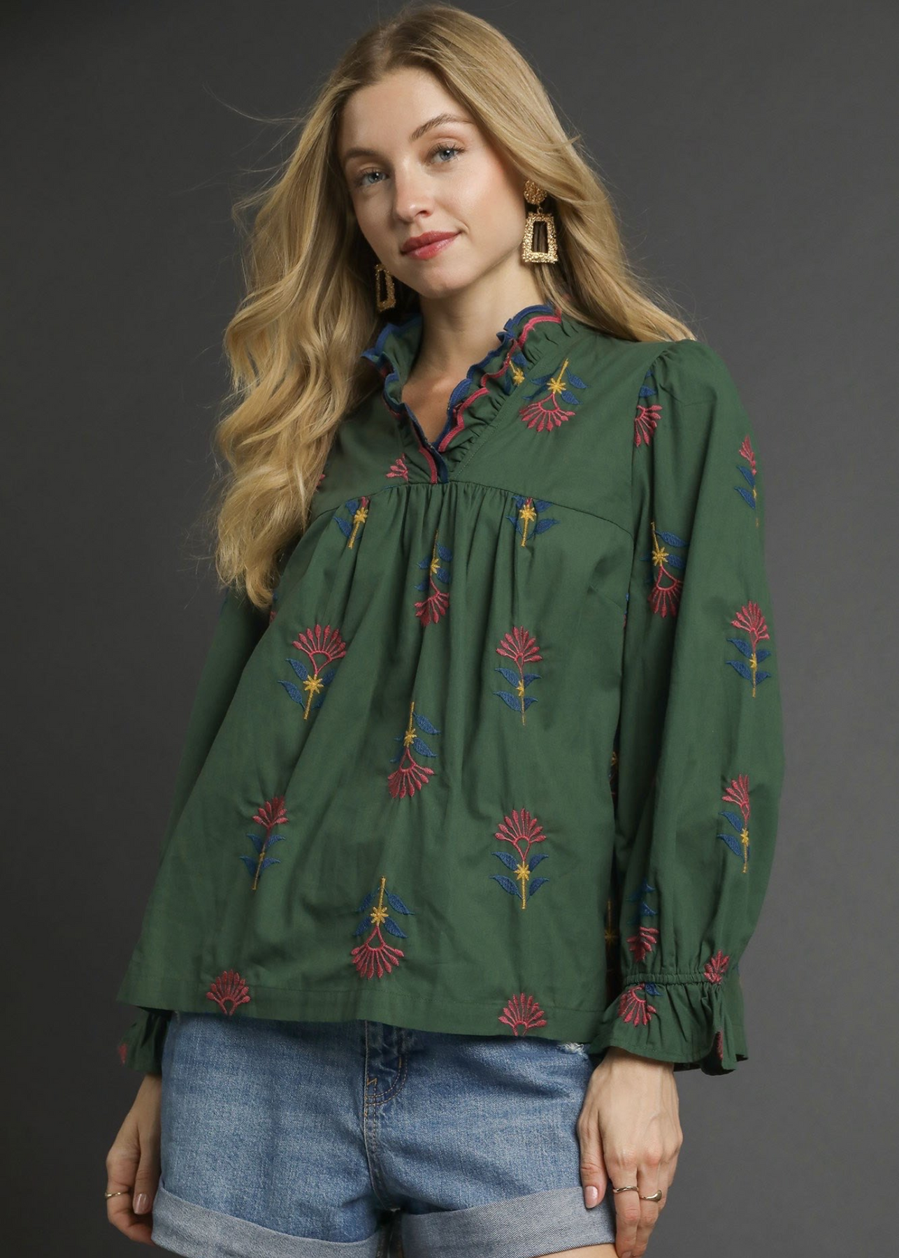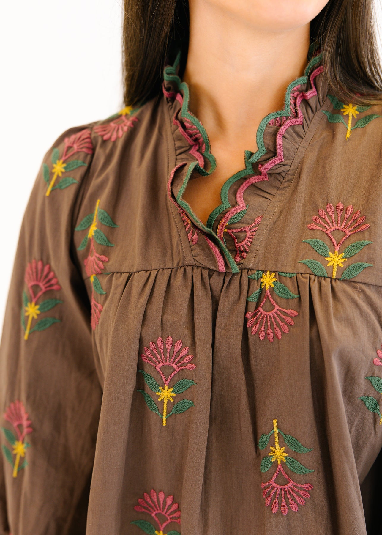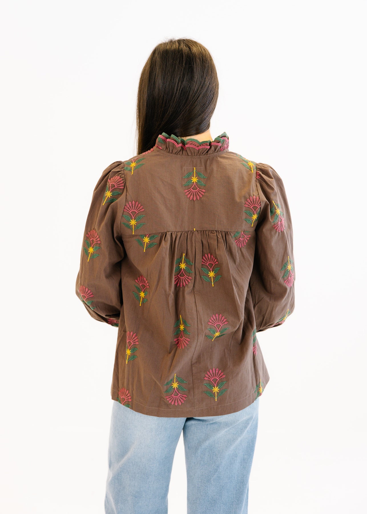 The Audrey Floral Ruffle Neck Blouse is a charming piece with intricate floral embroidery that brings a touch of elegance to your everyday style. Featuring a ruffled neckline and gathered details, this blouse offers a flattering, relaxed fit. The long sleeves are finished with gentle ruffle cuffs, adding a feminine and graceful touch. Perfect for pairing with jeans for a casual day out or dressing up with a skirt for a polished look.