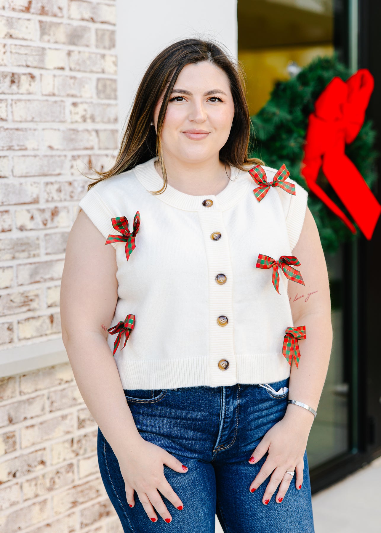 Regular price $ 58.00Sweet with a hint of playful charm, the Bow Detail Knit Vest is a cozy-meets-cute essential for the season. Designed with a soft knit fabric and front button-down closure, this sleeveless piece features adorable plaid ribbon bows along the sides for a festive touch. The relaxed fit makes it perfect for layering over blouses or long sleeves, adding a dose of personality to your outfit without sacrificing comfort.