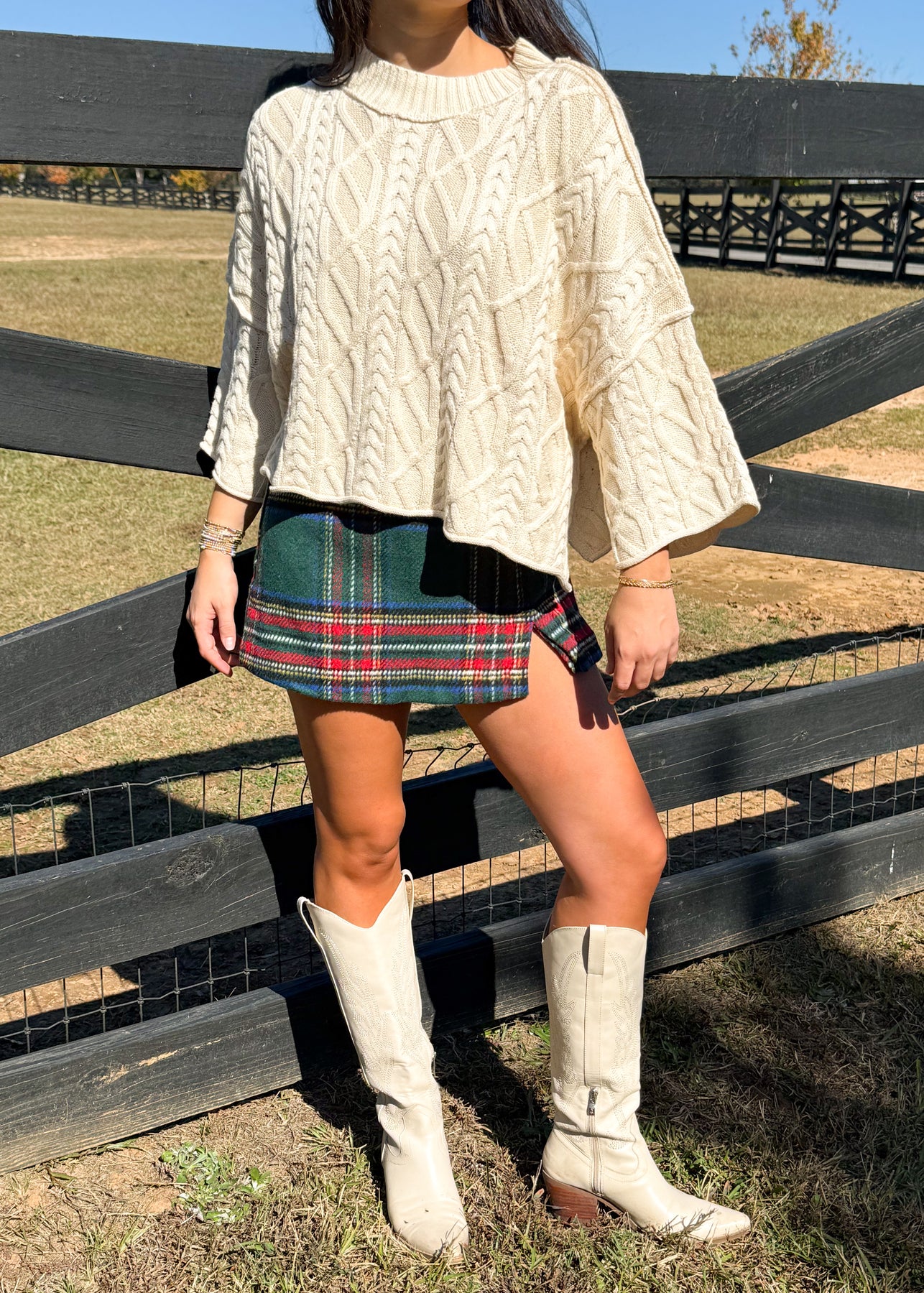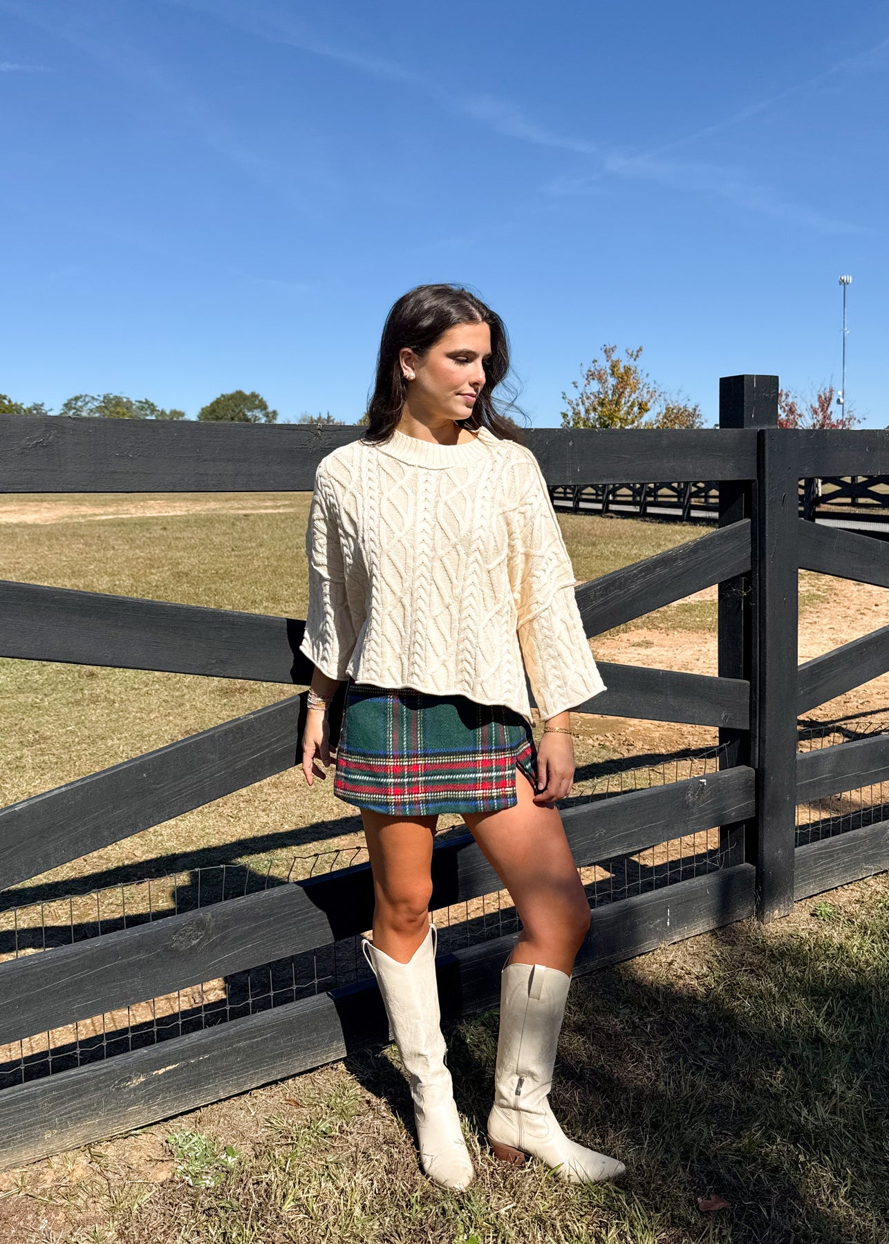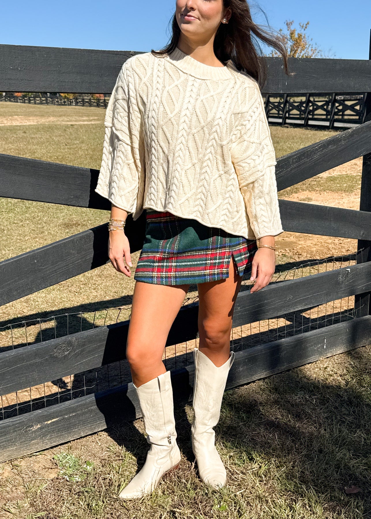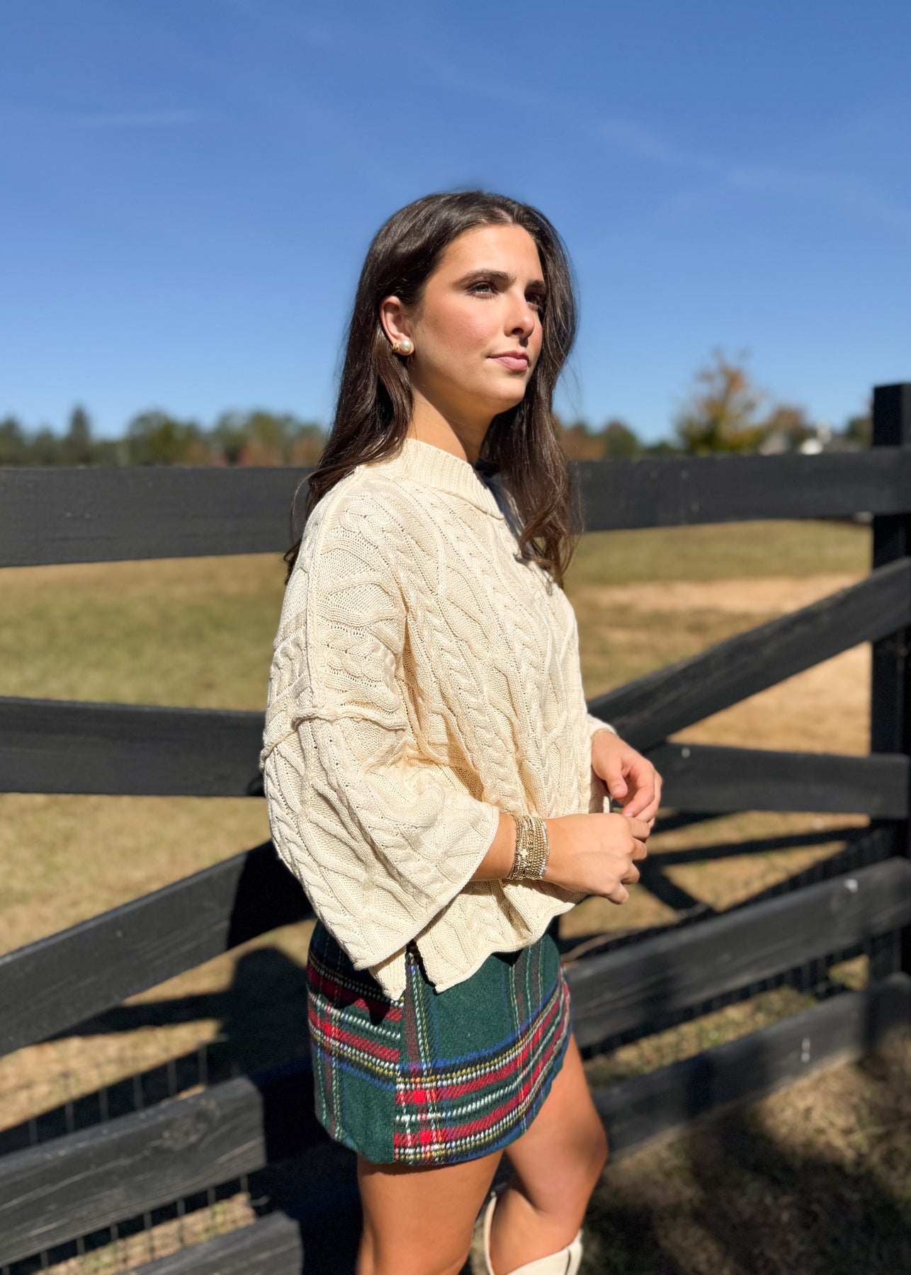 Refresh your knitwear collection with this chic cable knit cropped sweater. Designed with a classic cable pattern, this sweater offers timeless style with a modern cropped silhouette. The wide, relaxed sleeves and slightly boxy fit make it perfect for layering over tanks or pairing with high-waisted jeans and skirts for a balanced look.