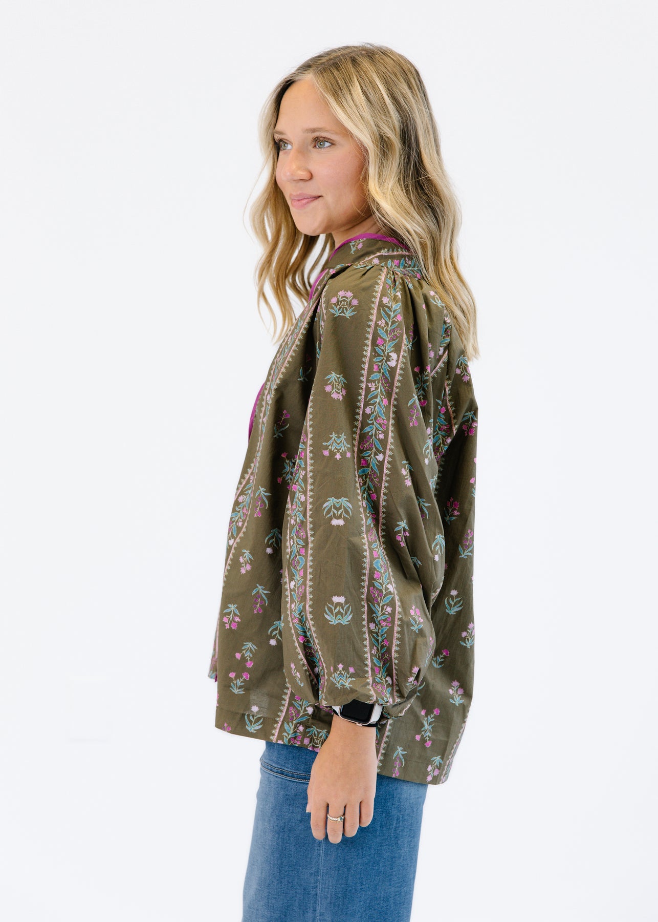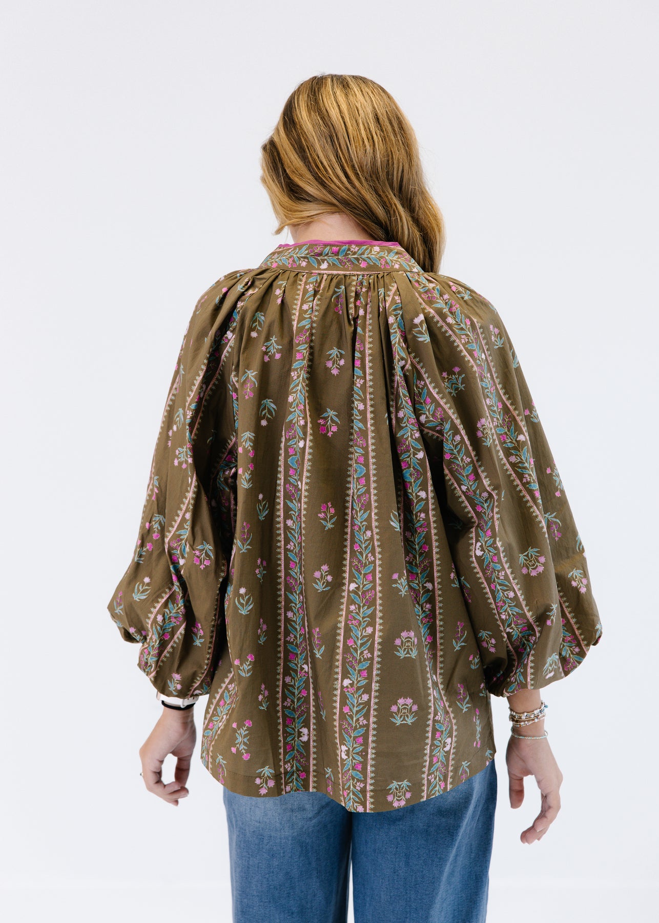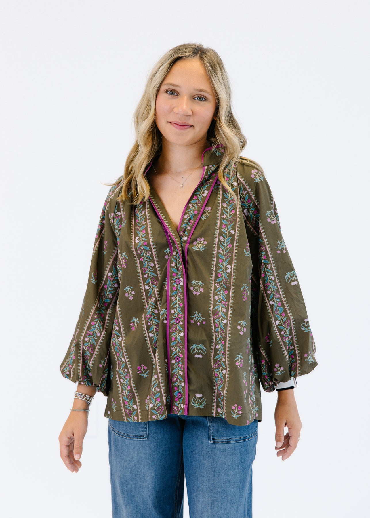 A polished update to a classic silhouette, this printed V-neck top is designed with a button-down front and contrast piping for a refined touch. The lightweight, unlined construction makes it ideal for layering or wearing solo, while the tailored details elevate its everyday wearability. Perfect for pairing with skirts, trousers, or denim, this piece transitions seamlessly from work to weekend.