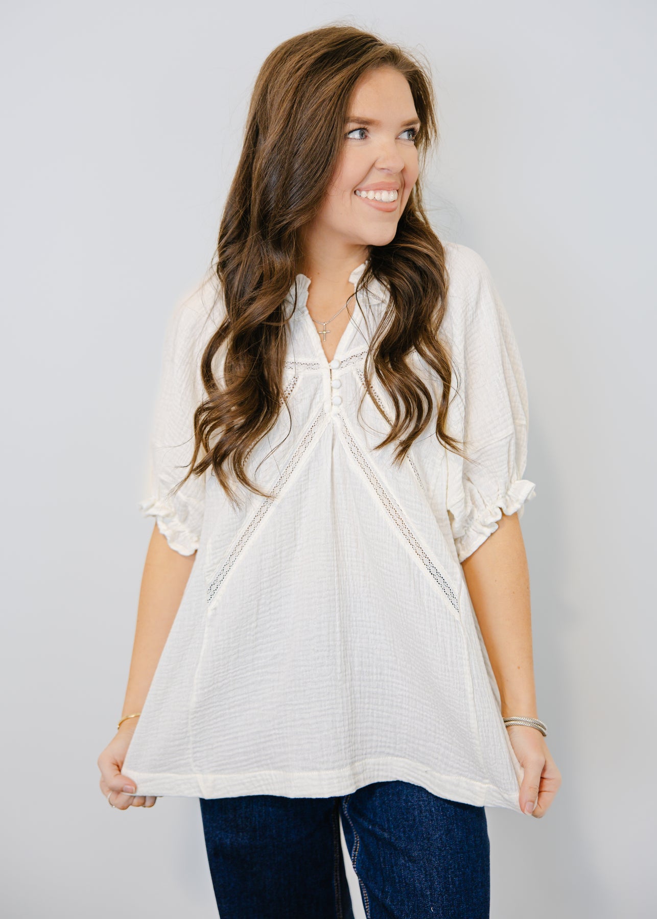 Regular price $ 52.00This cotton gauze top is all about easy texture and soft detail. Designed with a lightweight, breathable feel, it features a relaxed silhouette that drapes beautifully without feeling oversized. The subtle ruffle accents along the neckline and sleeves add a touch of charm while keeping the look wearable for everyday plans.