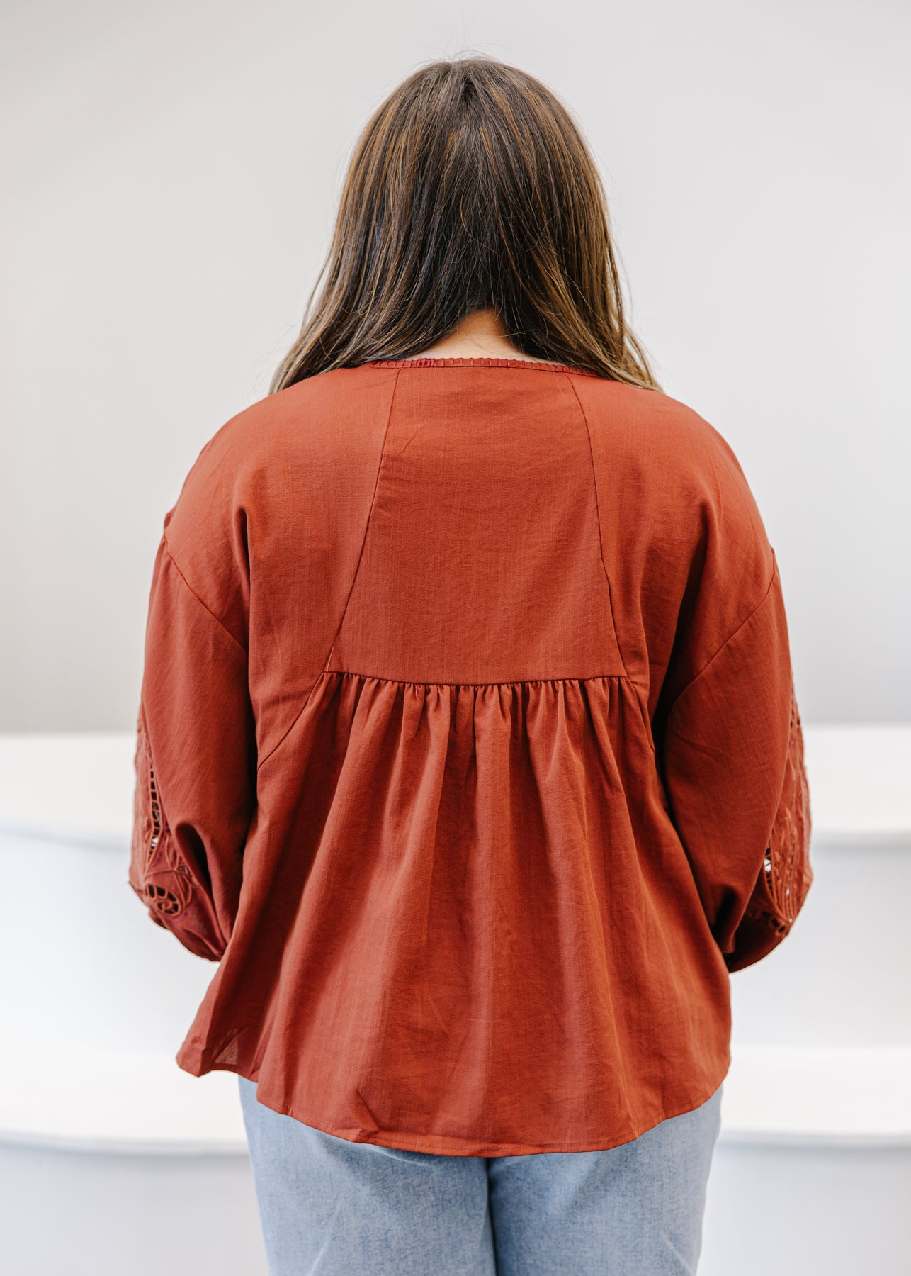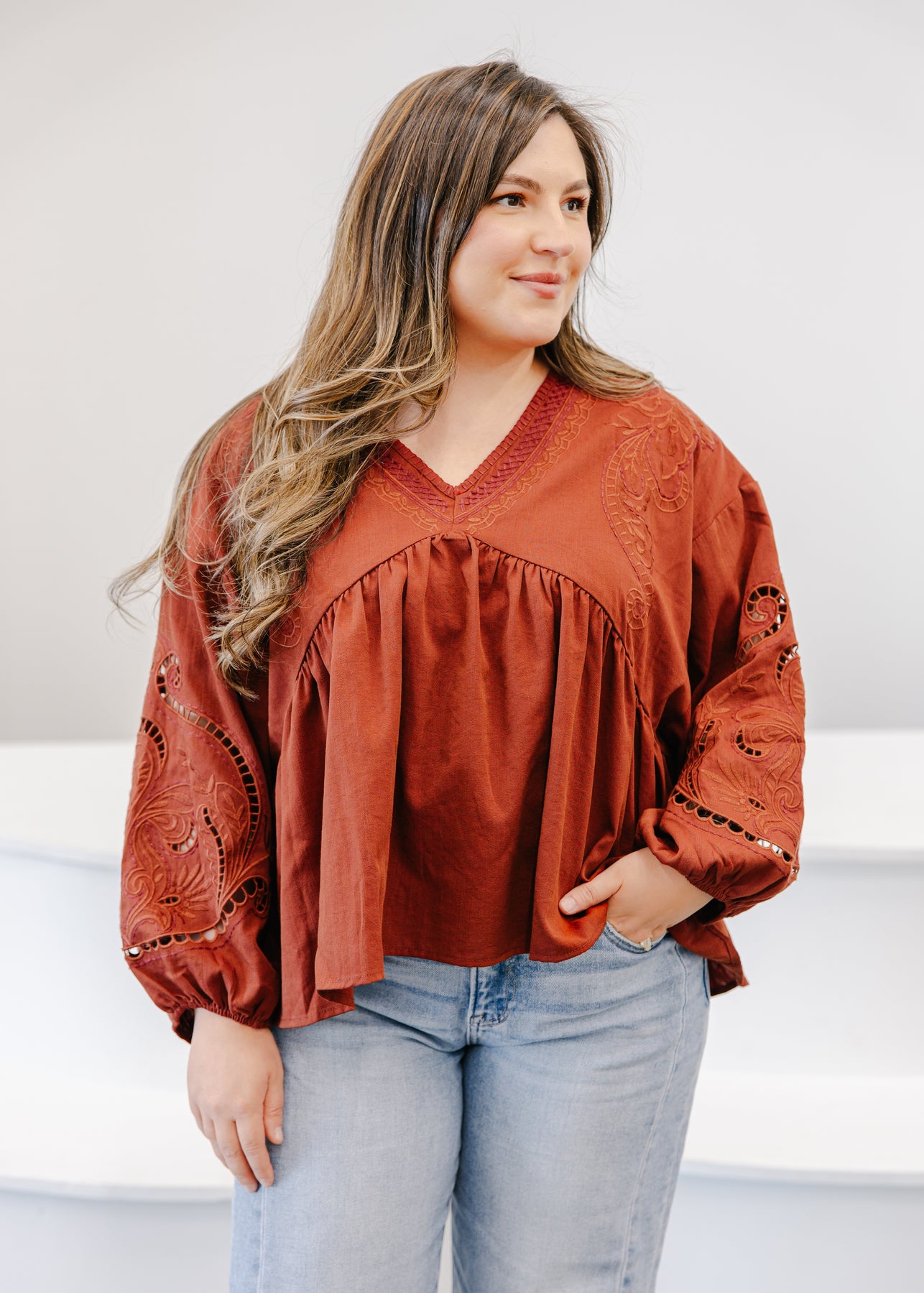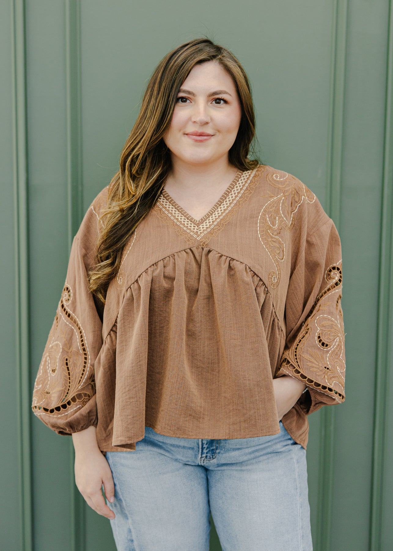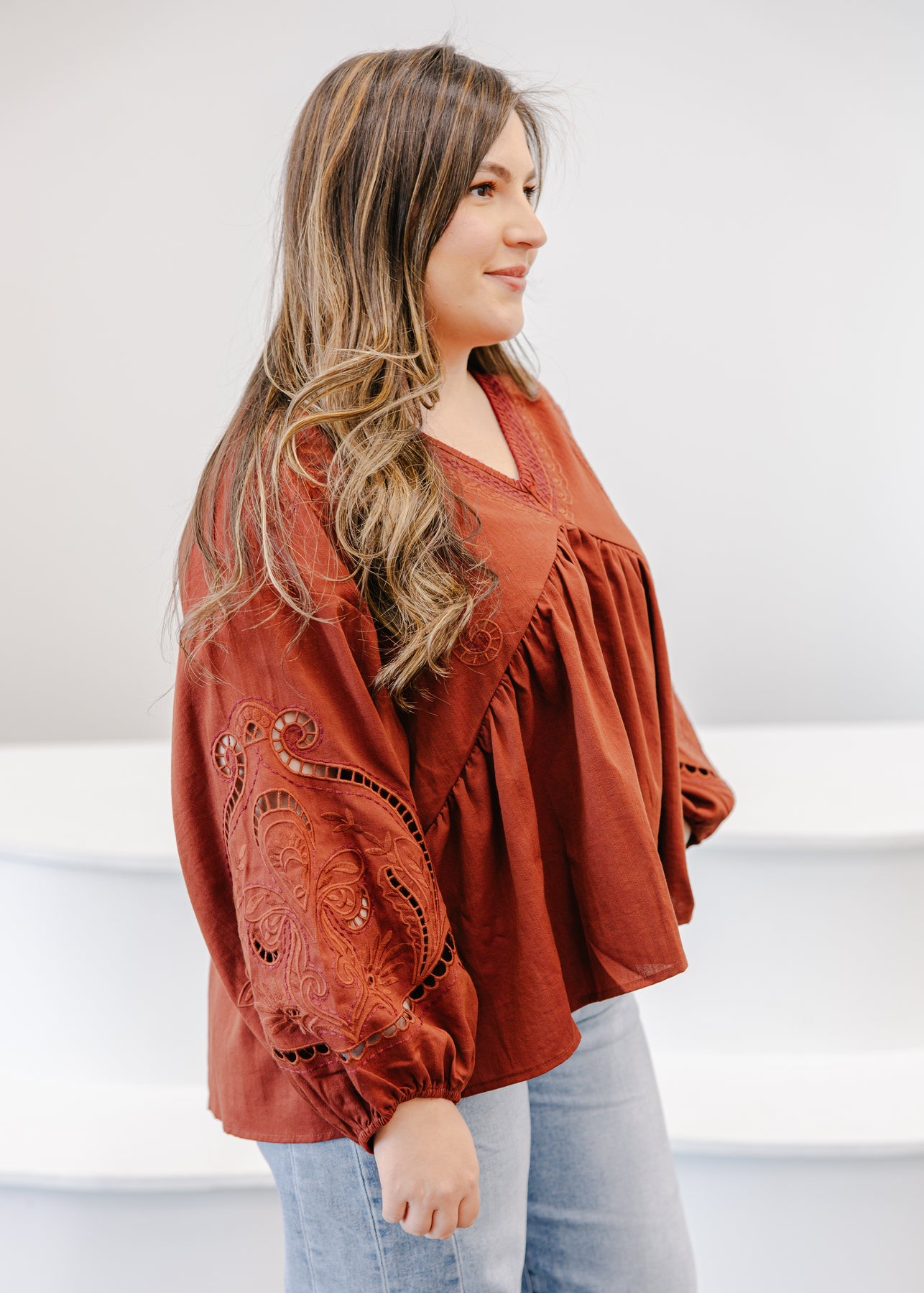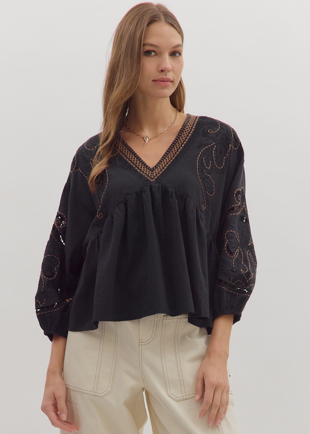 The Embroidered V-Neck Peplum Top blends elegance with everyday ease. Designed with a relaxed fit and a soft peplum flare, it flatters every shape while keeping things effortlessly chic. The detailed embroidery and cutout accents along the sleeves and neckline add a touch of artisanal charm that stands out without trying too hard.