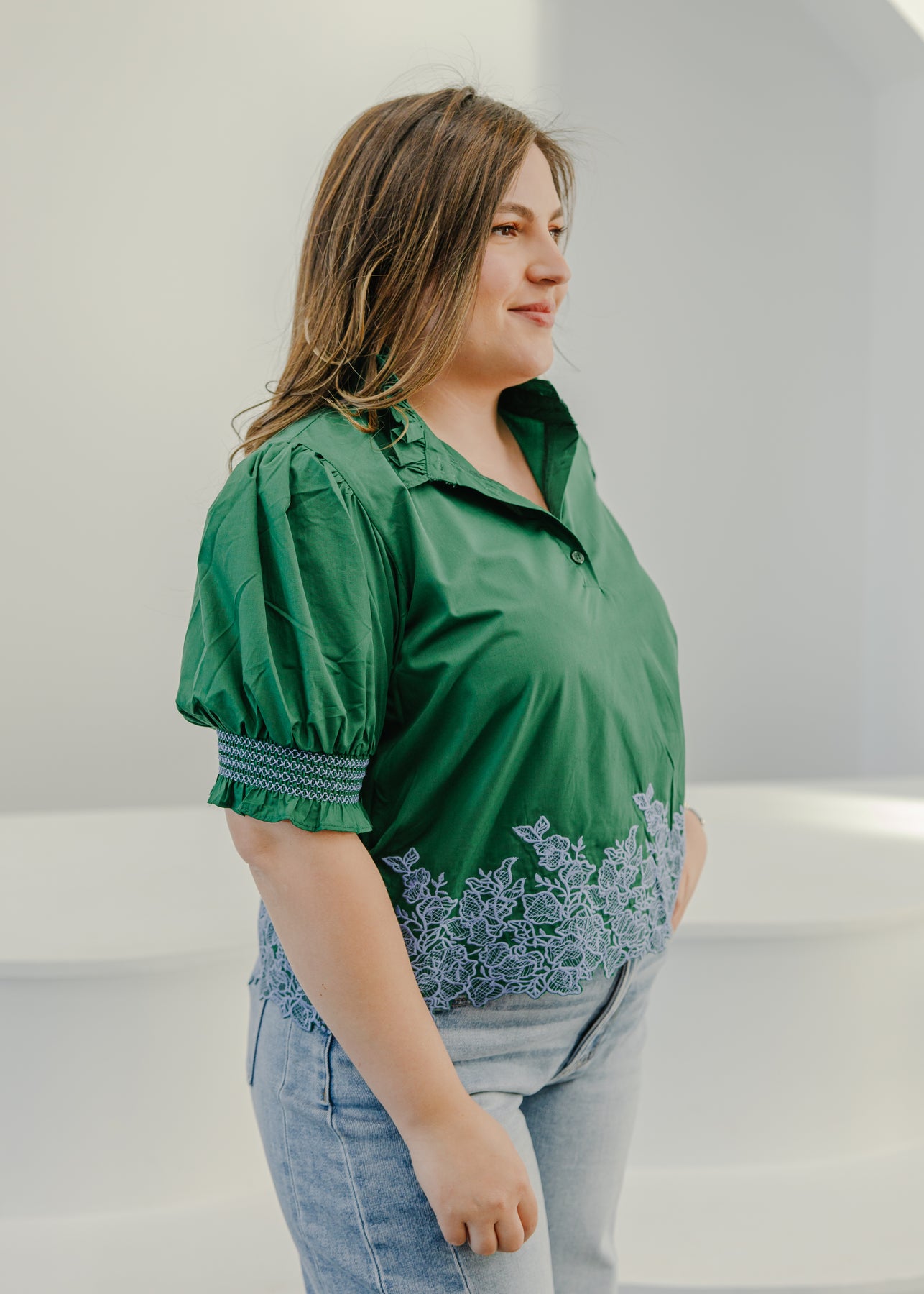 Regular price $ 46.00This stylish top features delicate floral lace embroidery along the hem, adding a feminine touch to its structured design. The puff sleeves with smocked detailing and ruffled edges bring a charming, vintage-inspired vibe, while the high neckline with button closure completes the look. Perfect for dressing up casual outfits or pairing with tailored pieces for a polished ensemble.