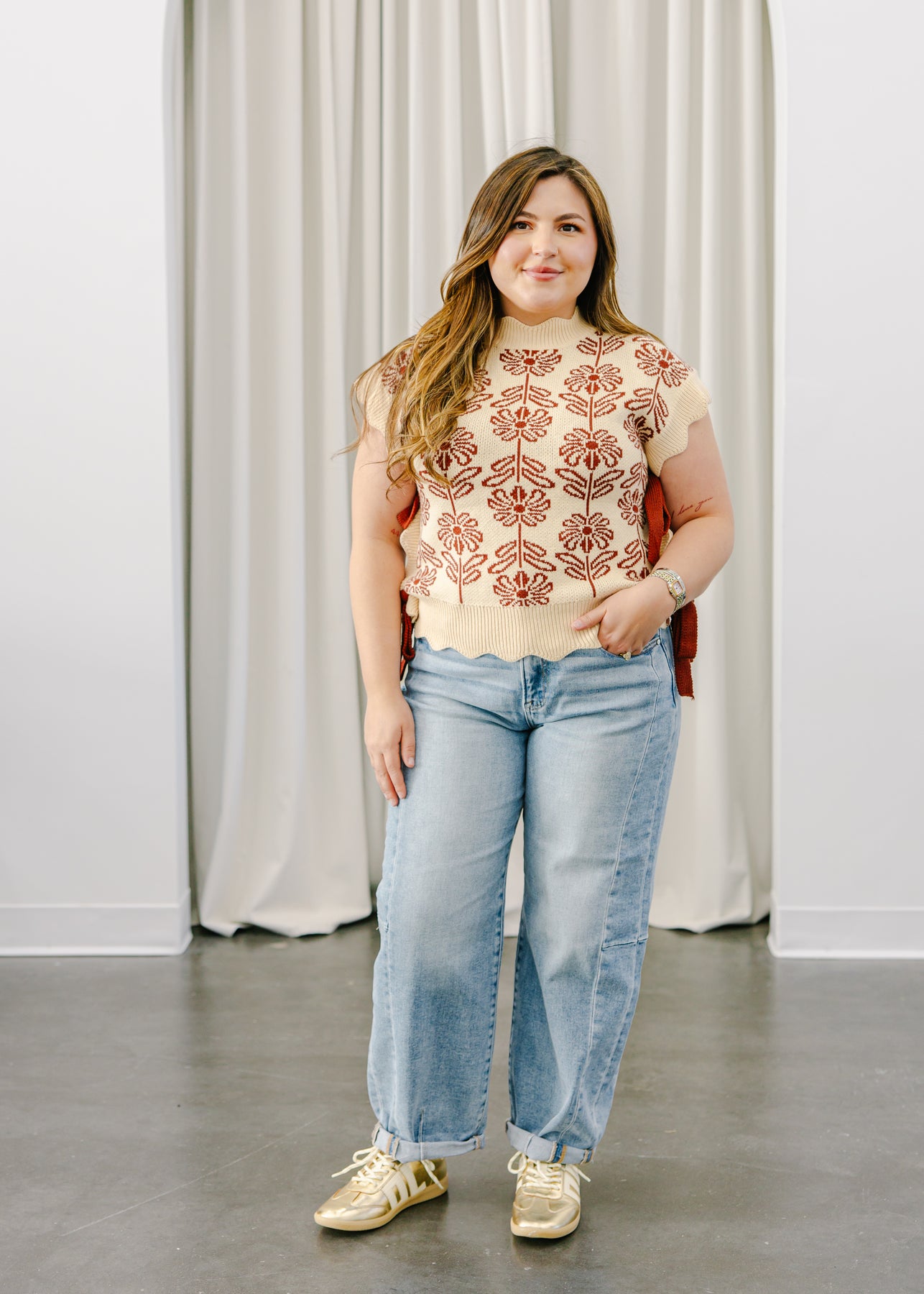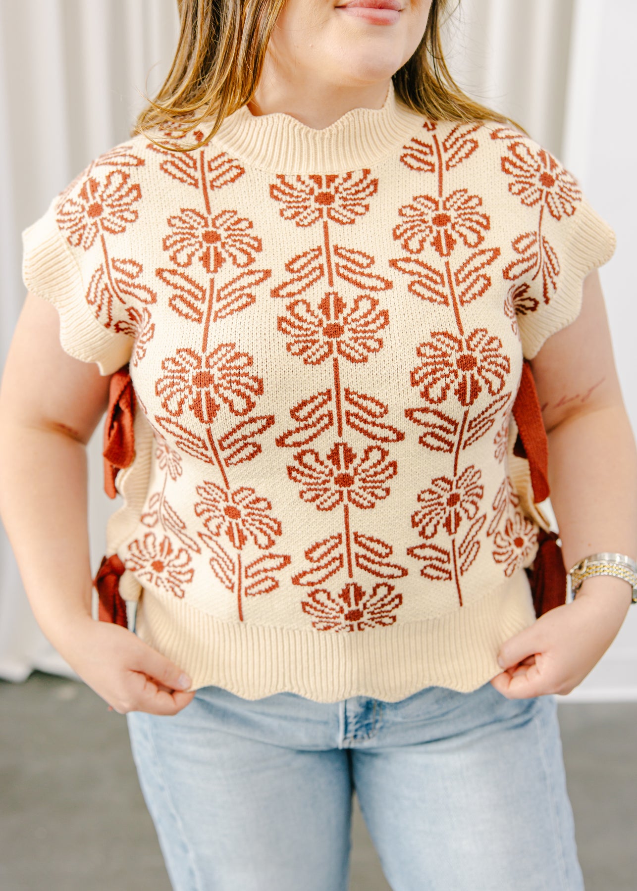 Regular price $ 54.00This knit vest features a charming floral pattern with scalloped edges and side tie details for a playful, feminine twist. The soft, midweight knit offers a cozy yet breathable feel, while the sleeveless design makes it perfect for layering over shirts or wearing on its own. A blend of retro inspiration and modern flair that adds personality to any look.