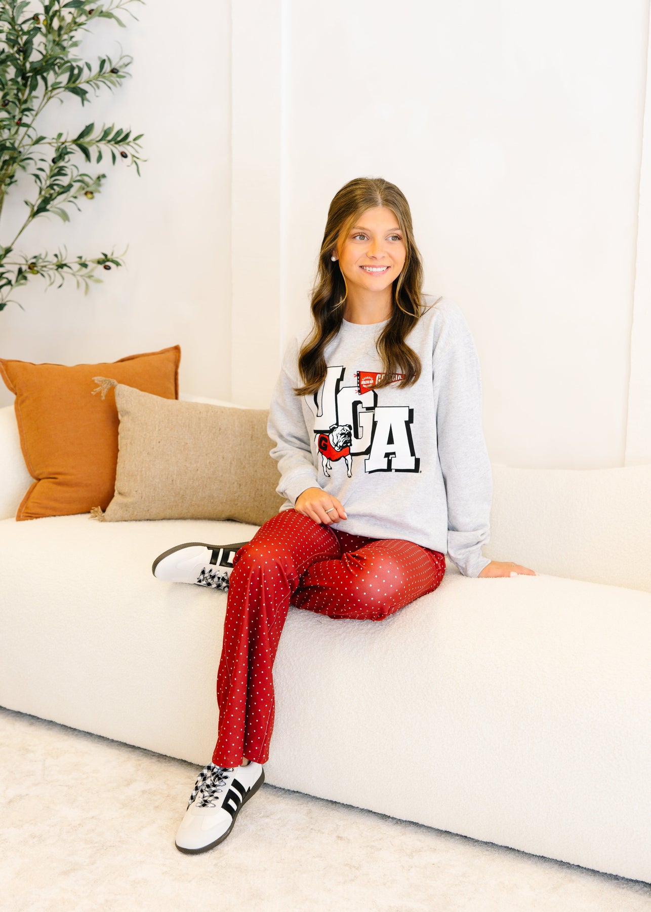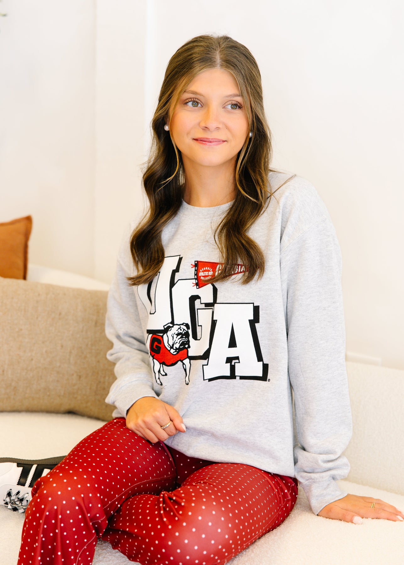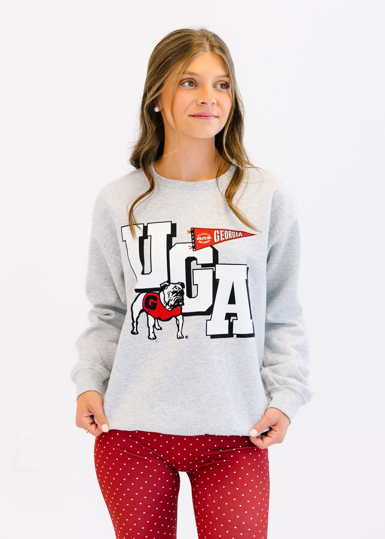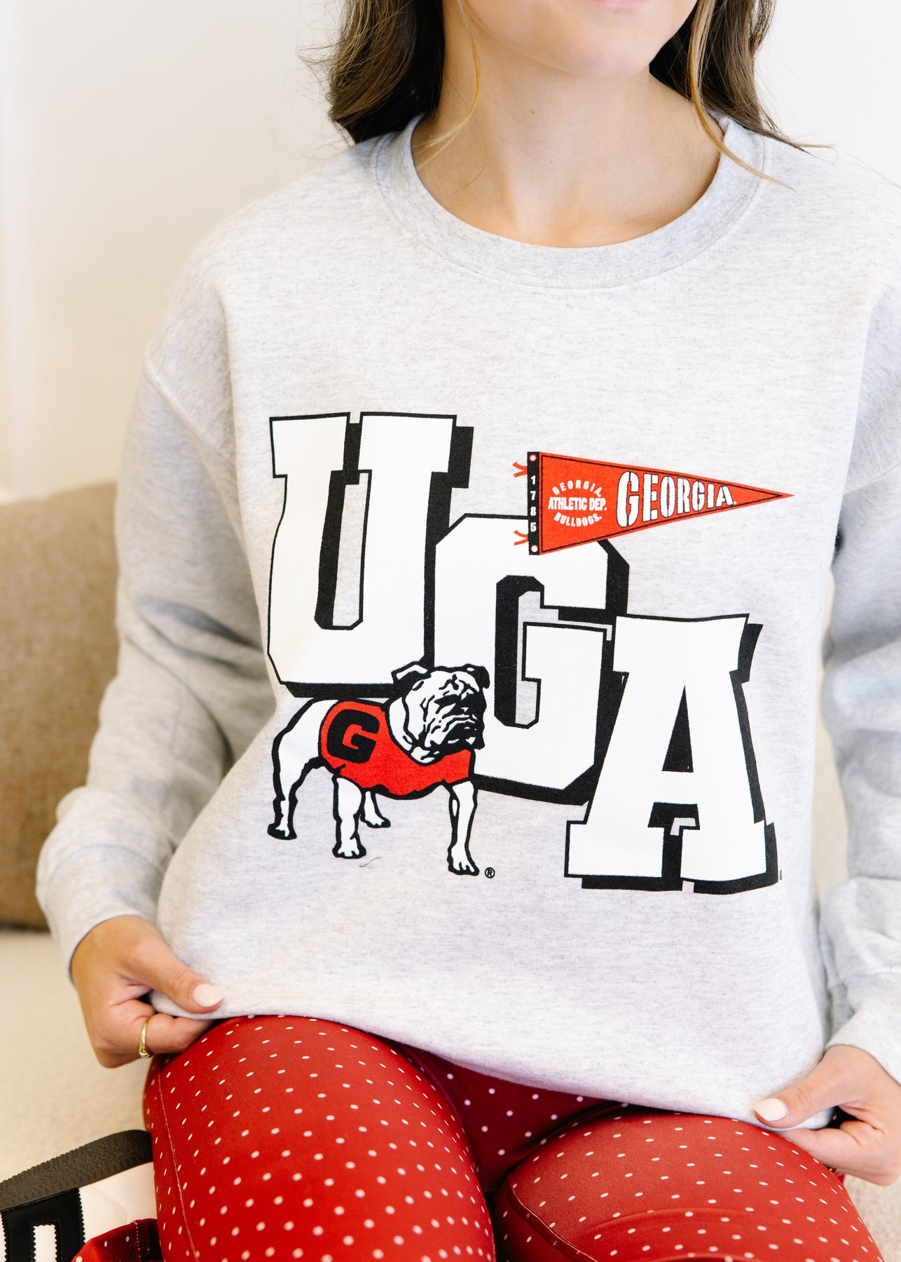 Show your Georgia pride with this timeless ash grey sweatshirt featuring a vintage-style pennant and iconic bulldog design. Perfect for game days or casual wear, it combines comfort with classic fan spirit, making it an essential addition to your wardrobe. Stay cozy while showcasing your team loyalty in style.