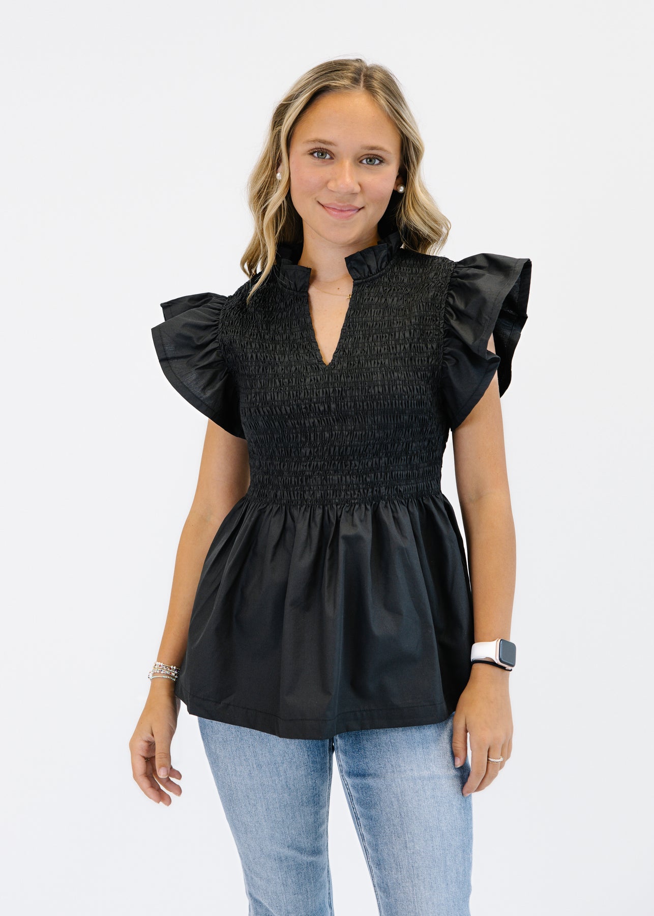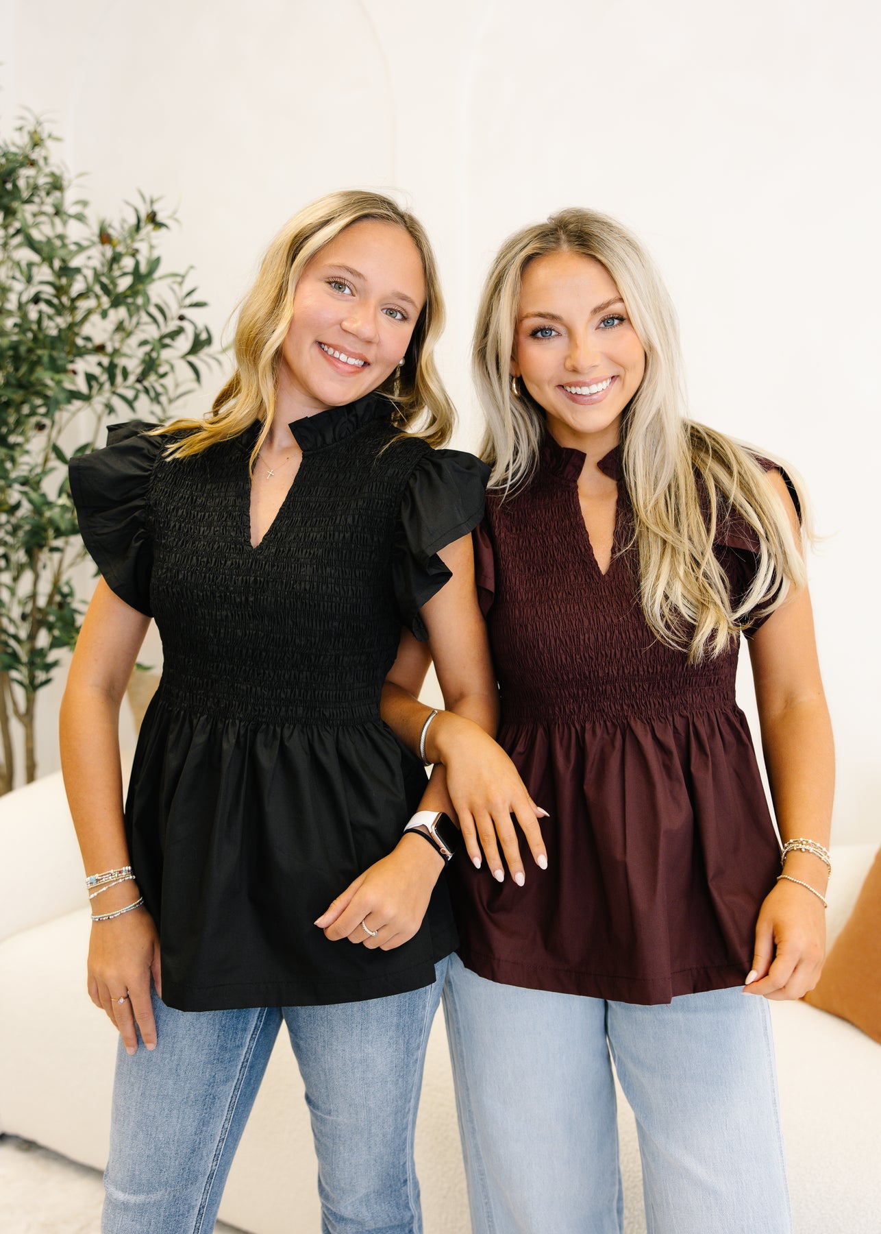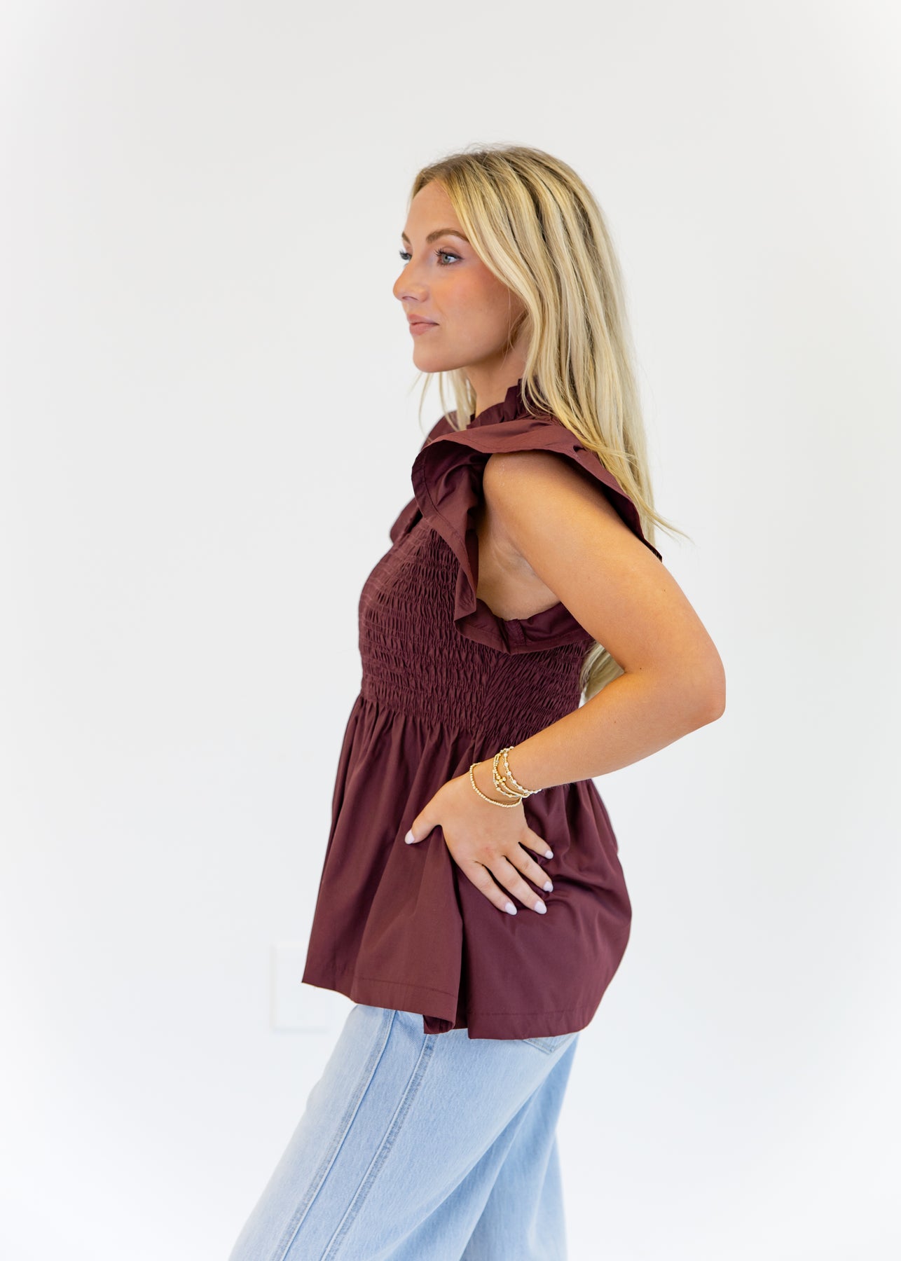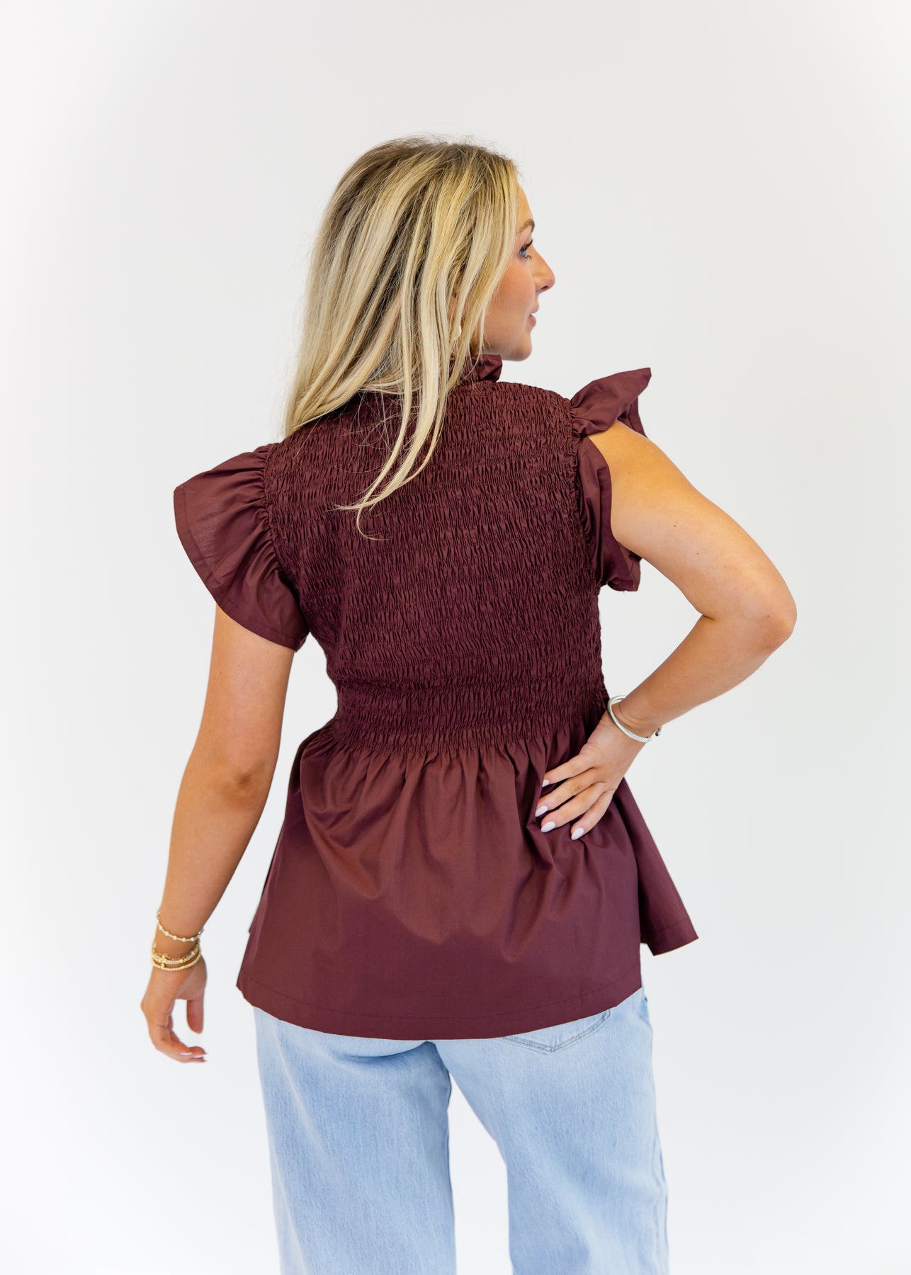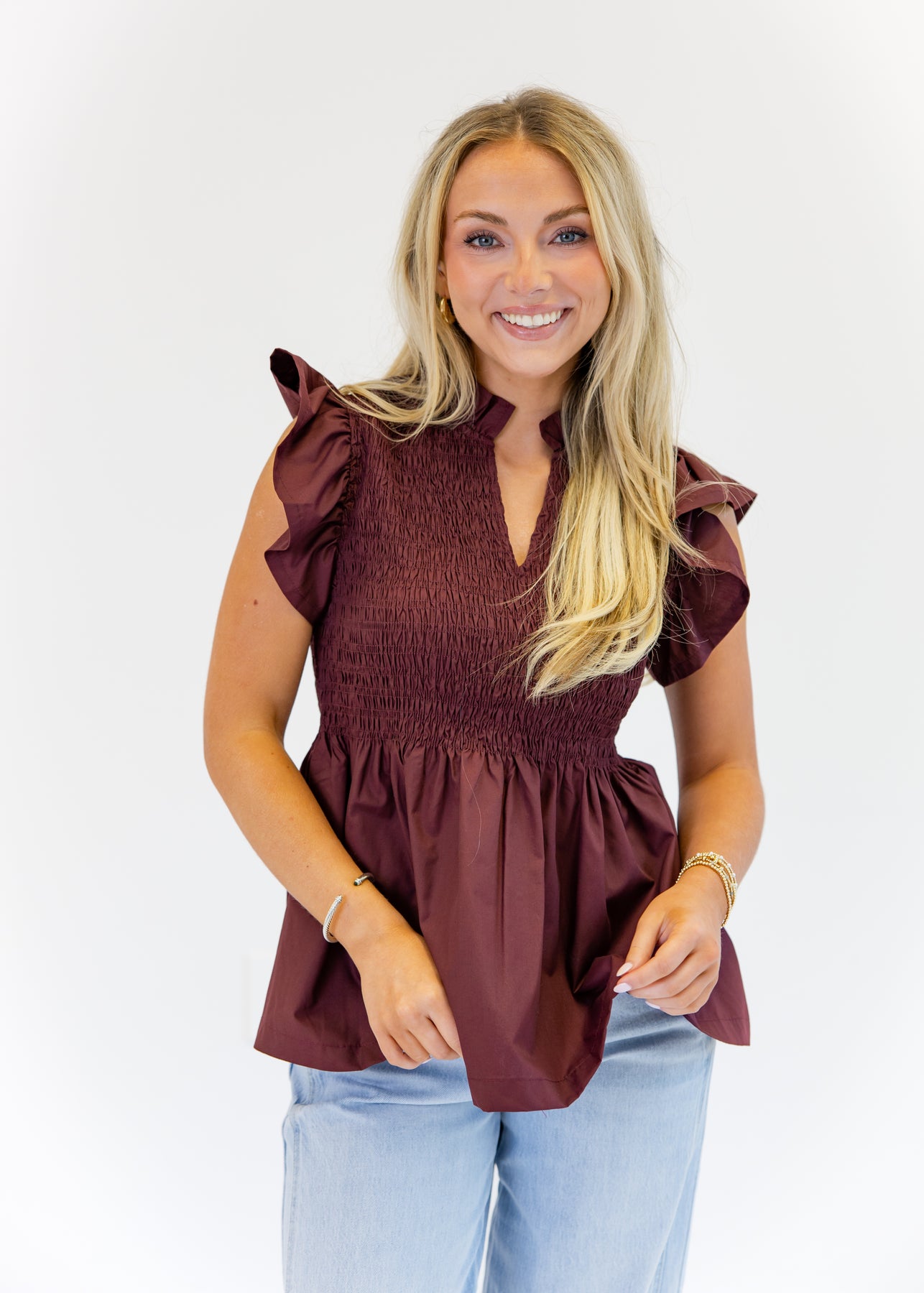 The Hannah Flutter Sleeve Top blends romantic charm with everyday style. Featuring a flattering smocked bodice, this top creates a fitted yet comfortable silhouette. The flutter sleeves and ruffled neckline add a feminine touch, while the flowy hem offers a relaxed finish. Perfect for pairing with jeans or skirts, this burgundy top transitions seamlessly from casual outings to dressier occasions.