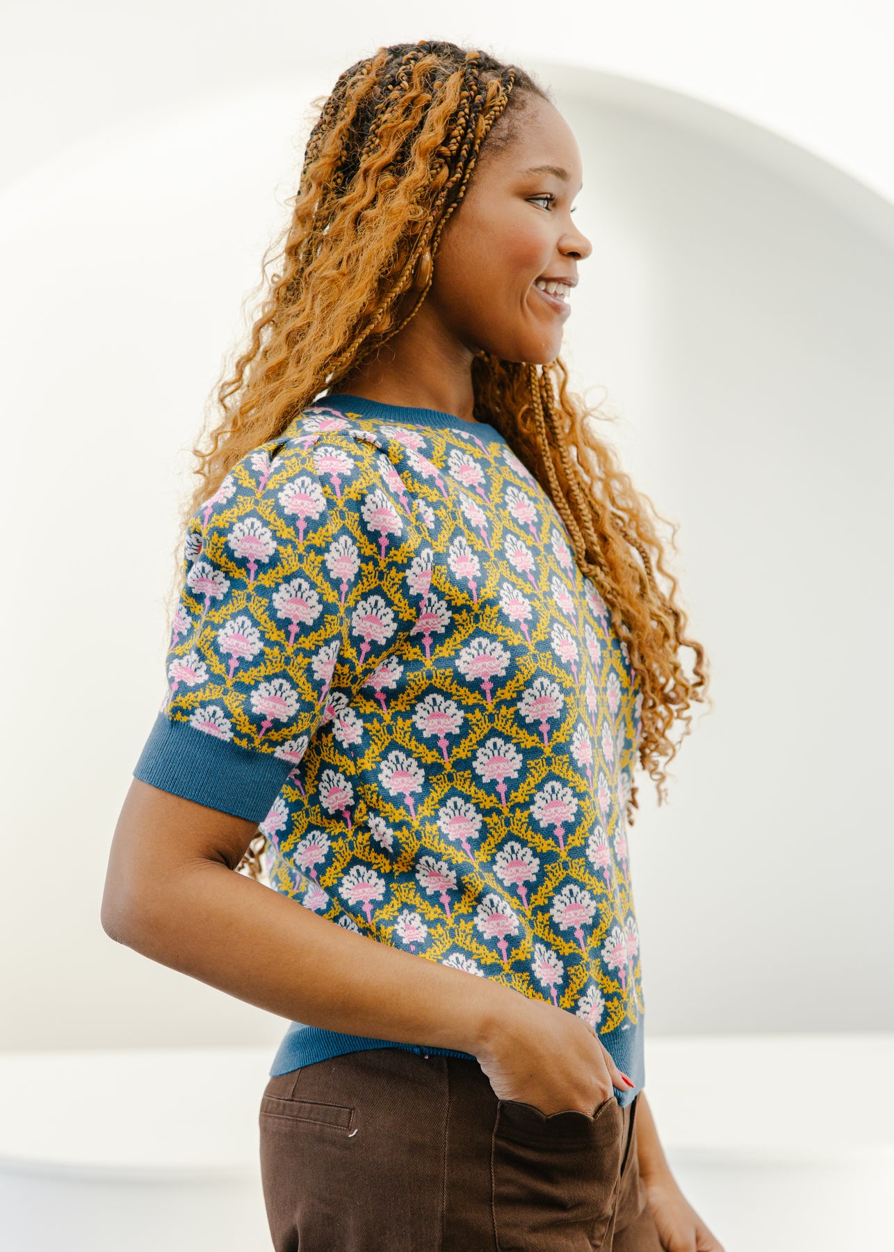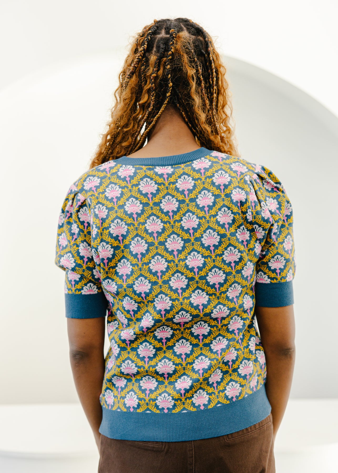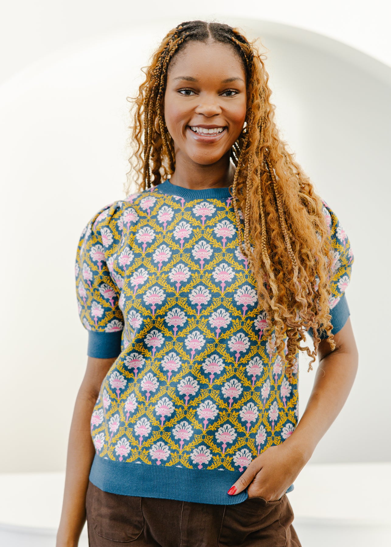 Regular price $ 48.00This jacquard knit sweater showcases a retro-inspired floral pattern in rich, contrasting tones. Designed with short sleeves and ribbed trim at the neckline, cuffs, and hem, it combines structure with softness for an easy, flattering fit. The midweight knit makes it ideal for transitioning between seasons—pair it with denim for casual days or layer under a blazer for a more polished look.