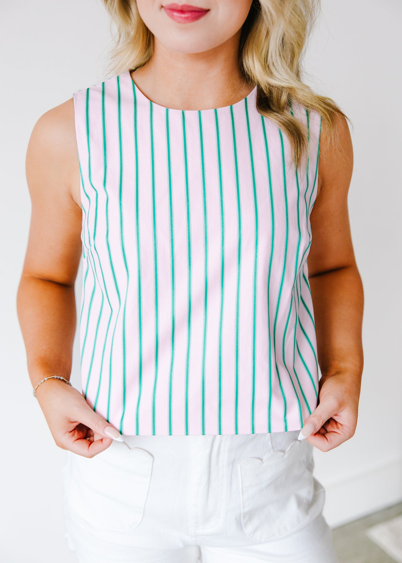 Clean lines meet playful polish in the Laura Striped Sleeveless Top. Designed with a modern high neckline and an easy, slightly cropped silhouette, this piece delivers that perfectly balanced look of tailored yet relaxed. The vertical stripe pattern elongates the frame while adding a fresh, eye catching detail that feels crisp and current.