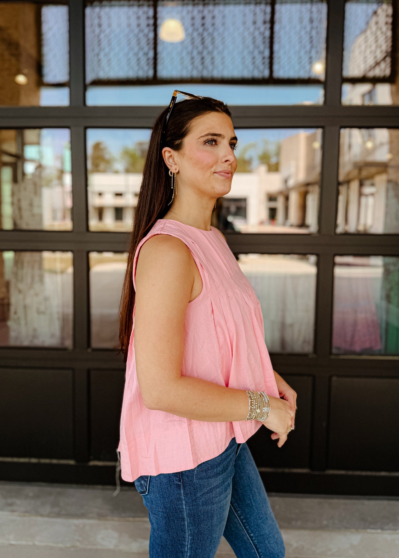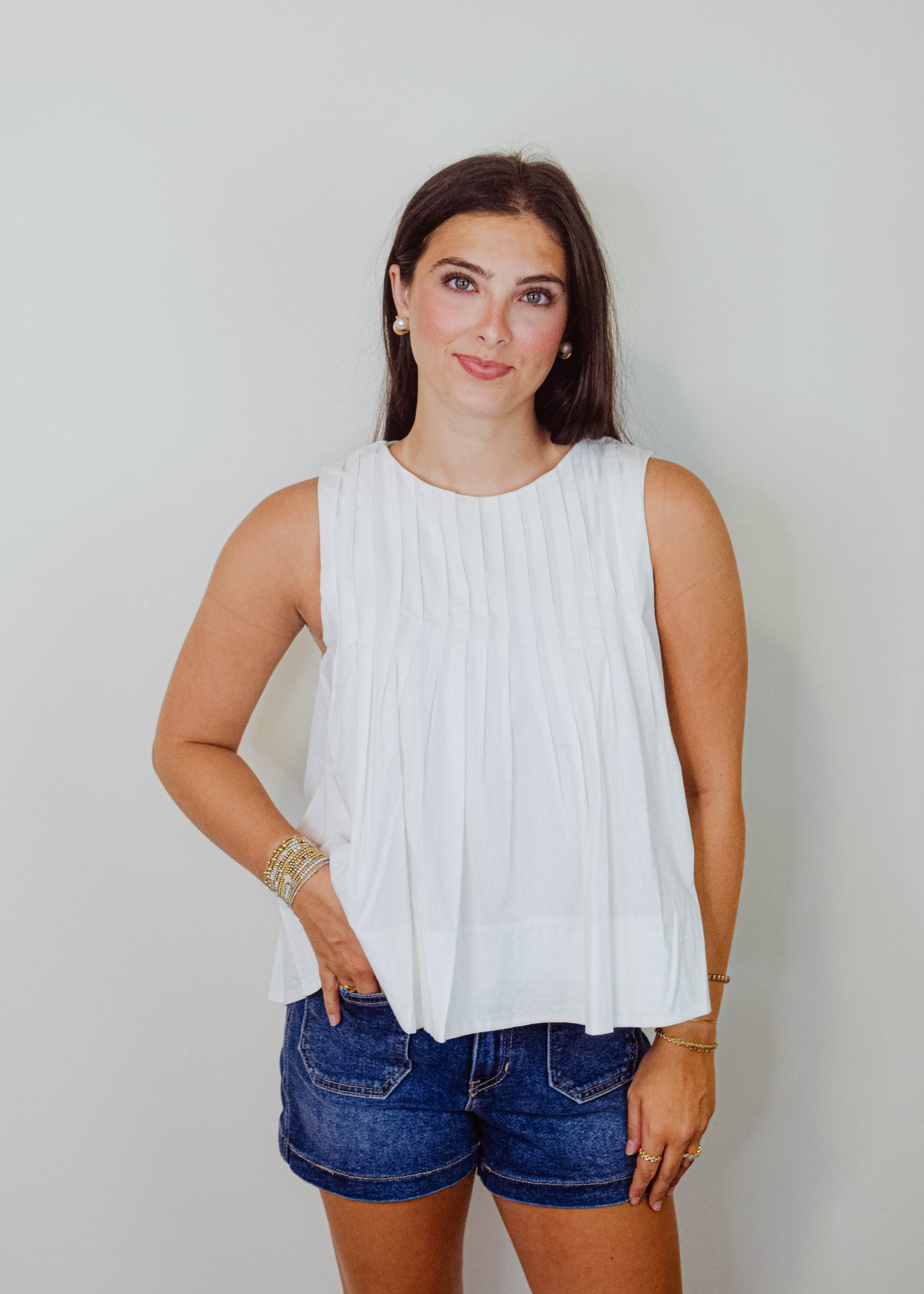 A stylish sleeveless top with a flattering A-line silhouette. Designed with delicate pleats that add texture and movement, this versatile piece is perfect for layering or wearing on its own. Pair it with jeans for a casual look or tuck it into a skirt for a more polished outfit.