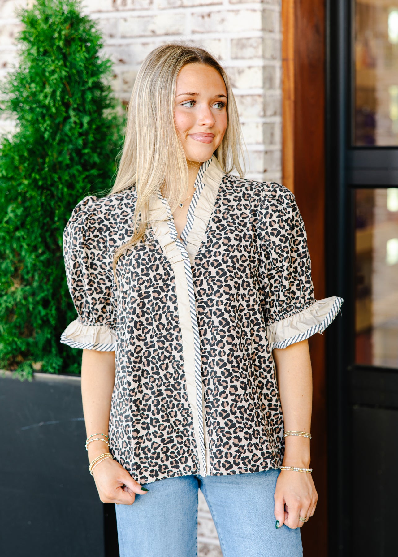 The Ruffled Animal Print Blouse brings bold style and refined femininity together in one statement piece. Featuring a striking print with striped contrast trim, this blouse stands out with its delicate ruffled neckline and sleeves that add a soft, playful touch. The puff sleeves and tailored silhouette make it both flattering and fashion-forward.