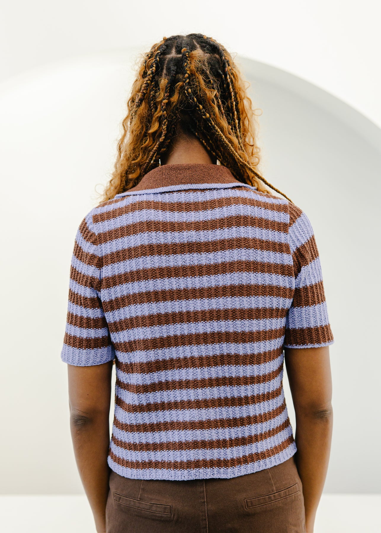 This striped button-down knit top combines retro vibes with modern style. It features a collared neckline, short sleeves, and a relaxed fit that’s perfect for casual outings or layering. The contrasting horizontal stripes and front pocket details add visual interest, making it a statement piece for any wardrobe.