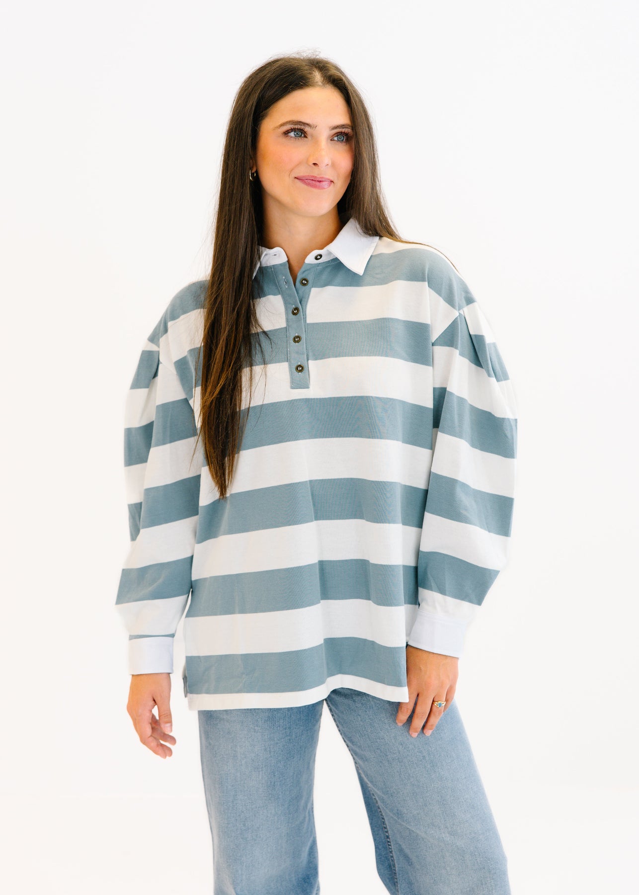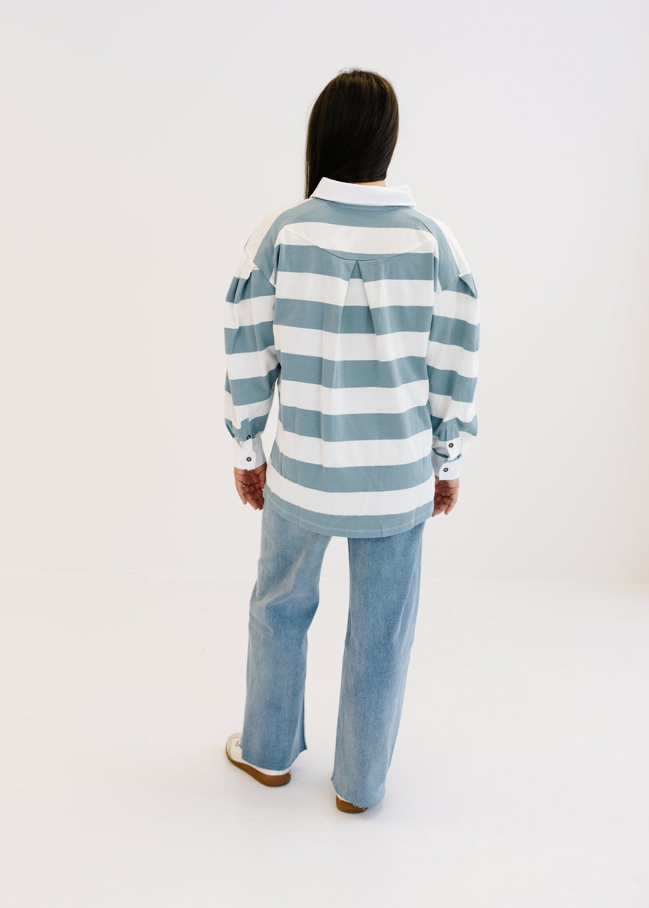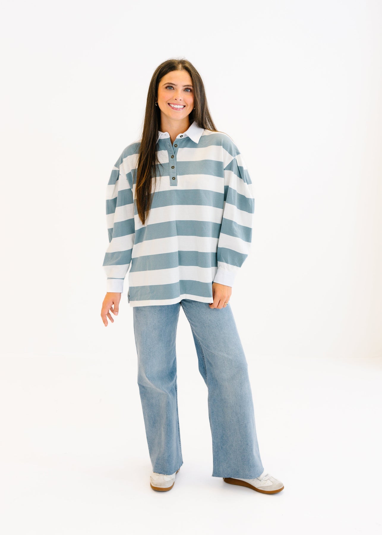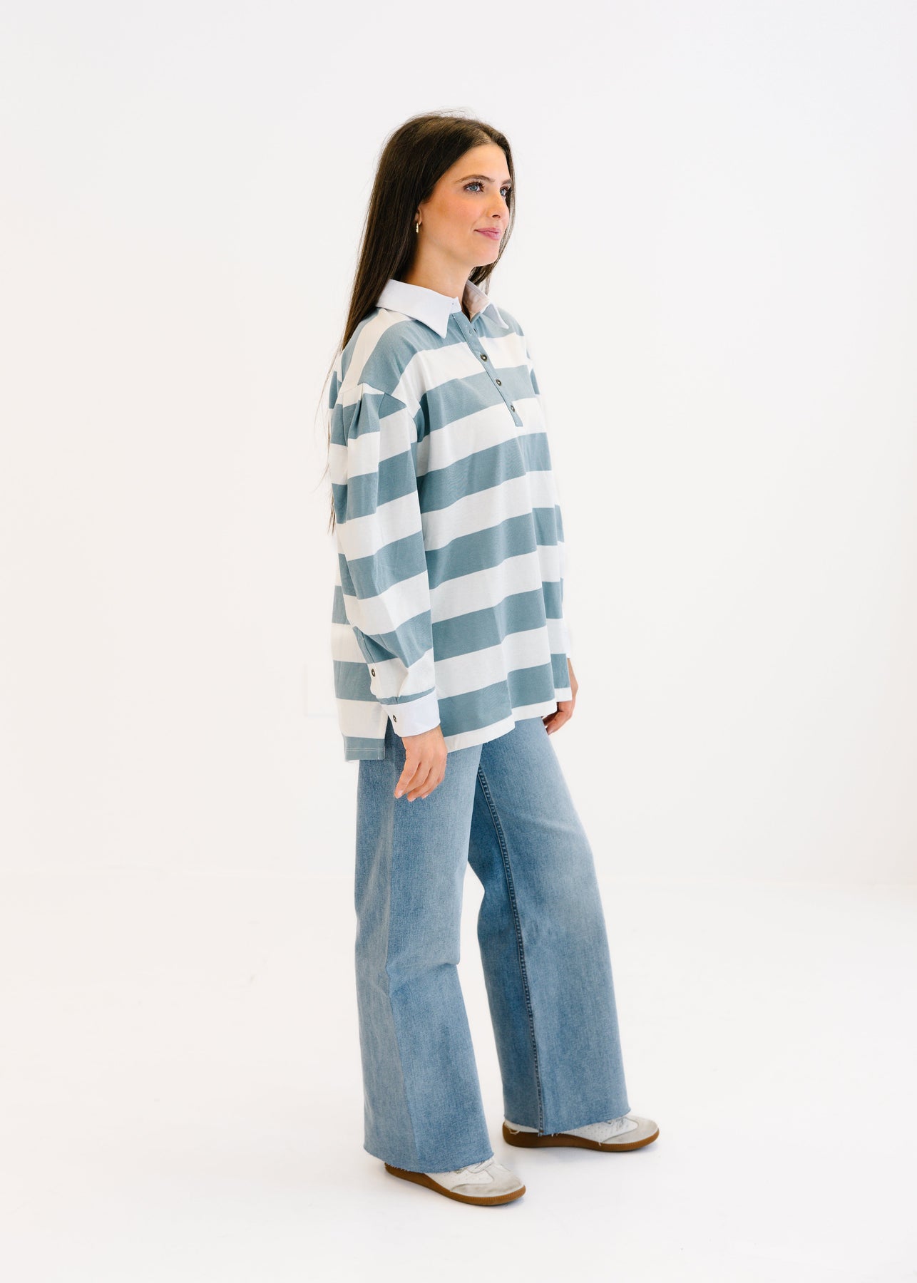 The Victoria Striped Rugby Top brings a sporty yet chic vibe to your casual wardrobe. Designed with wide blue and ivory stripes, this relaxed-fit top features a classic collared neckline with a button placket for a polished touch. The lightweight fabric and loose silhouette make it perfect for layering or wearing on its own, while the cuffed sleeves add a refined finish. Pair it with white denim or joggers for an effortlessly cool, laid-back look.