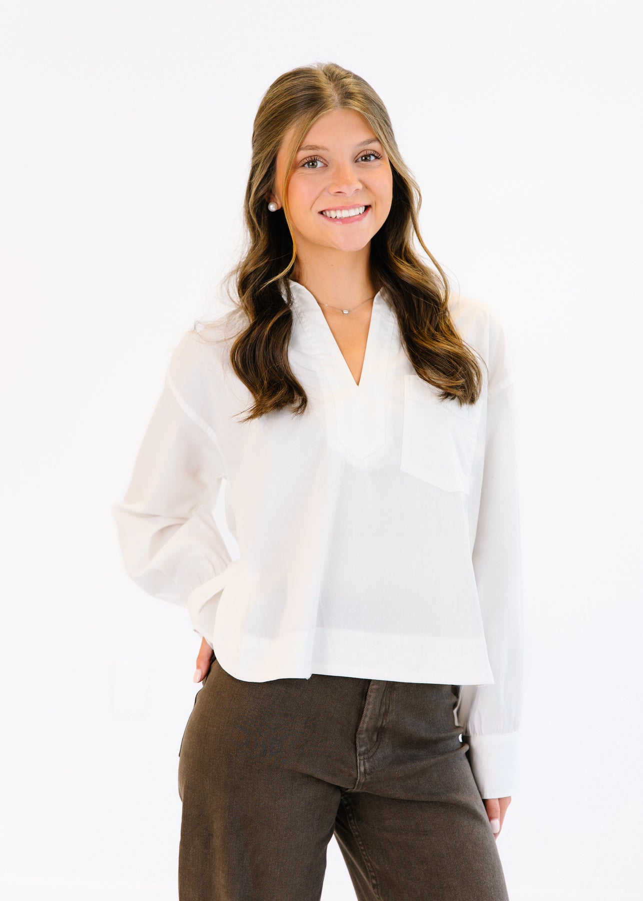 Regular price $ 46.00The Vivian Classic Popover Blouse is a wardrobe staple that blends simplicity with subtle detail. Featuring a relaxed fit with a single chest pocket, it’s designed with a split neckline that adds just the right touch of character. The long sleeves with button cuffs bring versatility, making it easy to wear tucked into tailored trousers for work or left loose with denim for a casual outing. Vivian is the kind of blouse you’ll keep reaching for—timeless, fresh, and endlessly adaptable.