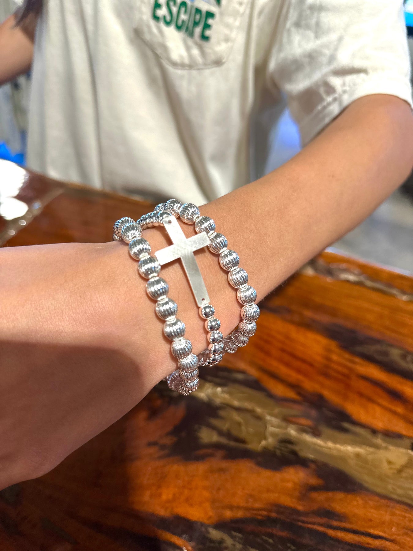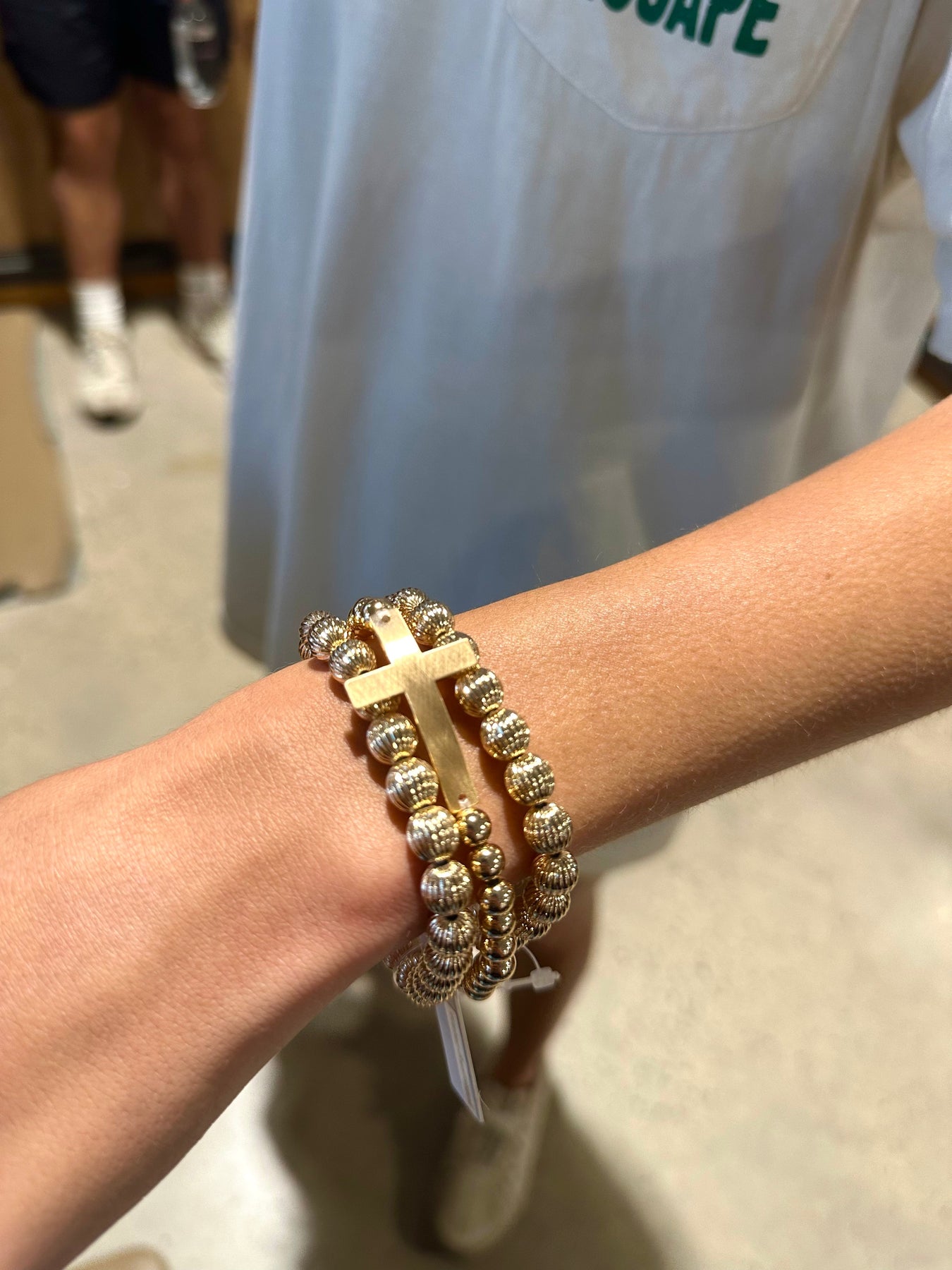 Enhance your style with our 3 row accented cross & textured ball bracelet! Add a touch of elegance and spirituality to any outfit with this unique piece. Whether worn daily or for special occasions, this bracelet will make a statement and inspire confidence in the wearer. Get yours today and elevate your look!