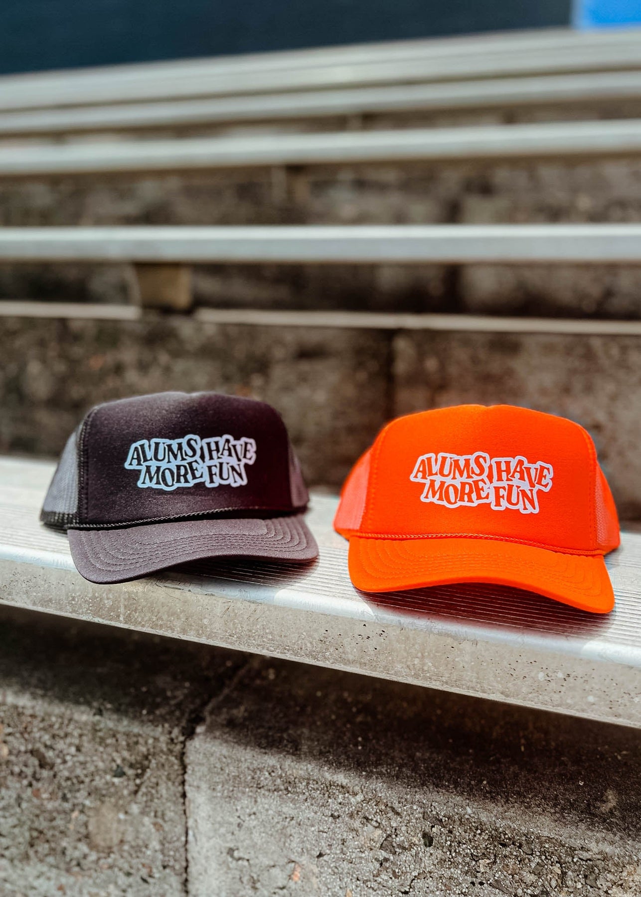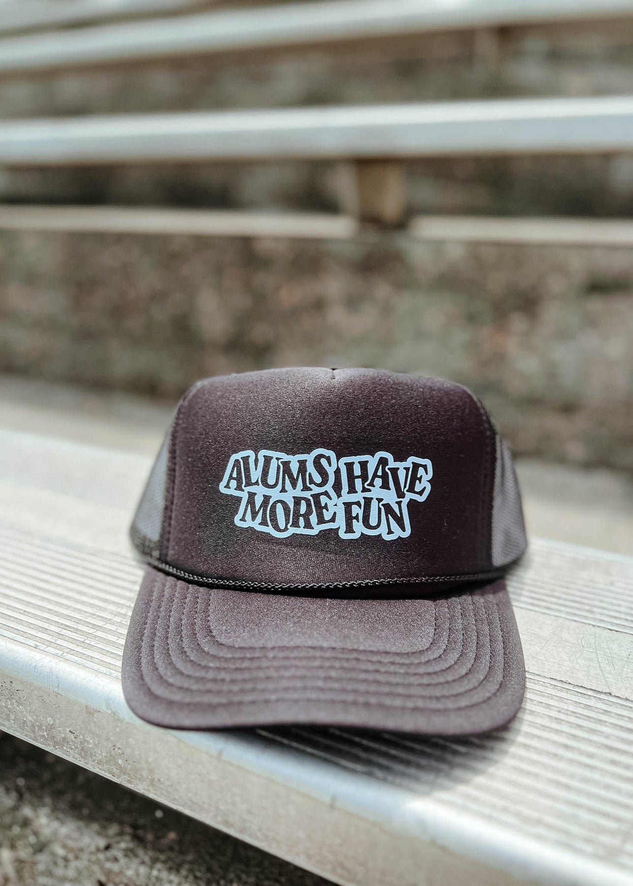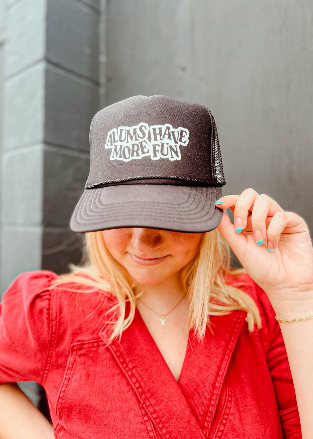 Calling all alums! This Raw & Rebellious trucker hat is the perfect accessory to complete your look this gameday season. This trucker hat features an adjustable fit, a mesh back, and "alums have more fun" printed on the front.