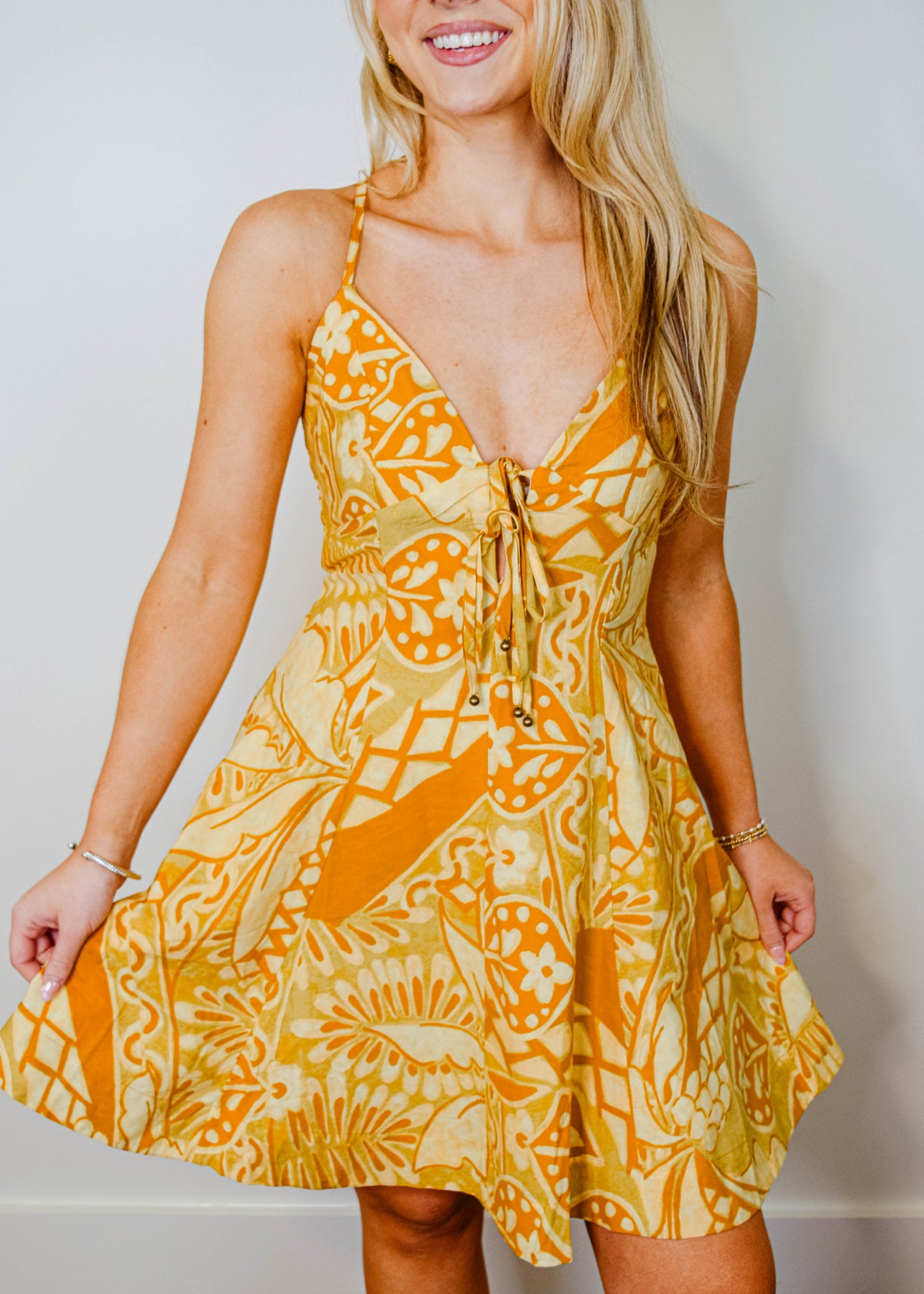 The Aubrielle Mini Dress is a chic and breezy piece, perfect for warm-weather outings. Featuring a bold print and delicate spaghetti straps, this dress offers a flattering deep V-neckline for a stylish touch. Its lightweight design ensures comfort, making it an effortless choice for both casual and dressed-up occasions.