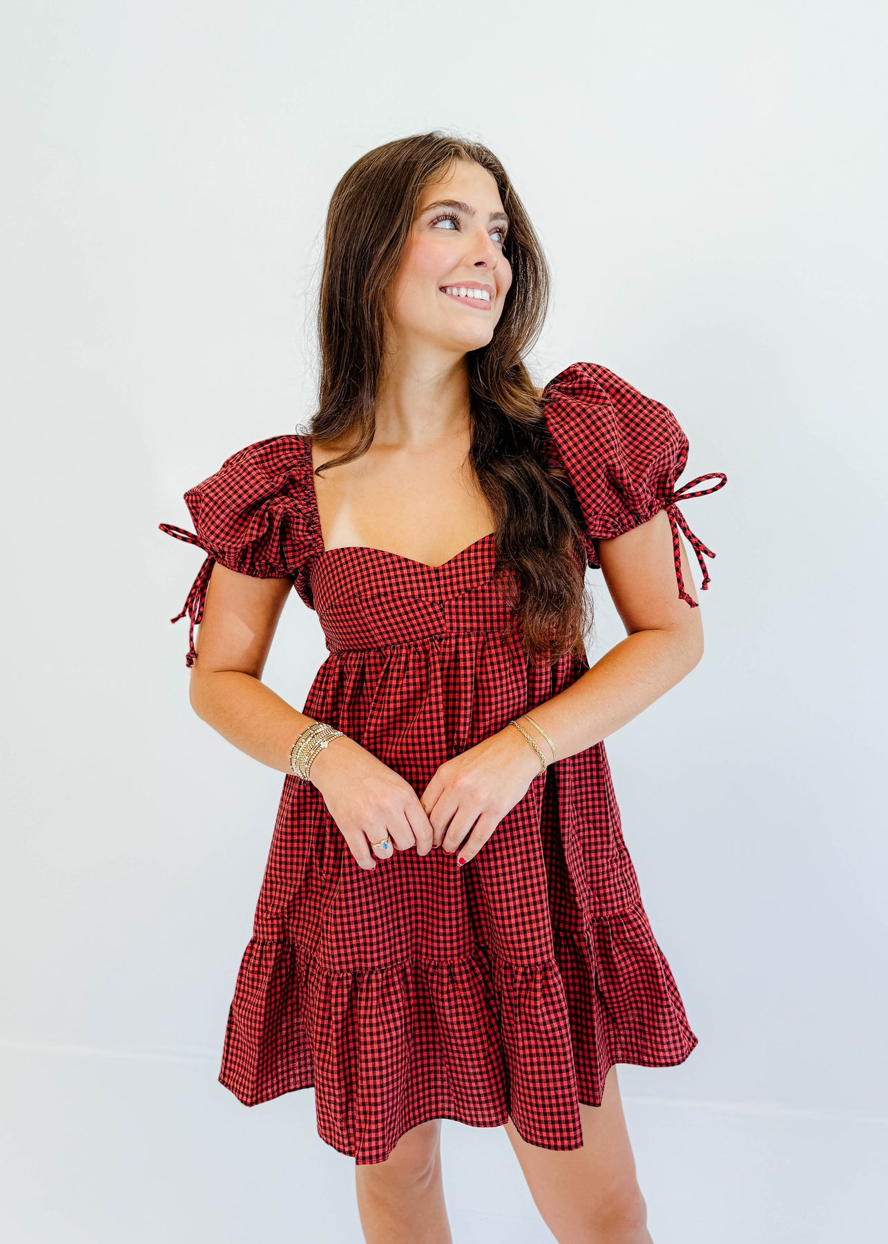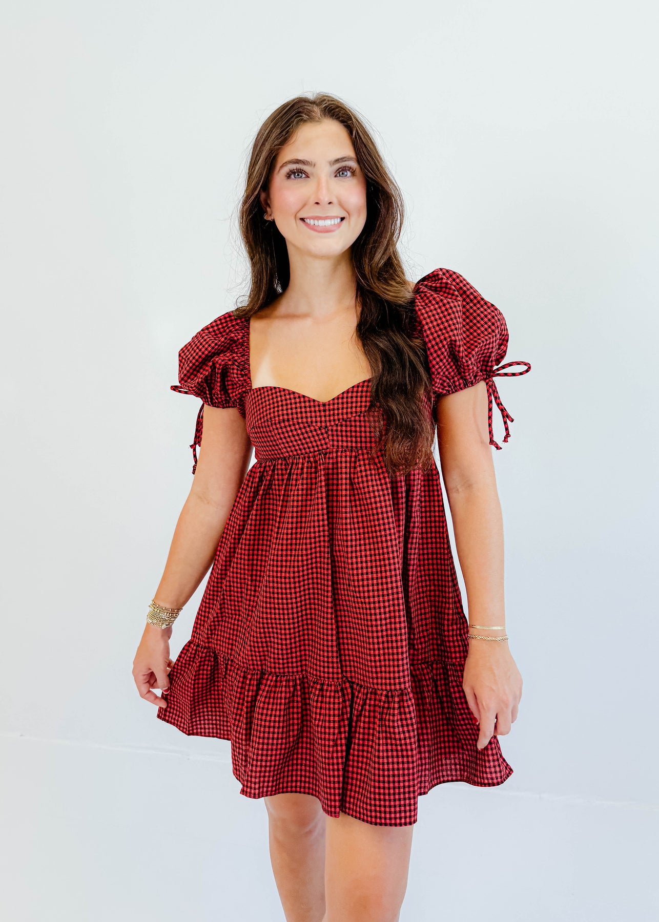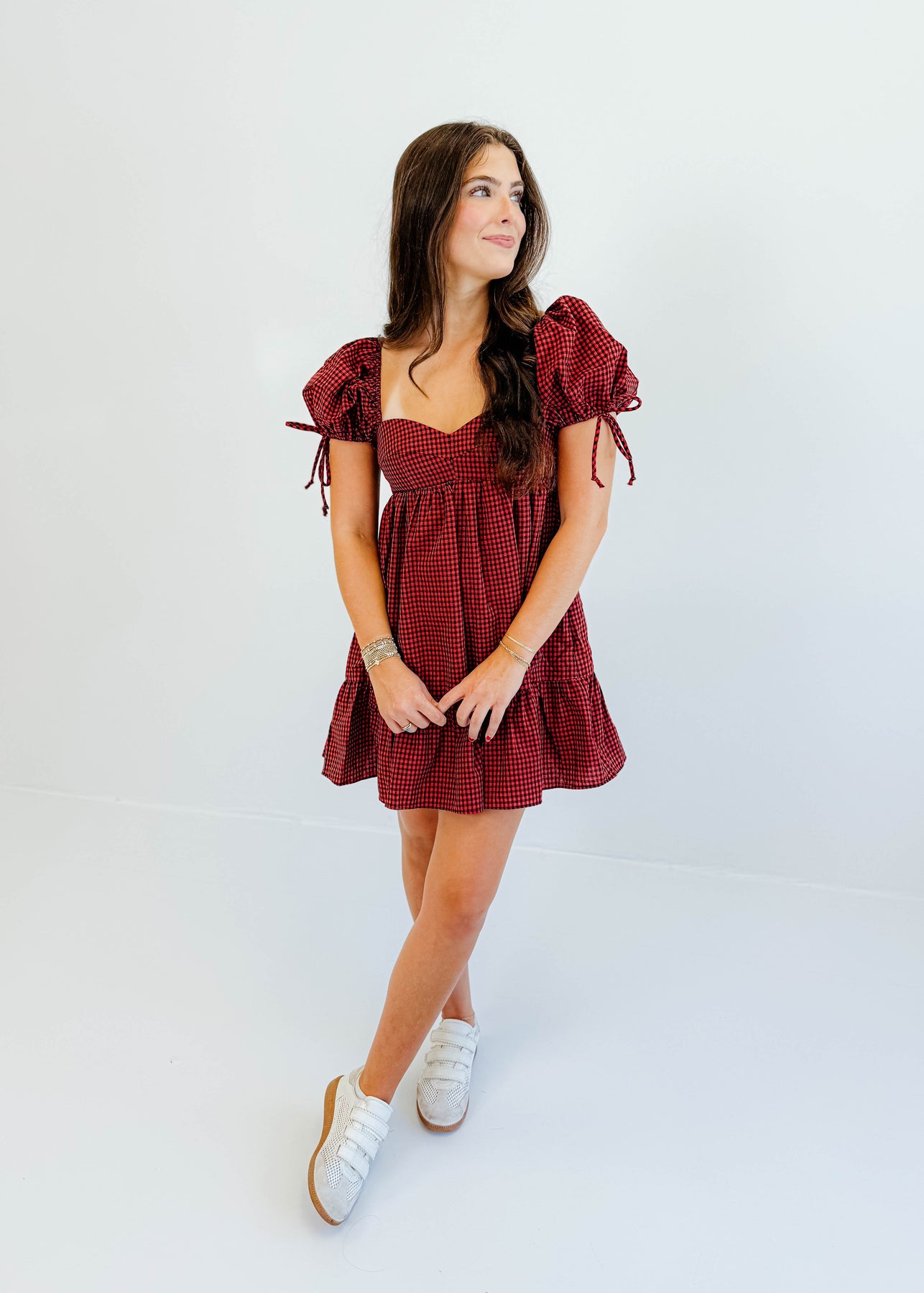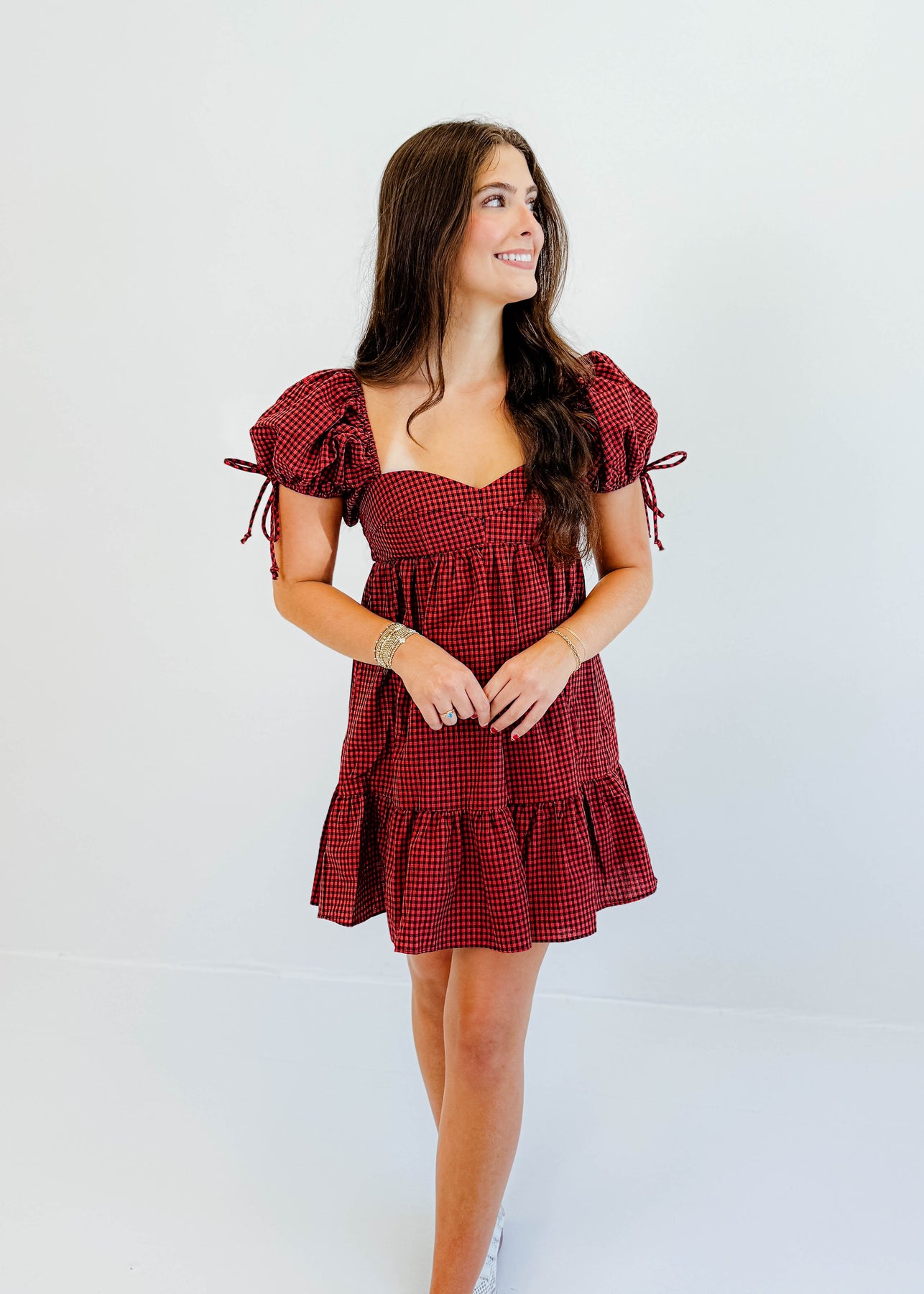 The Clara Gingham Babydoll Dress brings timeless charm with a playful twist. Its puff sleeves with delicate tie details frame a flattering sweetheart neckline, while the tiered skirt adds just the right amount of movement for any occasion. The classic gingham pattern gives it a nostalgic yet modern vibe, making it easy to style for casual days or dressed-up moments. Pair Clara with flats for an afternoon stroll or heels for a night out — she’s the kind of dress you’ll reach for again and again.